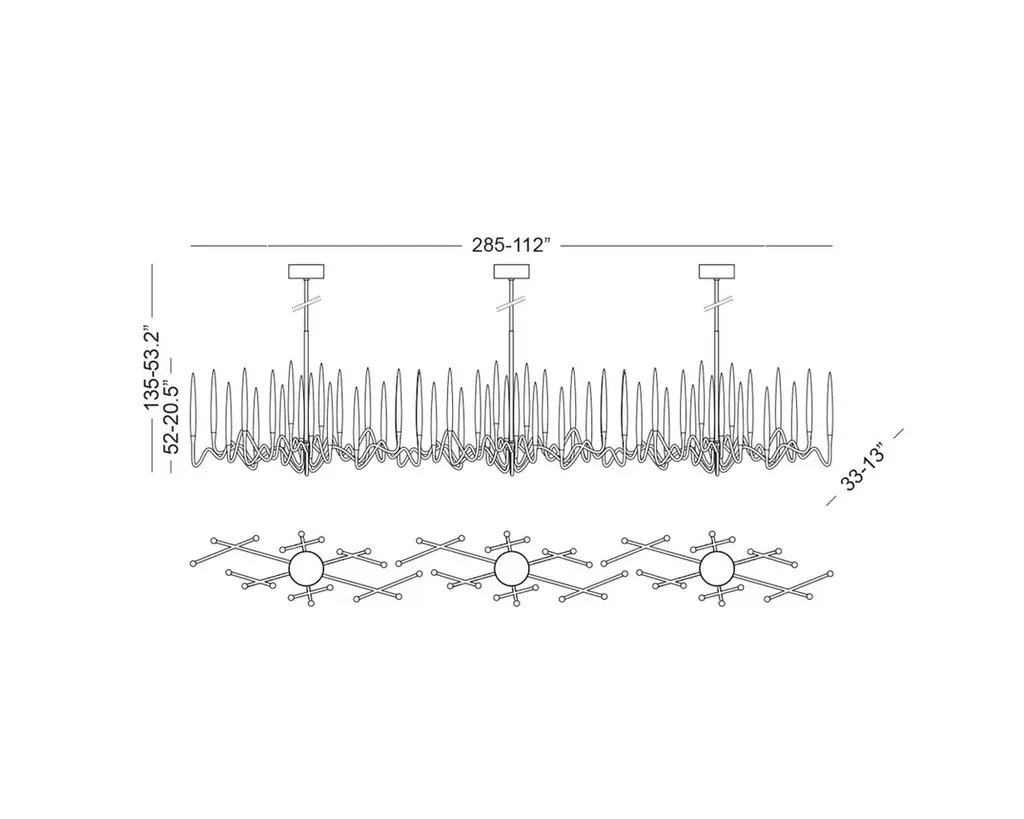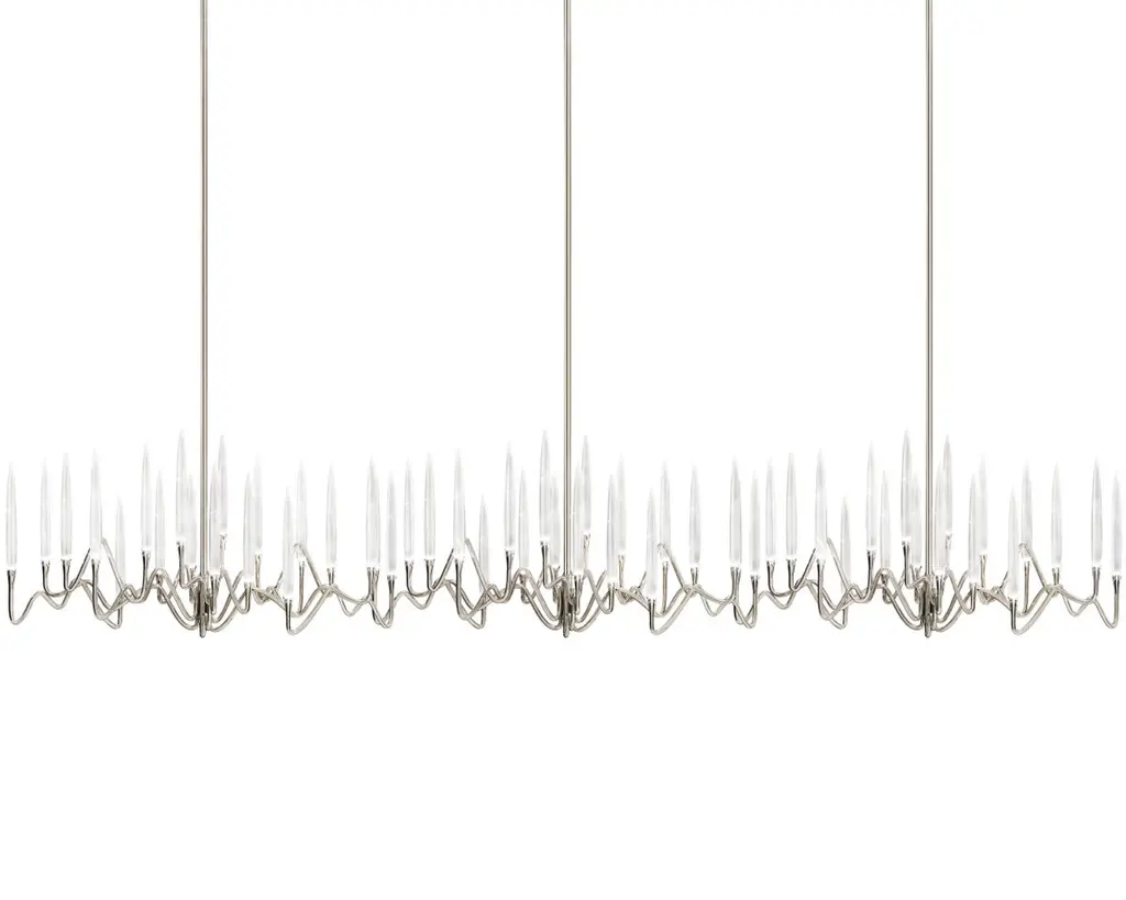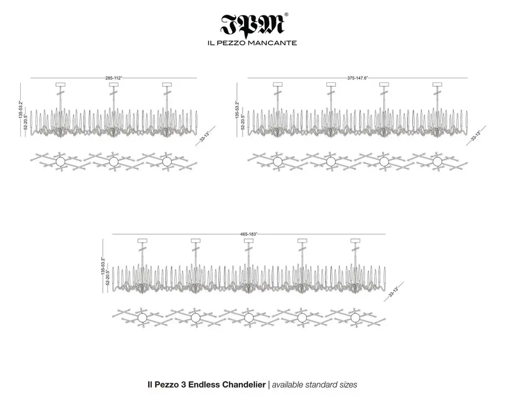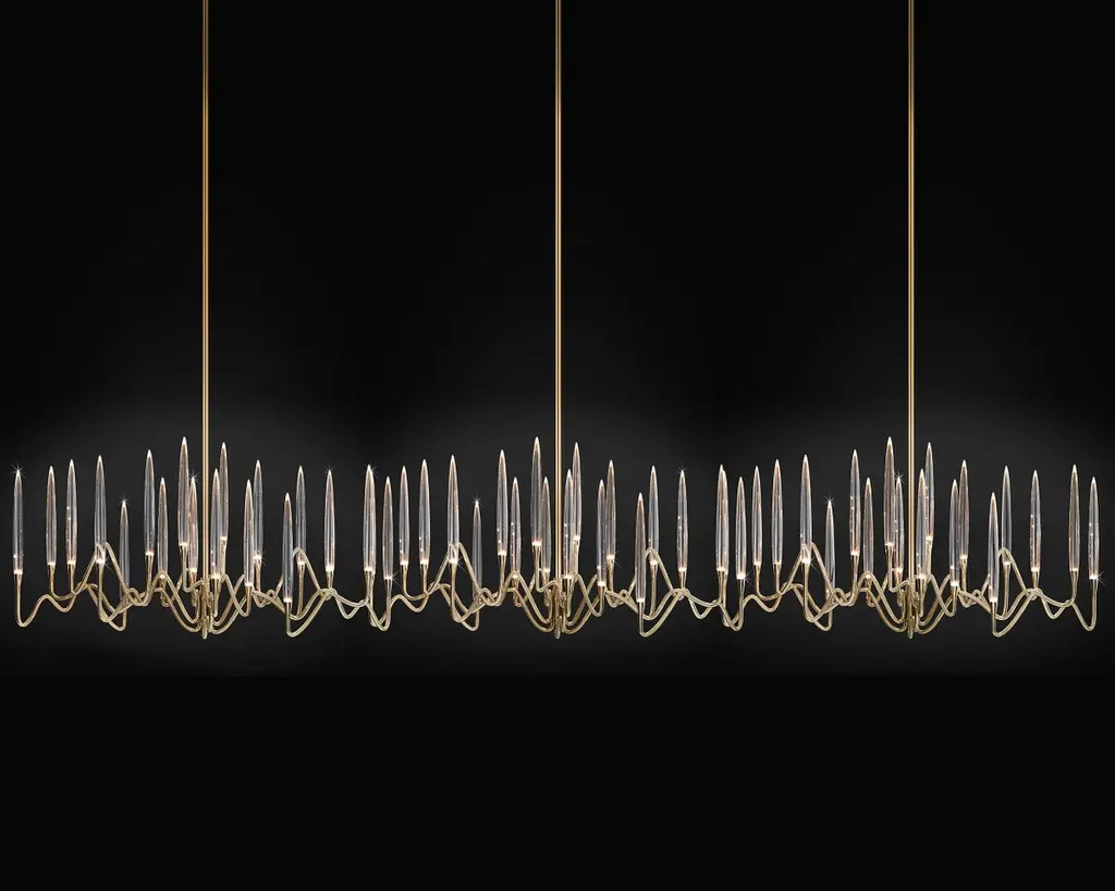 Inspired by Arabic calligraphic art and the icon of the classical candelabrum is Il Pezzo 3, a collection of lamps with a hand-forged brass structure and elegant “candles” crafted from hand blown crystal, according to the noble Tuscan artisan tradition. The candles are illuminated using the latest LED technology, creating a sophisticated and romantic light. Experiencing the exquisite craftsmanship of this piece, combined with highly advanced technology, is truly fascinating.Il Pezzo 3 Endless Chandelier is a modular suspension which can be repeated to create endless lengths!Notably, the lamp features a distinctive element, its “Missing Piece”(“Pezzo Mancante” in Italian): a small brass cylinder containing the serial number, guaranteeing its authenticity and individuality.Custom finishes are also available to suit every preference.All our masterpieces are meticulously crafted in our Atelier located in Florence, Italy, from a small team of people driven by a shared passion for quality and beauty. We constantly strive to create unparalleled works of art, where each piece is a testament to our commitment to craftsmanship and innovation.Structure: Hand carved brassFinish: GoldDiffusers: Solid crystalLight source: 2.700K LED, CRI>90, dimmable.Size: 285 x 33 x H 135 cm - 112" x 13" x H 53.2"ETL certified UL and CSA standards compliant.The standard overall height is 135 cm - 53.2". The stems are telescopic and it can be a little adjusted on site.The overall height can be custom made.