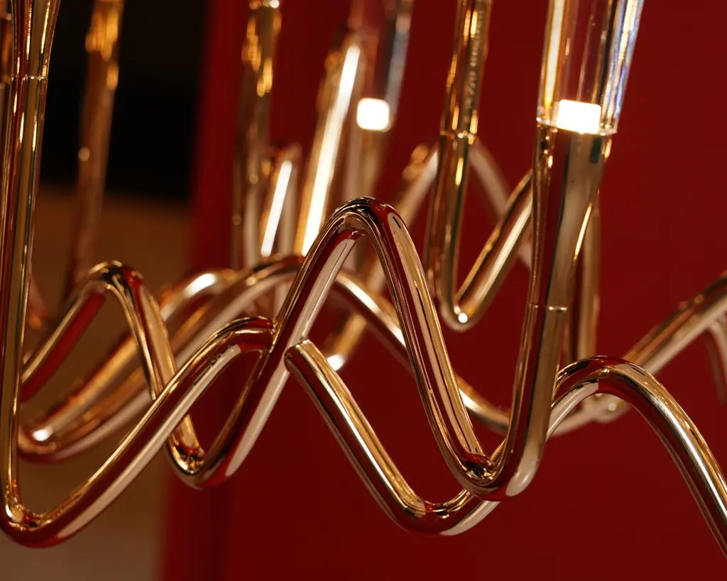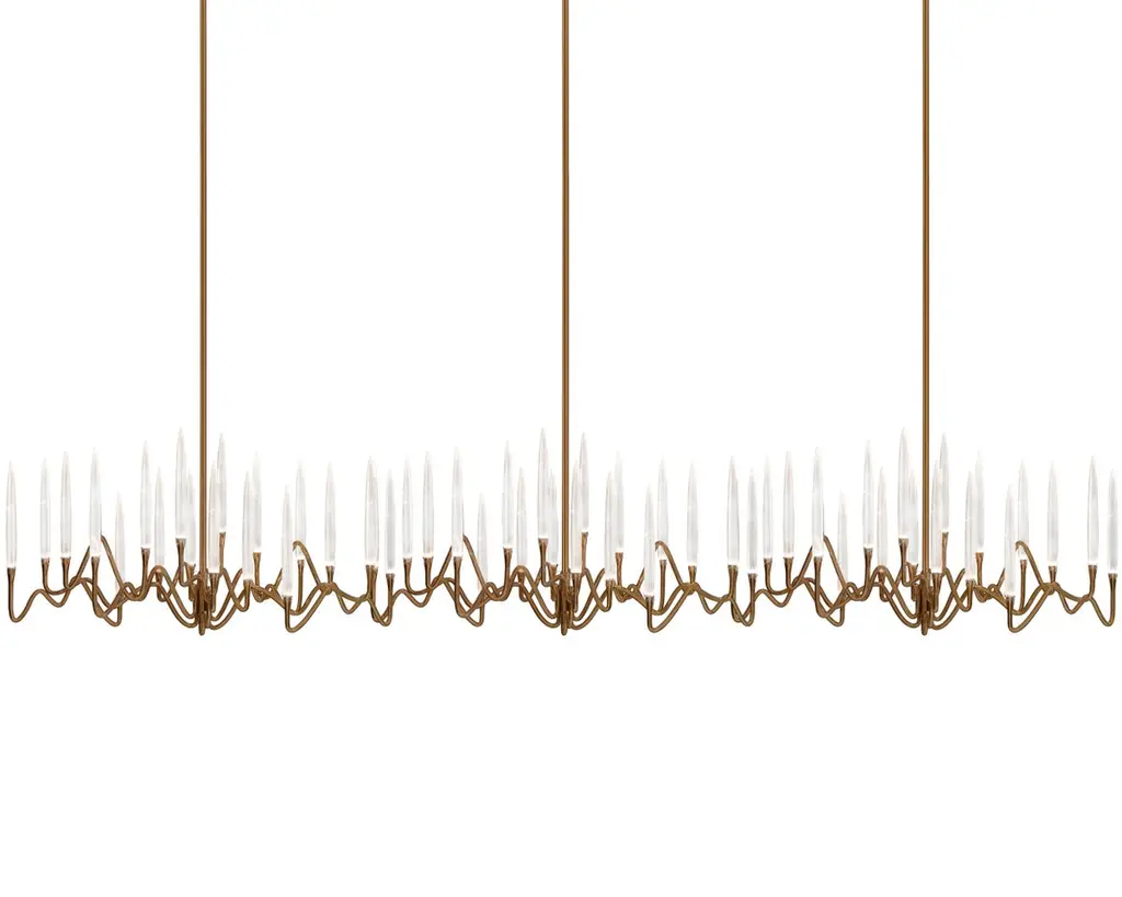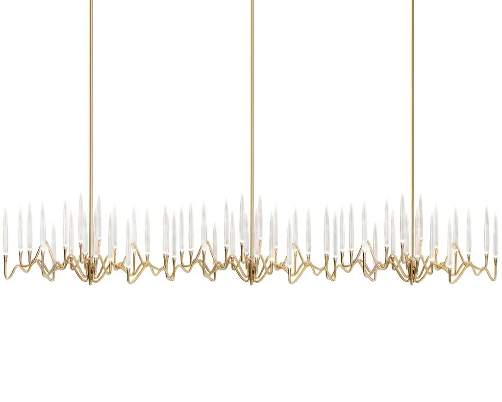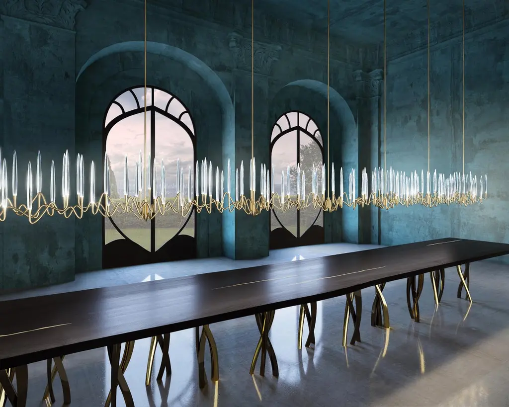 Inspired by Arabic calligraphic art and the icon of the classical candelabrum is Il Pezzo 3, a collection of lamps with a hand-forged brass structure and elegant “candles” crafted from hand blown crystal, according to the noble Tuscan artisan tradition. The candles are illuminated using the latest LED technology, creating a sophisticated and romantic light. Experiencing the exquisite craftsmanship of this piece, combined with highly advanced technology, is truly fascinating.Il Pezzo 3 Endless Chandelier is a modular suspension which can be repeated to create endless lengths!Notably, the lamp features a distinctive element, its “Missing Piece”(“Pezzo Mancante” in Italian): a small brass cylinder containing the serial number, guaranteeing its authenticity and individuality.Custom finishes are also available to suit every preference.All our masterpieces are meticulously crafted in our Atelier located in Florence, Italy, from a small team of people driven by a shared passion for quality and beauty. We constantly strive to create unparalleled works of art, where each piece is a testament to our commitment to craftsmanship and innovation.Structure: Hand carved brassFinish: Satin brassDiffusers: Solid crystalLight source: 2.700K LED, CRI>90, dimmable.Size: 285 x 33 x H 135 cm - 112" x 13" x H 53.2"ETL certified UL and CSA standards compliant.The standard overall height is 135 cm - 53.2". The stems are telescopic and it can be a little adjusted on site.The overall height can be custom made.