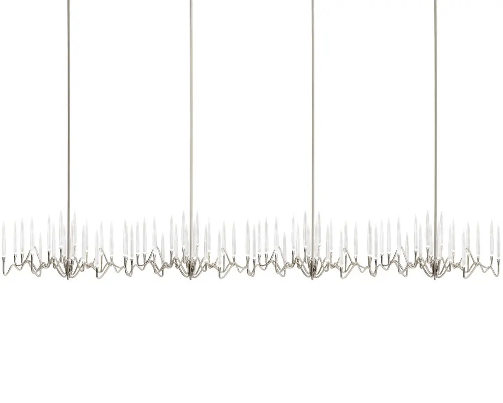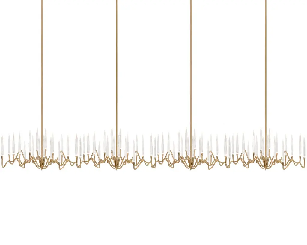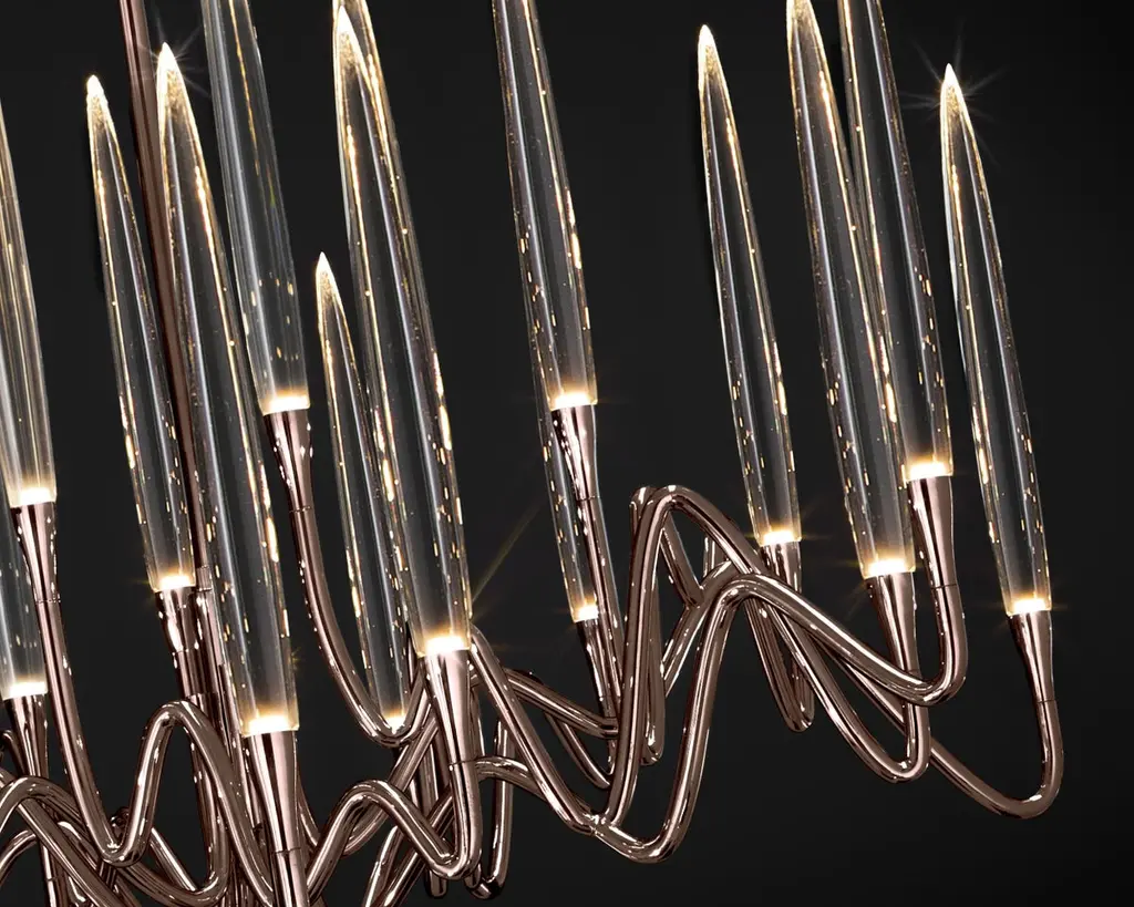 Inspired by Arabic calligraphic art and the icon of the classical candelabrum is Il Pezzo 3, a collection of lamps with a hand-forged brass structure and elegant “candles” crafted from hand blown crystal, according to the noble Tuscan artisan tradition. The candles are illuminated using the latest LED technology, creating a sophisticated and romantic light. Experiencing the exquisite craftsmanship of this piece, combined with highly advanced technology, is truly fascinating.Il Pezzo 3 Endless Chandelier is a modular suspension which can be repeated to create endless lengths!Notably, the lamp features a distinctive element, its “Missing Piece”(“Pezzo Mancante” in Italian): a small brass cylinder containing the serial number, guaranteeing its authenticity and individuality.Custom finishes are also available to suit every preference.All our masterpieces are meticulously crafted in our Atelier located in Florence, Italy, from a small team of people driven by a shared passion for quality and beauty. We constantly strive to create unparalleled works of art, where each piece is a testament to our commitment to craftsmanship and innovation.Structure: Hand carved brassFinish: BronzeDiffusers: Solid crystalLight source: 2.700K LED, CRI>90, dimmable.Size: 375 x 33 x H 135 cm - 147.6" x 13" x H 53.2"ETL certified UL and CSA standards compliant.The standard overall height is 135 cm - 53.2". The stems are telescopic and it can be a little adjusted on site.The overall height can be custom made.
