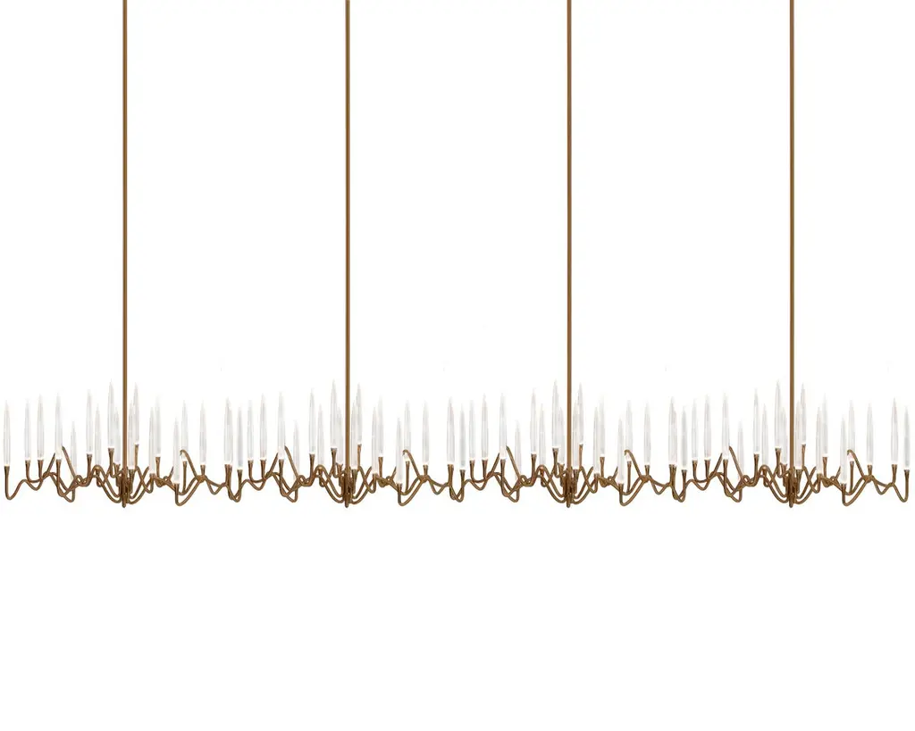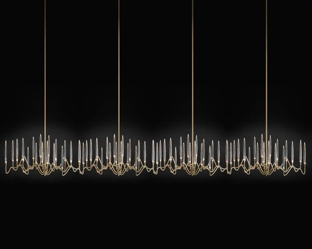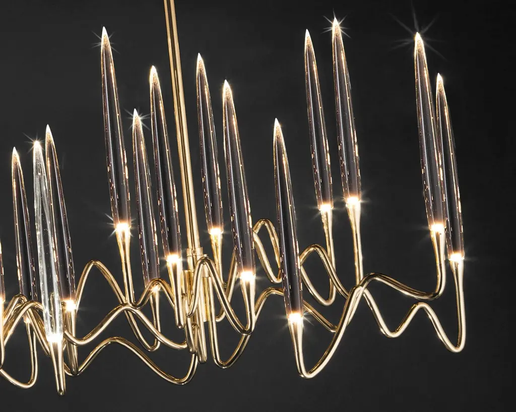 Inspired by Arabic calligraphic art and the icon of the classical candelabrum is Il Pezzo 3, a collection of lamps with a hand-forged brass structure and elegant “candles” crafted from hand blown crystal, according to the noble Tuscan artisan tradition. The candles are illuminated using the latest LED technology, creating a sophisticated and romantic light. Experiencing the exquisite craftsmanship of this piece, combined with highly advanced technology, is truly fascinating.Il Pezzo 3 Endless Chandelier is a modular suspension which can be repeated to create endless lengths!Notably, the lamp features a distinctive element, its “Missing Piece”(“Pezzo Mancante” in Italian): a small brass cylinder containing the serial number, guaranteeing its authenticity and individuality.Custom finishes are also available to suit every preference.All our masterpieces are meticulously crafted in our Atelier located in Florence, Italy, from a small team of people driven by a shared passion for quality and beauty. We constantly strive to create unparalleled works of art, where each piece is a testament to our commitment to craftsmanship and innovation.Structure: Hand carved brassFinish: GoldDiffusers: Solid crystalLight source: 2.700K LED, CRI>90, dimmable.Size: 375 x 33 x H 135 cm - 147.6" x 13" x H 53.2"ETL certified UL and CSA standards compliant.The standard overall height is 135 cm - 53.2". The stems are telescopic and it can be a little adjusted on site.The overall height can be custom made.