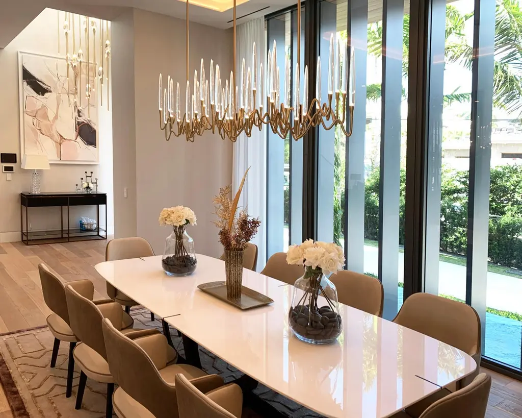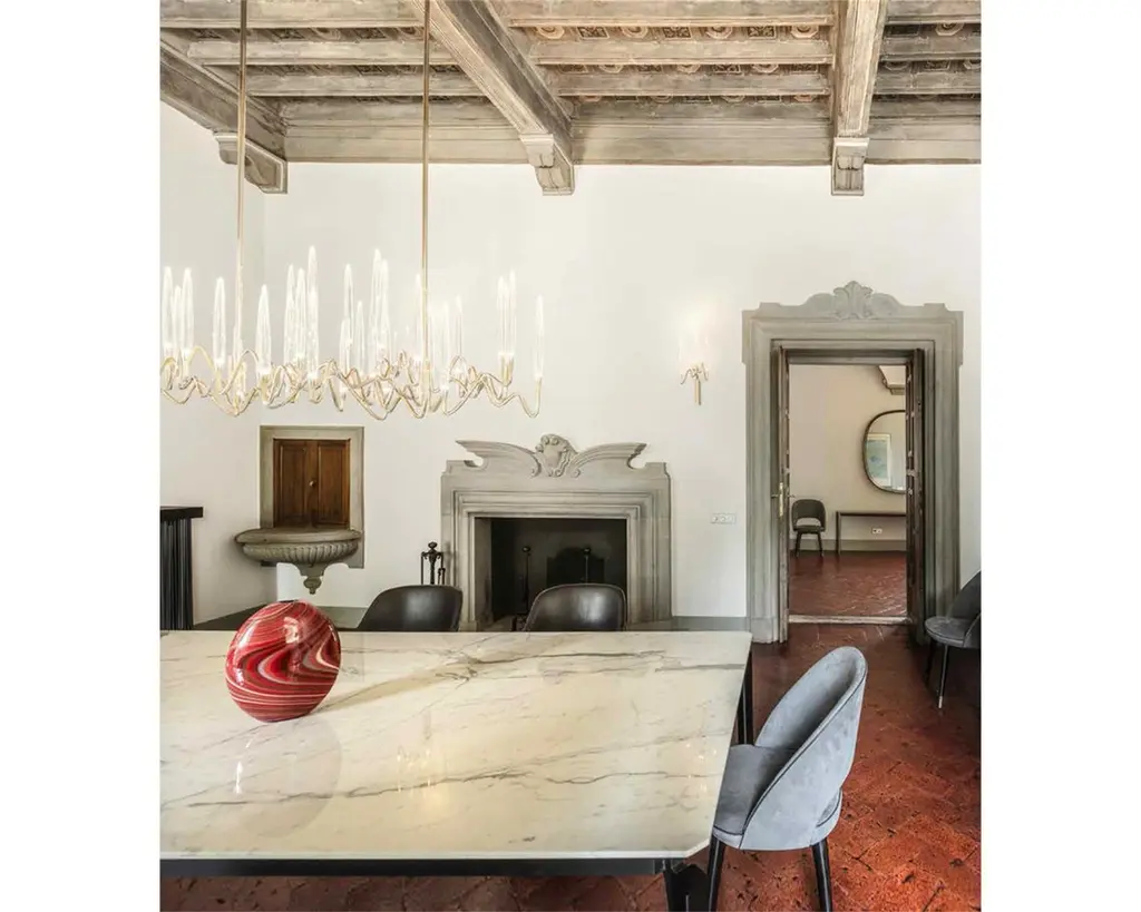 Inspired by Arabic calligraphic art and the icon of the classical candelabrum is Il Pezzo 3, a collection of lamps with a hand-forged brass structure and elegant “candles” crafted from hand blown crystal, according to the noble Tuscan artisan tradition. The candles are illuminated using the latest LED technology, creating a sophisticated and romantic light. Experiencing the exquisite craftsmanship of this piece, combined with highly advanced technology, is truly fascinating.Notably, the lamp features a distinctive element, its “Missing Piece”(“Pezzo Mancante” in Italian): a small brass cylinder containing the serial number, guaranteeing its authenticity and individuality.Custom finishes are also available to suit every preference.All our masterpieces are meticulously crafted in our Atelier located in Florence, Italy, from a small team of people driven by a shared passion for quality and beauty. We constantly strive to create unparalleled works of art, where each piece is a testament to our commitment to craftsmanship and innovation.Structure: hand-carved brassFinish: satin brassDiffusers: solid crystalLight source: 2.700K LED, CRI>90, dimmable.Size: 150 cm long, 59" long.ETL certified UL and CSA standards compliant.The standard overall height is 135 cm - 53.2". The stems are telescopic and it can be a little adjusted on site. The overall height can be custom made.