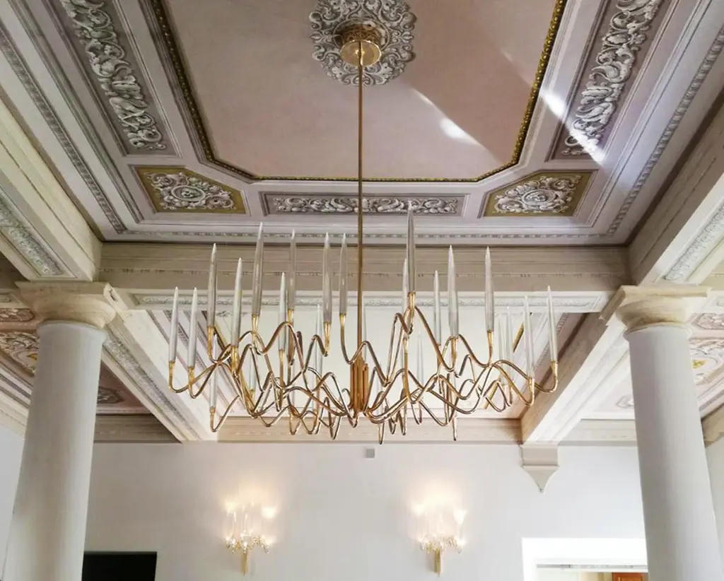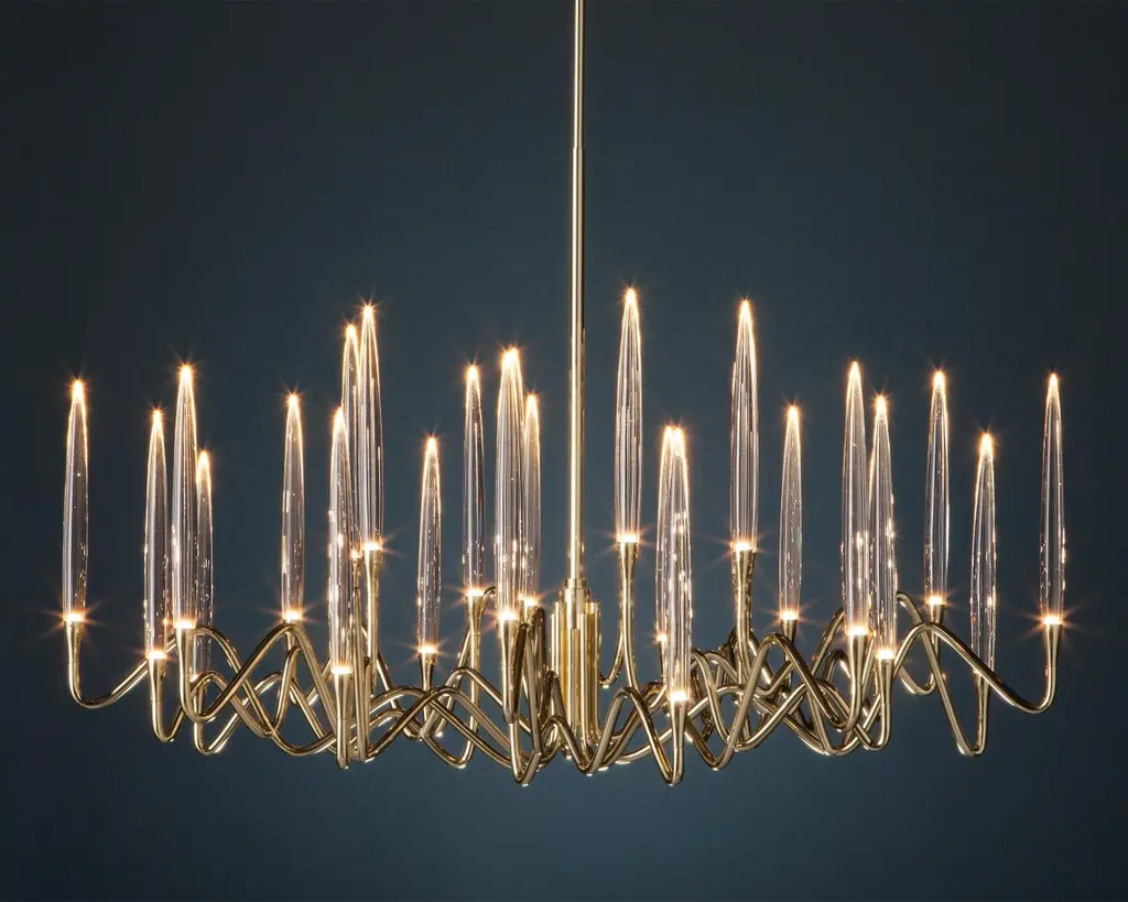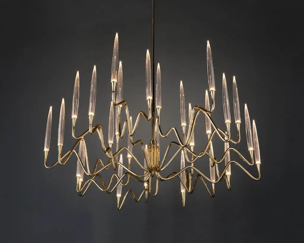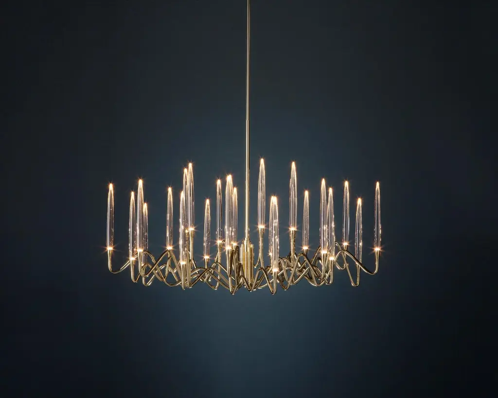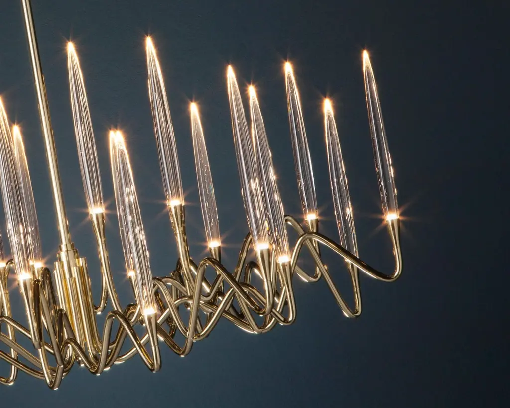 Inspired by Arabic calligraphic art and the icon of the classical candelabrum is Il Pezzo 3, a collection of lamps with a hand-forged brass structure and elegant “candles” crafted from hand blown crystal, according to the noble Tuscan artisan tradition. The candles are illuminated using the latest LED technology, creating a sophisticated and romantic light. Experiencing the exquisite craftsmanship of this piece, combined with highly advanced technology, is truly fascinating.Notably, the lamp features a distinctive element, its “Missing Piece”(“Pezzo Mancante” in Italian): a small brass cylinder containing the serial number, guaranteeing its authenticity and individuality.Custom finishes are also available to suit every preference.All our masterpieces are meticulously crafted in our Atelier located in Florence, Italy, from a small team of people driven by a shared passion for quality and beauty. We constantly strive to create unparalleled works of art, where each piece is a testament to our commitment to craftsmanship and innovation.Structure: Hand-carved brassFinish: GoldDiffusers: Solid crystalLight source: 2.700K LED, CRI>90, dimmableSize: diameter 120 cm - 47.2".ETL certified UL and CSA standards compliant.The standard overall height is 135 cm - 53.2". The stem is telescopic and it can be a little adjusted on site. The overall height can be custom made.