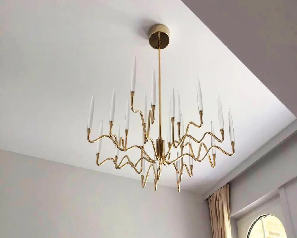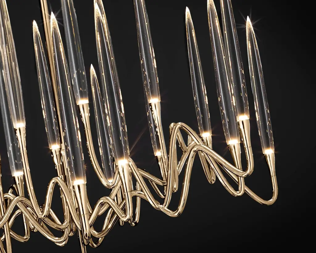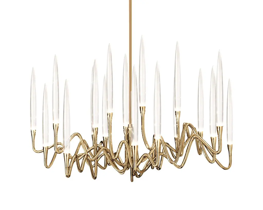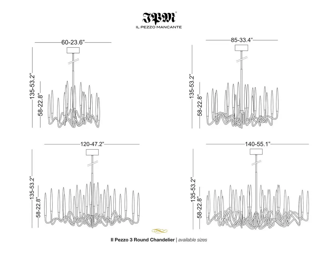 Inspired by Arabic calligraphic art and the icon of the classical candelabrum is Il Pezzo 3, a collection of lamps with a hand-forged brass structure and elegant “candles” crafted from hand blown crystal, according to the noble Tuscan artisan tradition. The candles are illuminated using the latest LED technology, creating a sophisticated and romantic light. Experiencing the exquisite craftsmanship of this piece, combined with highly advanced technology, is truly fascinating.Notably, the lamp features a distinctive element, its “Missing Piece”(“Pezzo Mancante” in Italian): a small brass cylinder containing the serial number, guaranteeing its authenticity and individuality.Custom finishes are also available to suit every preference.All our masterpieces are meticulously crafted in our Atelier located in Florence, Italy, from a small team of people driven by a shared passion for quality and beauty. We constantly strive to create unparalleled works of art, where each piece is a testament to our commitment to craftsmanship and innovation.Structure: hand-carved brassFinish: satin brassDiffusers: solid crystalLight source: 2.700K LED, CRI>90, dimmableSize: diameter 85 cm - 33.4".ETL certified UL and CSA standards compliant.The standard overall height is 135 cm - 53.2". The stem is telescopic and it can be a little adjusted on site. The overall height can be custom made.