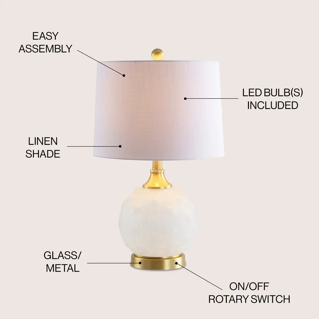 The solid glass base of this charming table lamp featured a polka-dotted texture reminiscent of old fashioned milk glass. When paired with brass, the combination is both cute and classic. Topped with a linen drum shade and matching finial, this lamp is neutral in color but stands out with style. Features:Dimensions:About us:You see a lamp.We see a decorative work of art.A perfectly curved shade casts a dramatic shadow on a floor. A silk cord you never want to hide. LED lightbulbs: as easy on the environment as they are on the eyes. The JONATHAN Y Lighting collection considers every detail from impeccably sourced materials to designer styling. And our prices are so attractive, we've transformed a functional necessity into a fashion accessory.JONATHAN Y Lighting - a fashion revolution in home decor.
