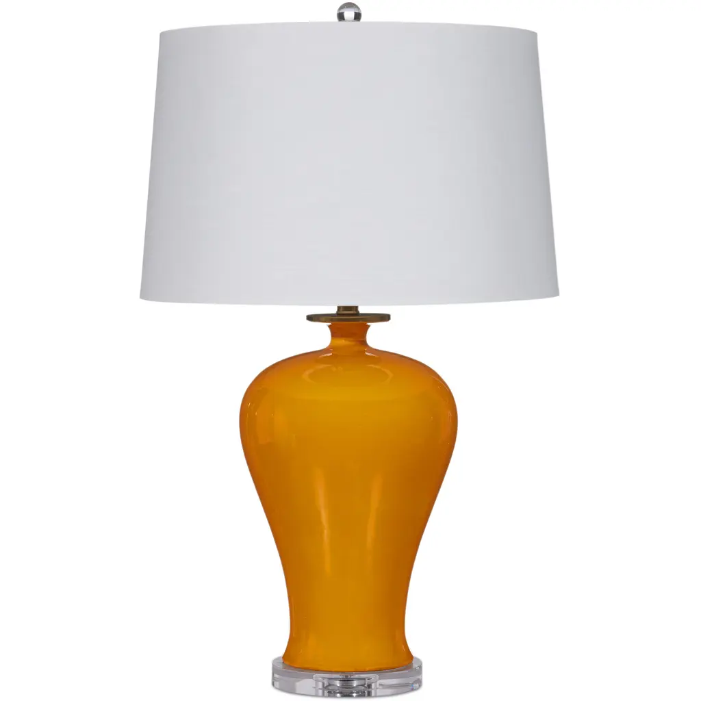 The Imperial Yellow Table Lamp has its roots far in the past. The Imperial label is apropos for the porcelain vase-shaped body because this piece is made of clay sourced from the area surrounding the kilns that produced objects for the royal estate during the heyday of the dynasties. The formulas to achieve the particular yellow on this lamps surface is a secret one guarded by ceramicist families devoted to the single color. The base and finial are made of optic crystal and the metal has a natural brass finish.