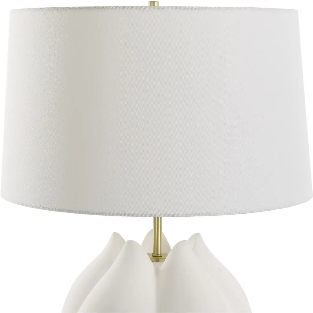 Inspired By Budding Flowers, The In Bloom Table Lamp Features A Porcelain Body With Subtle Texture, Finished In A Chalk White Glaze Paired With Lightly Antiqued Brass Plated Details. The Tapered Round Hardback Shade Completes The Piece In A Casual White Linen Fabric.