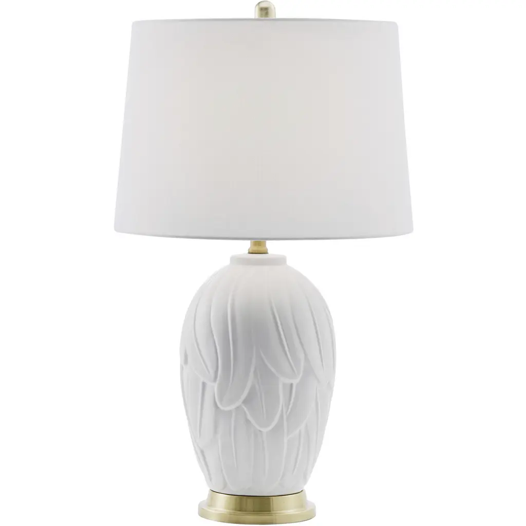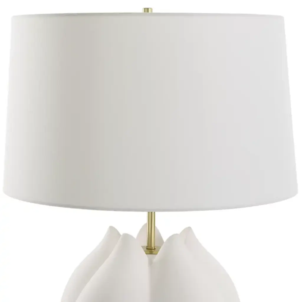 Drawing inspiration from budding flowers, the In Bloom Table Lamp from Uttermost showcases a porcelain body with delicate texture, finished in a charming chalk-white glaze, complemented by lightly antiqued brass plated details. Its tapered round hardback shade, crafted from casual white linen fabric, completes the piece with understated elegance. Illuminate your space with this lamp, merging organic inspiration with refined craftsmanship to create a sophisticated lighting accent for any room.