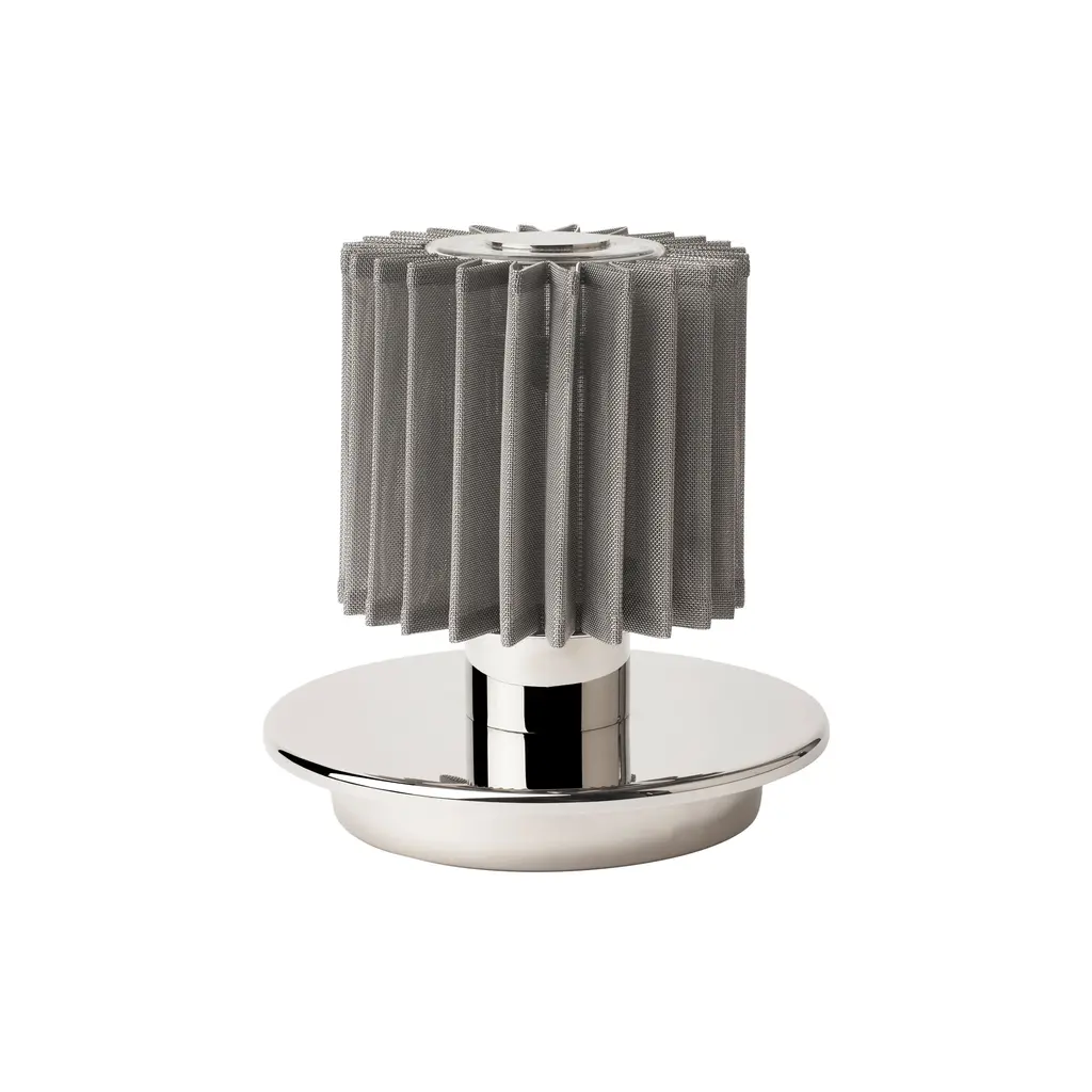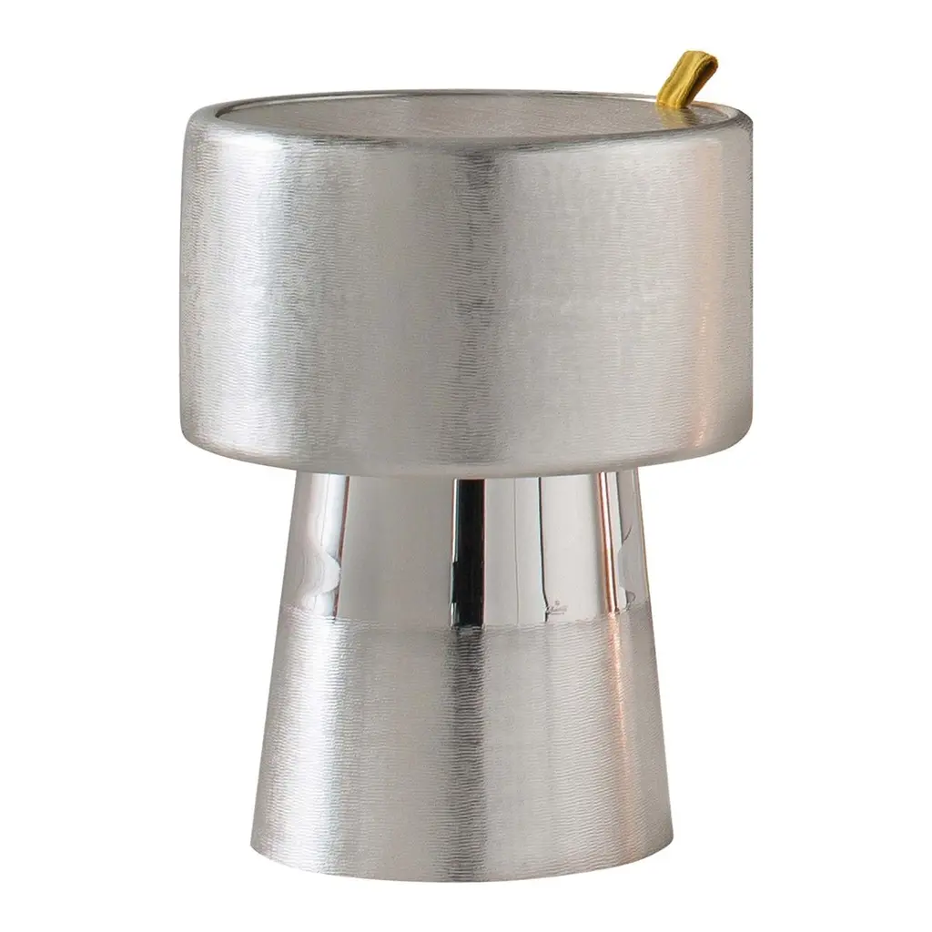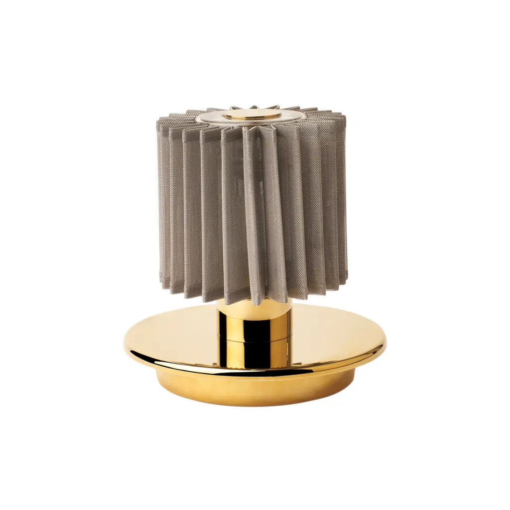 Cordless and portable, In The Sun's battery-operated table version features a 5-position switch for ascending levels of light. Architect-designers Dominique Perrault and Gaëlle Lauriot-Prévos upend the order of the series' characteristic elements, with the gleaming metal plate at the base and the diffuser with its integrated LED placed above. In gleaming metallic in homage to France's Louis XIV aka the Sun King, it's perfect on a low surface, a sideboard or even on the dining table. Easily recharged via the included Micro-USB-C cable for 9 to 17 hours of use depending on intensity.