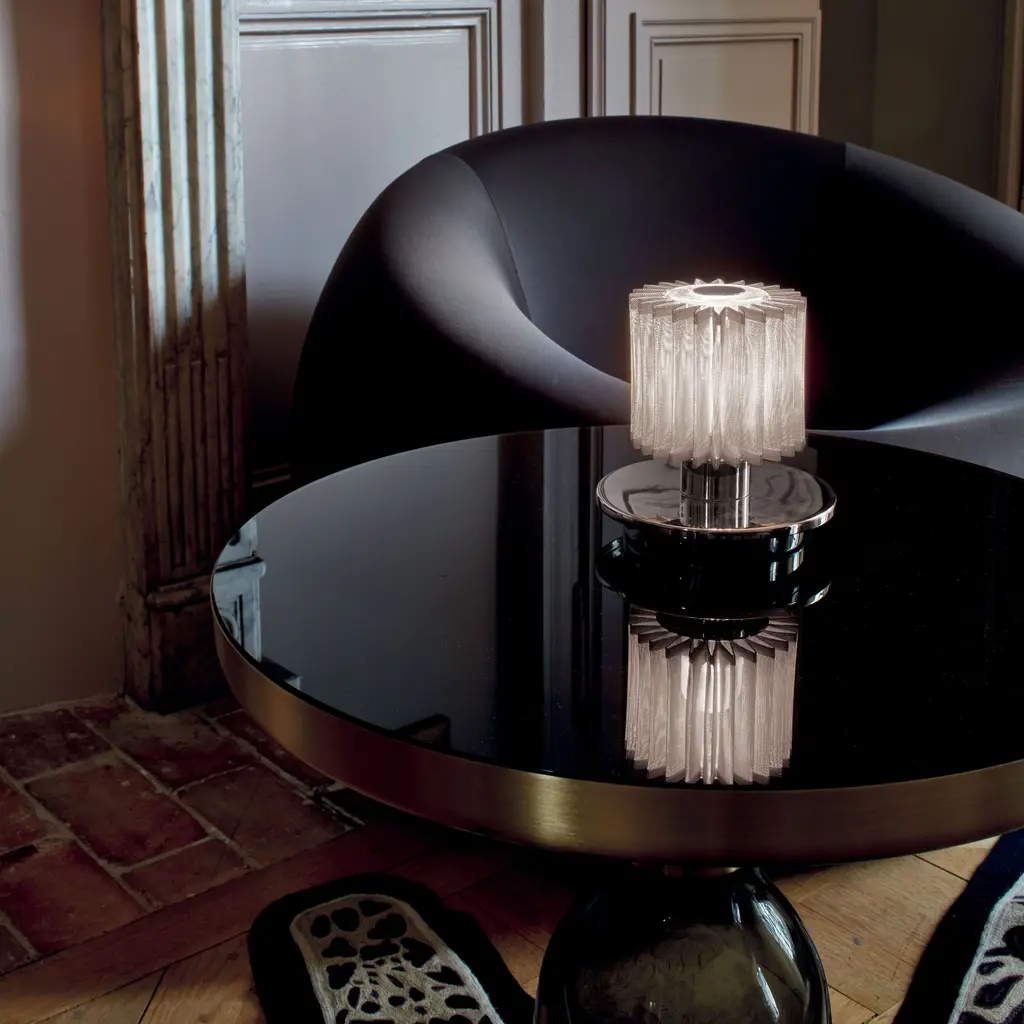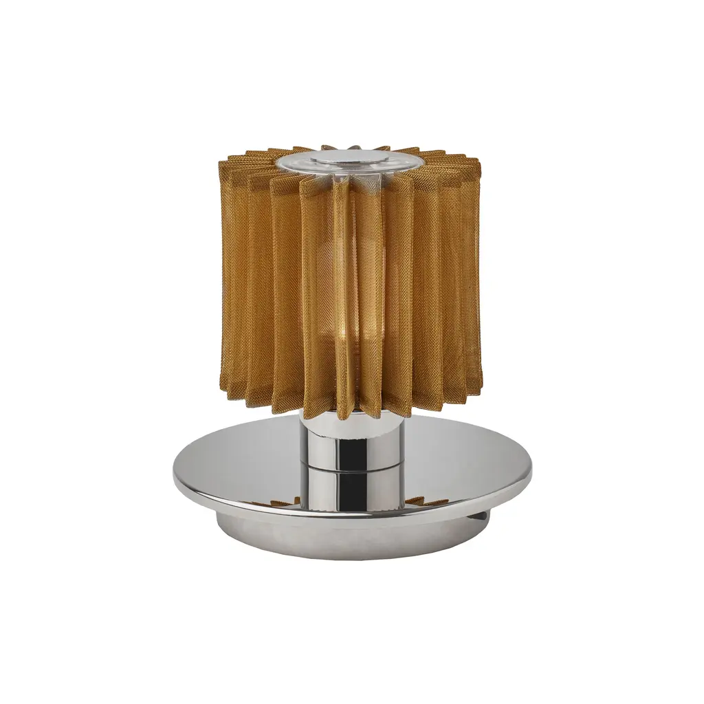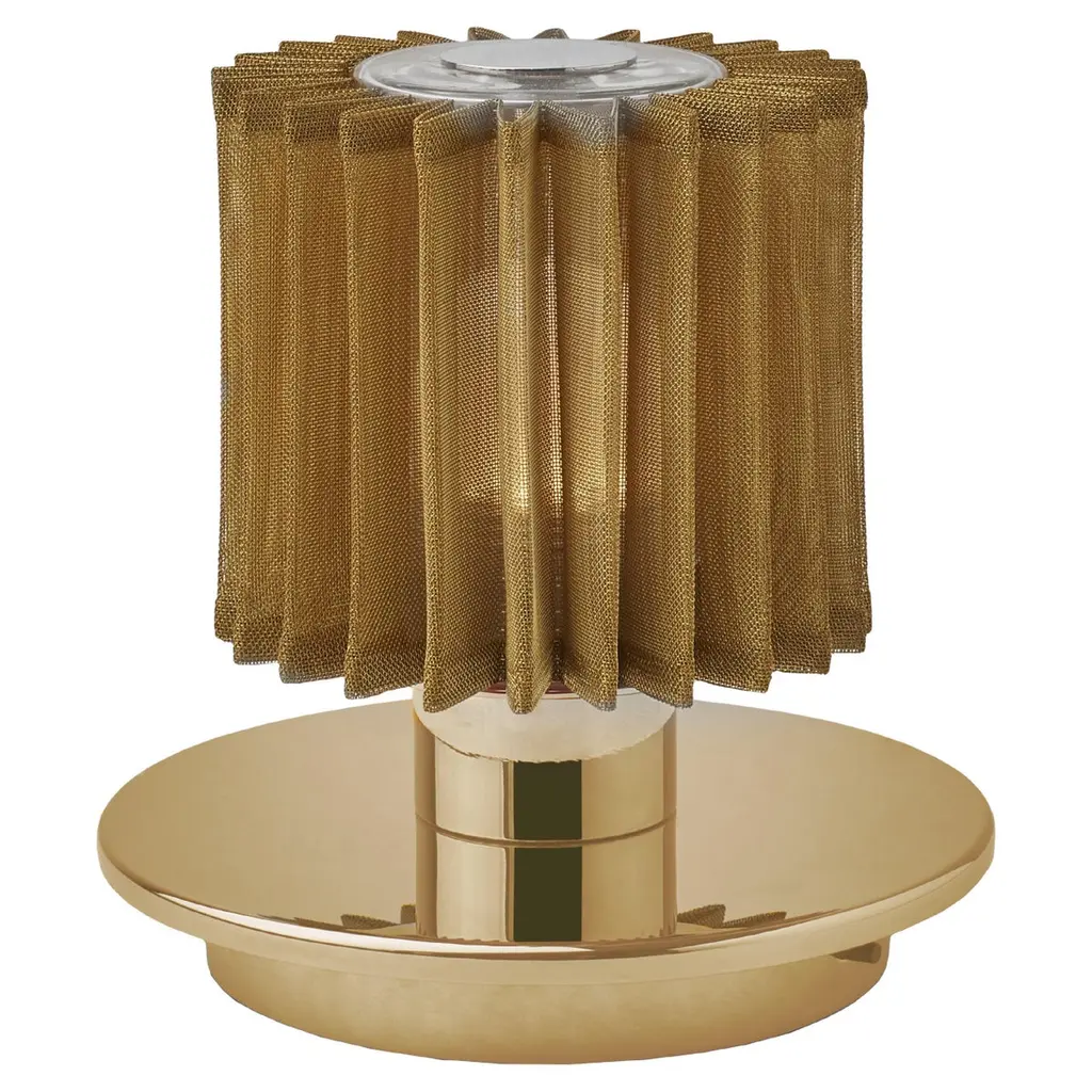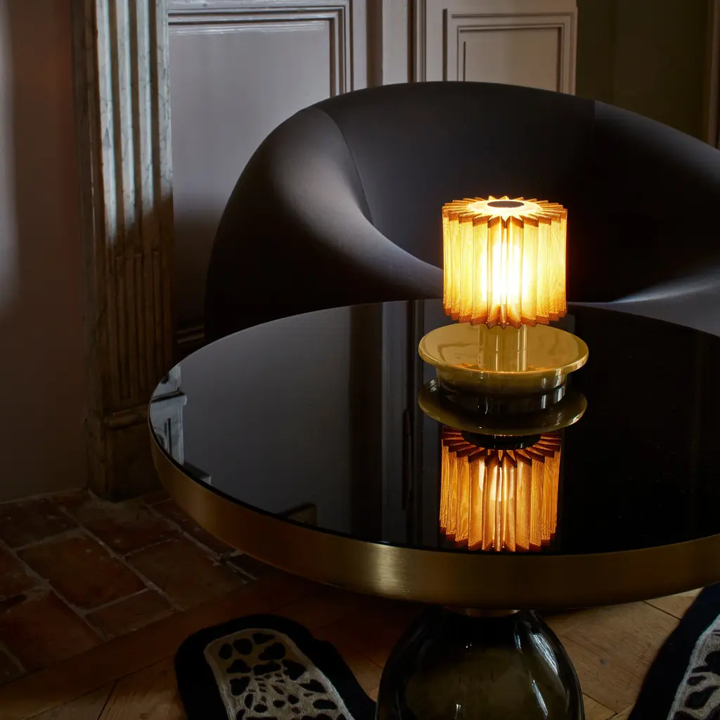 Cordless and portable, In The Sun's battery-operated table version features a 5-position switch for ascending levels of light. Architect-designers Dominique Perrault and Gaëlle Lauriot-Prévos upend the order of the series' characteristic elements, with the gleaming metal plate at the base and the diffuser with its integrated LED placed above. In gleaming metallic in homage to France's Louis XIV aka the Sun King, it's perfect on a low surface, a sideboard or even on the dining table. Easily recharged via the included Micro-USB-C cable for 9 to 17 hours of use depending on intensity.