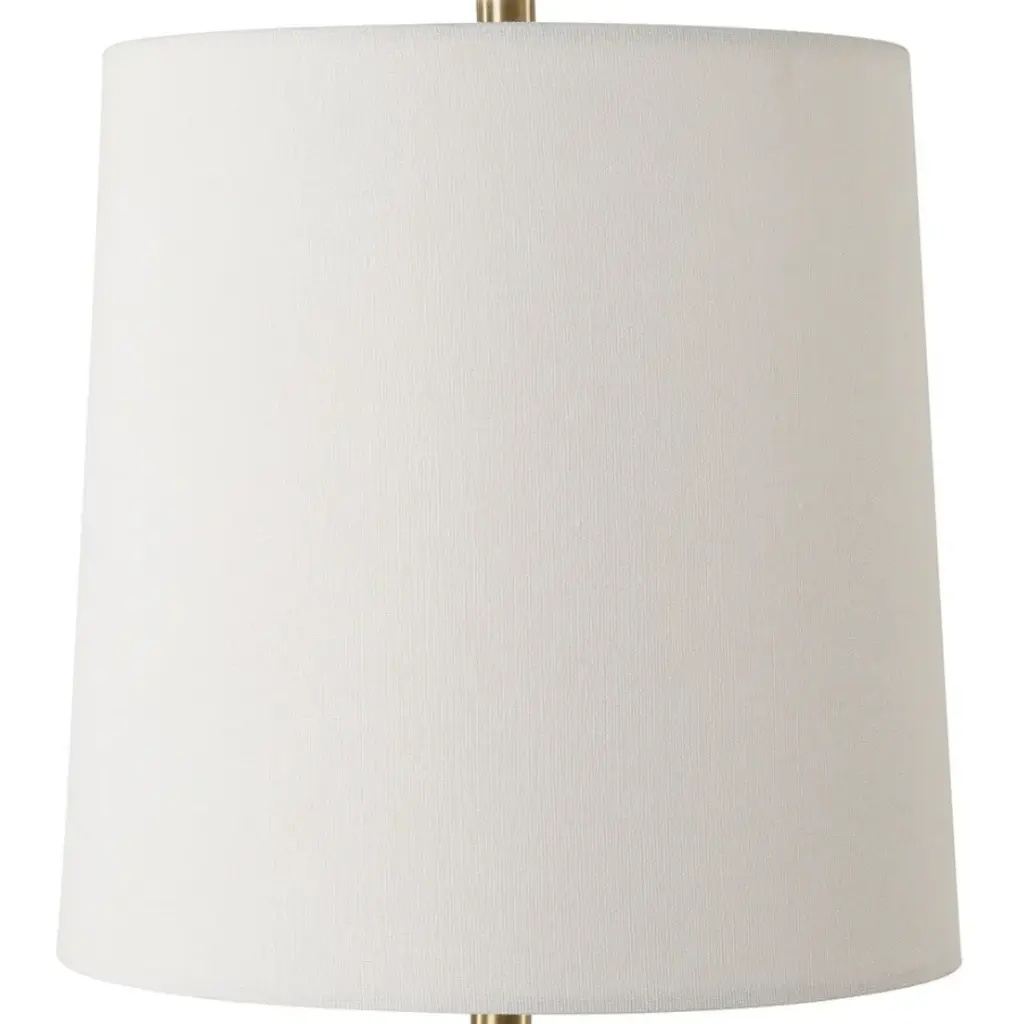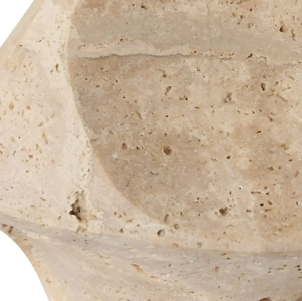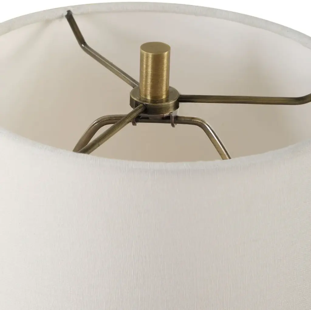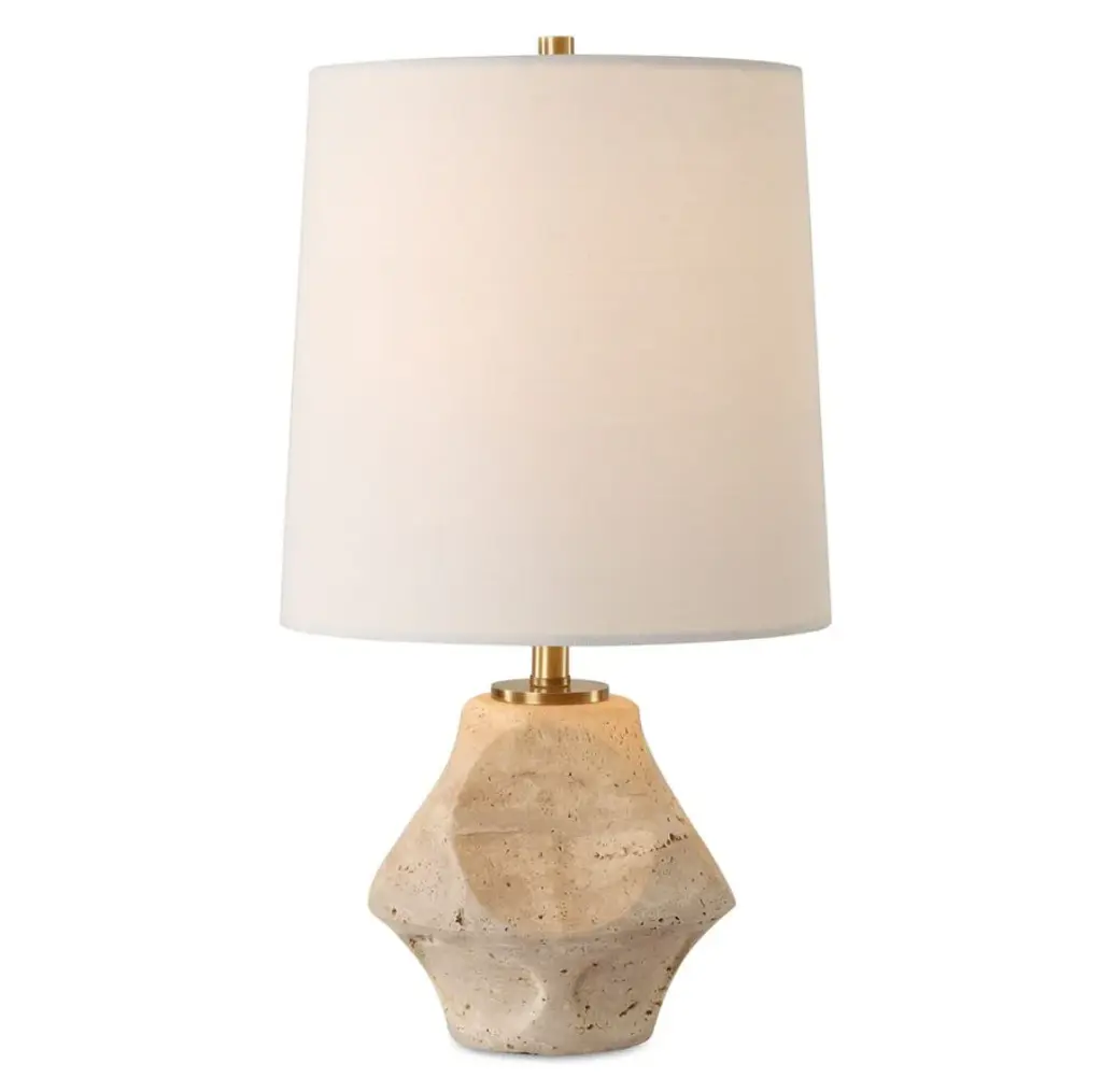 Featuring a travertine base with plated antique brass accents and a tapered round white linen shade, this accent lamp perfectly combines sophistication and natural elements.