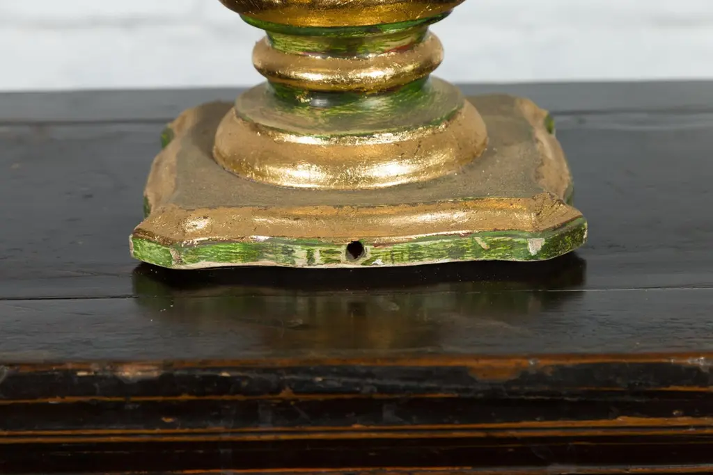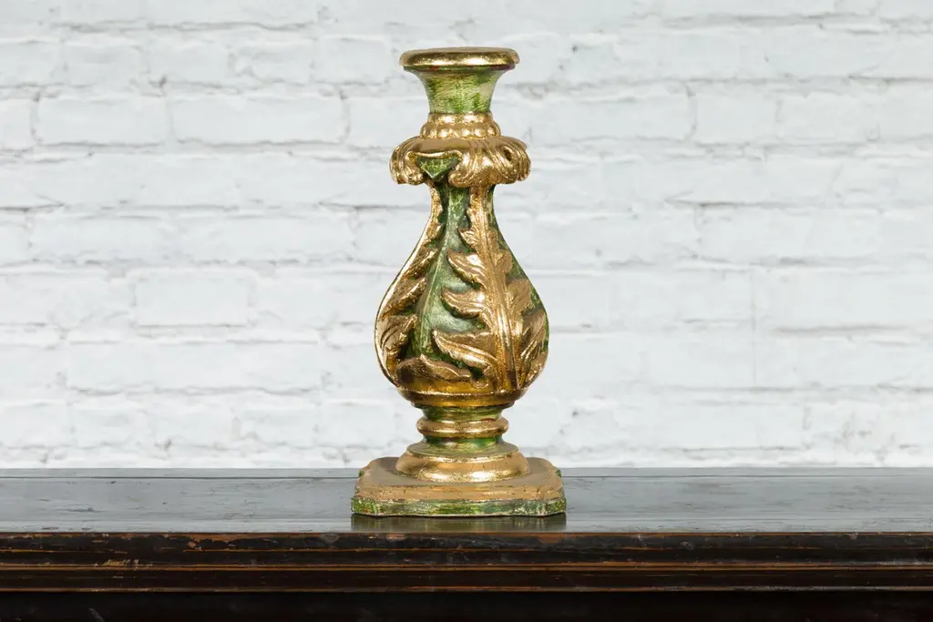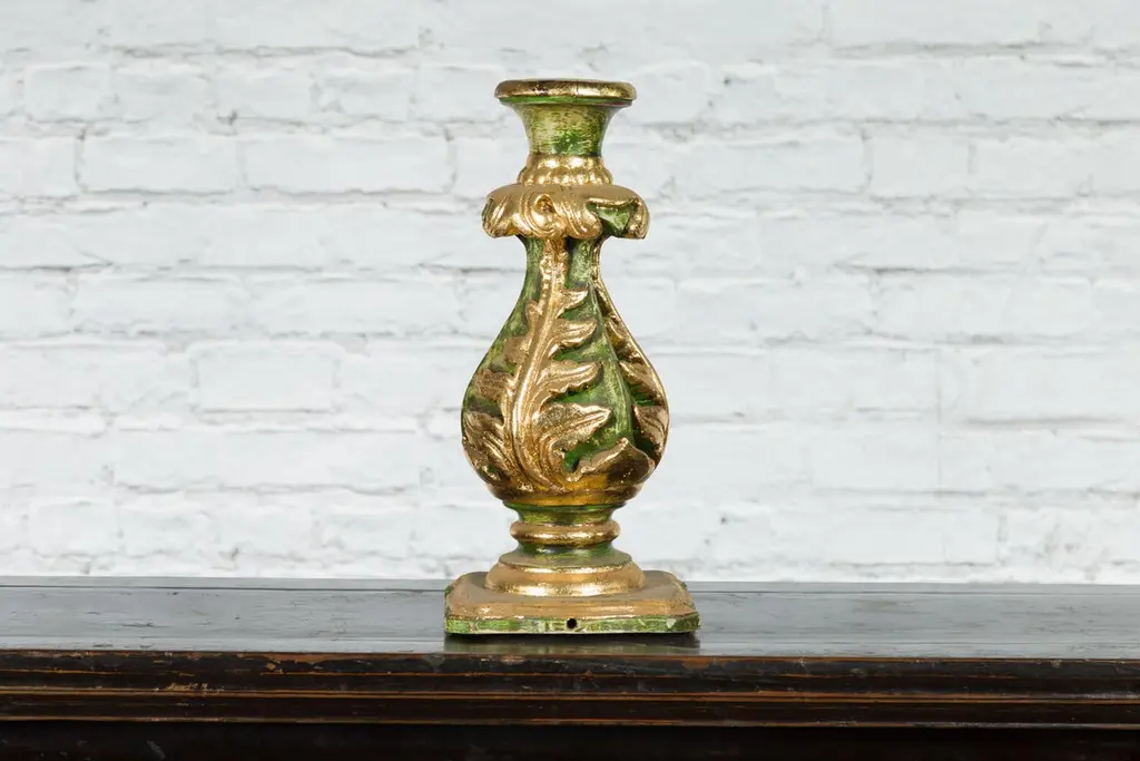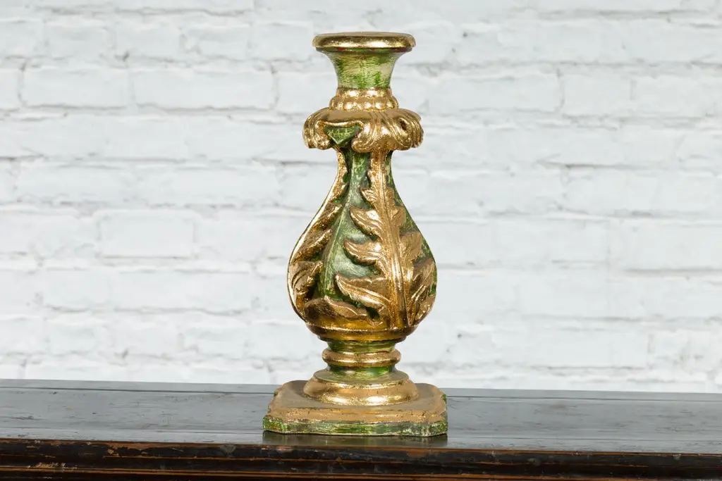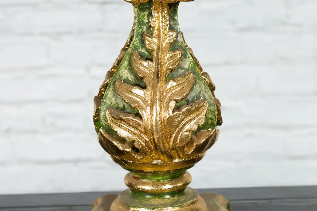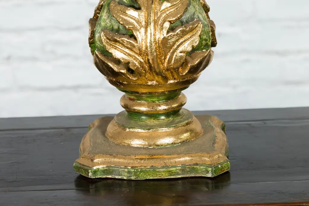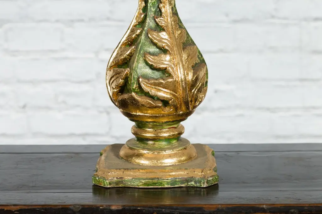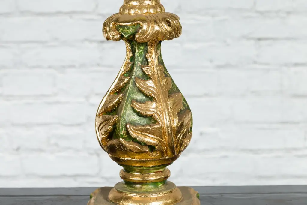 A vintage Indian green painted and parcel gilt wooden finial from the mid 20th century with carved acanthus leaves, pre-drilled to be made into a table lamp. Created in India during the Midcentury period, this finial attracts our immediate attention with its elegant lines and complimenting colors. Painted in a distressed green contrasted by golden tones, the finial is made of a turned body carved with exquisite acanthus leaves scrolling all the way up to the neck. Raised on a square-shaped serpentine base with canted corners, the finial is pre-drilled to allow you to transform it into a table lamp. You could add a lucite base to the ensemble should you desire it. With its striking colors and skillfully carved décor, this vintage Indian green and gold finial from the mid 20th century will make for a great addition to any home, perhaps displayed on the top of a commode, side table or demilune!