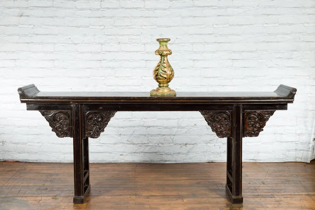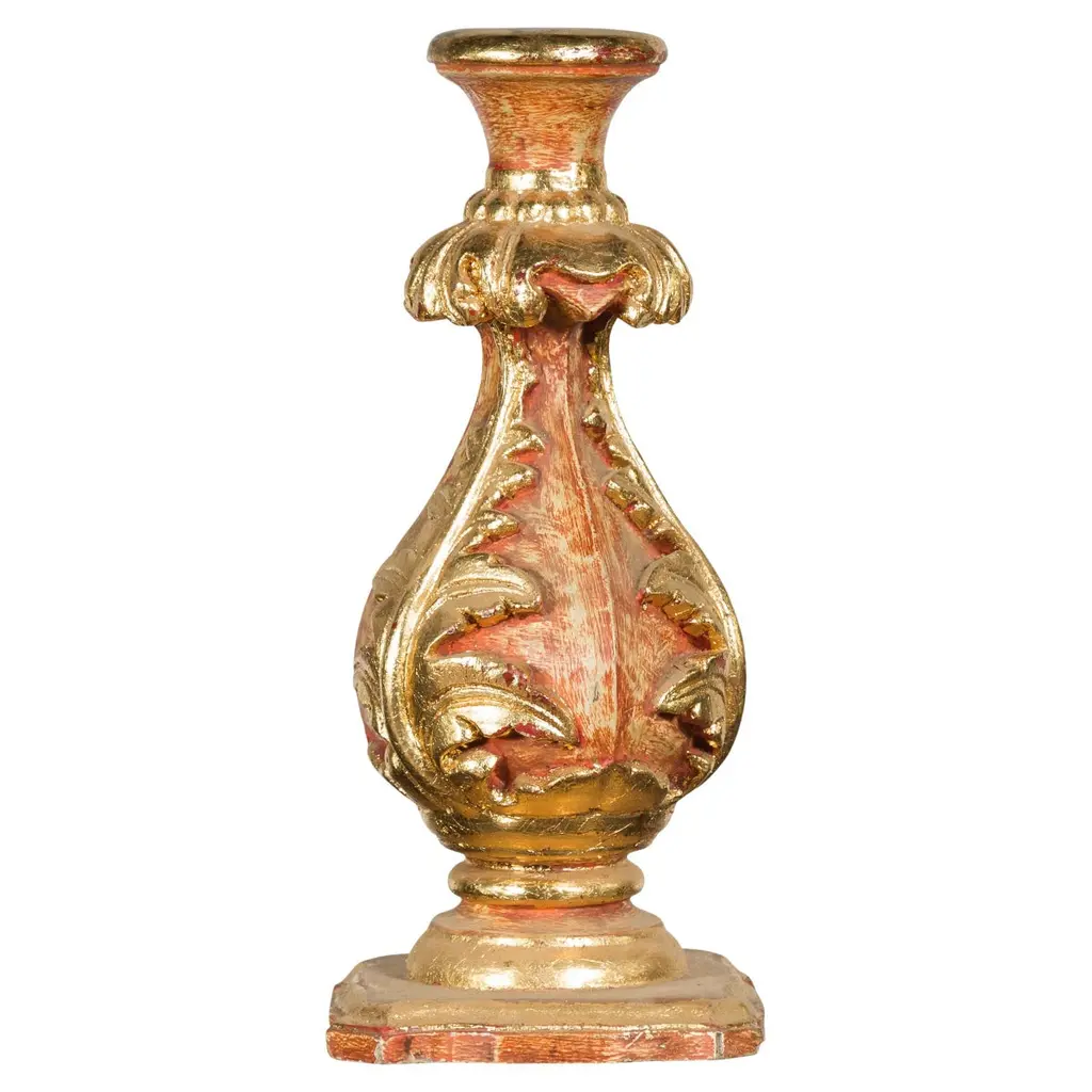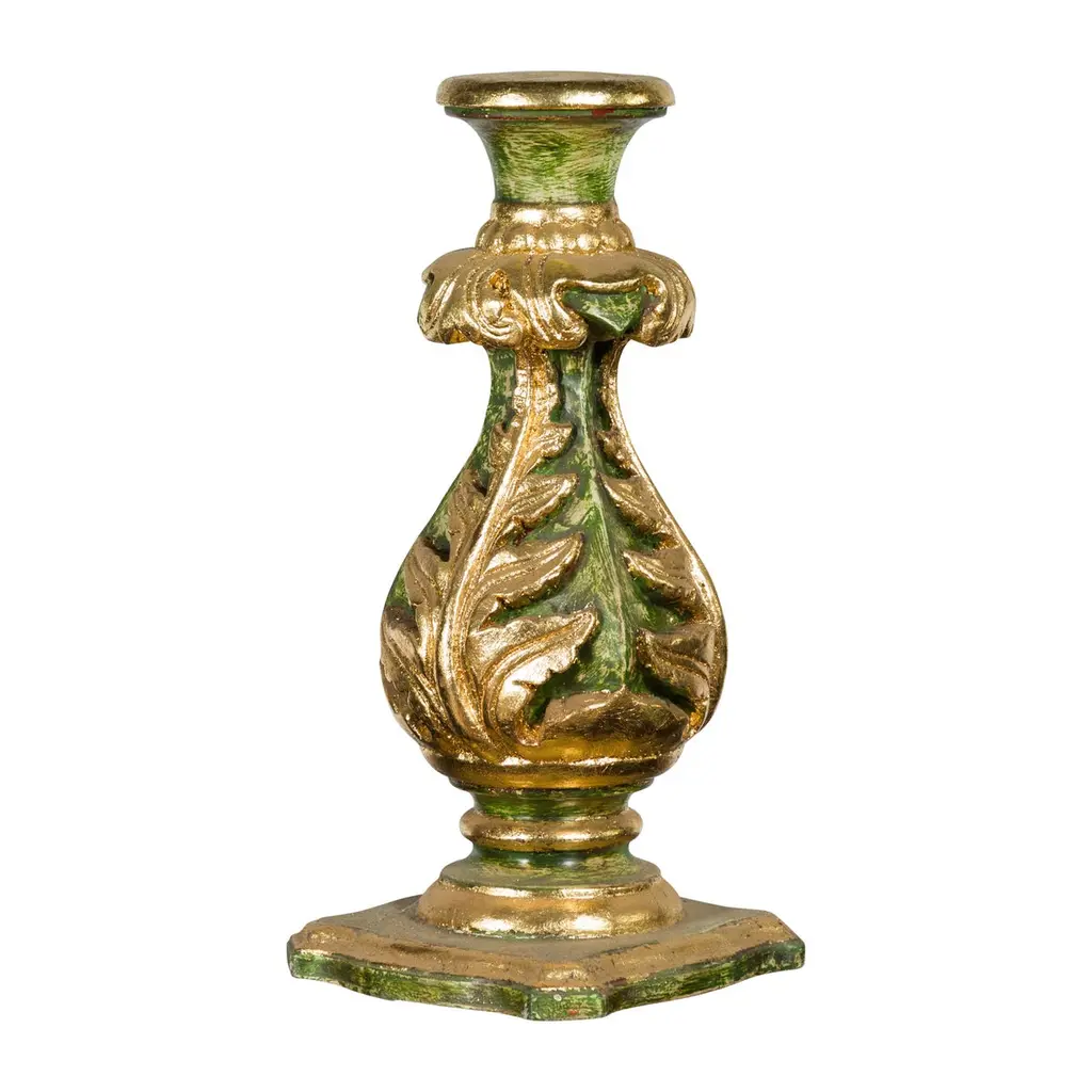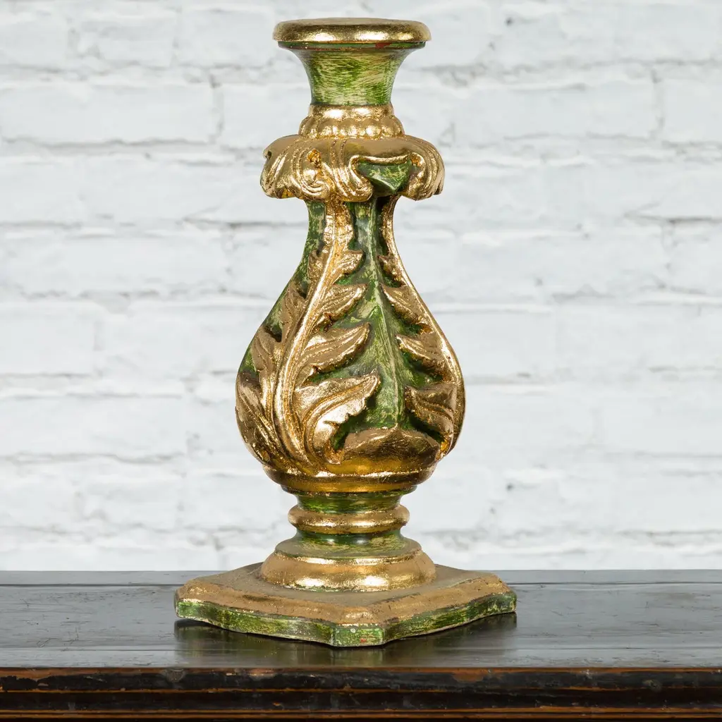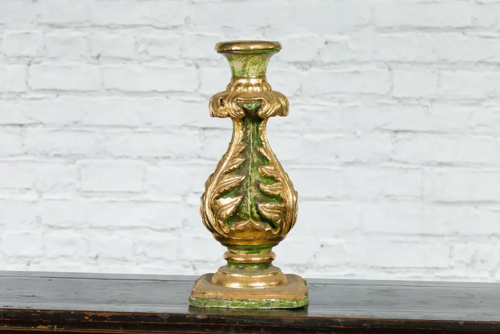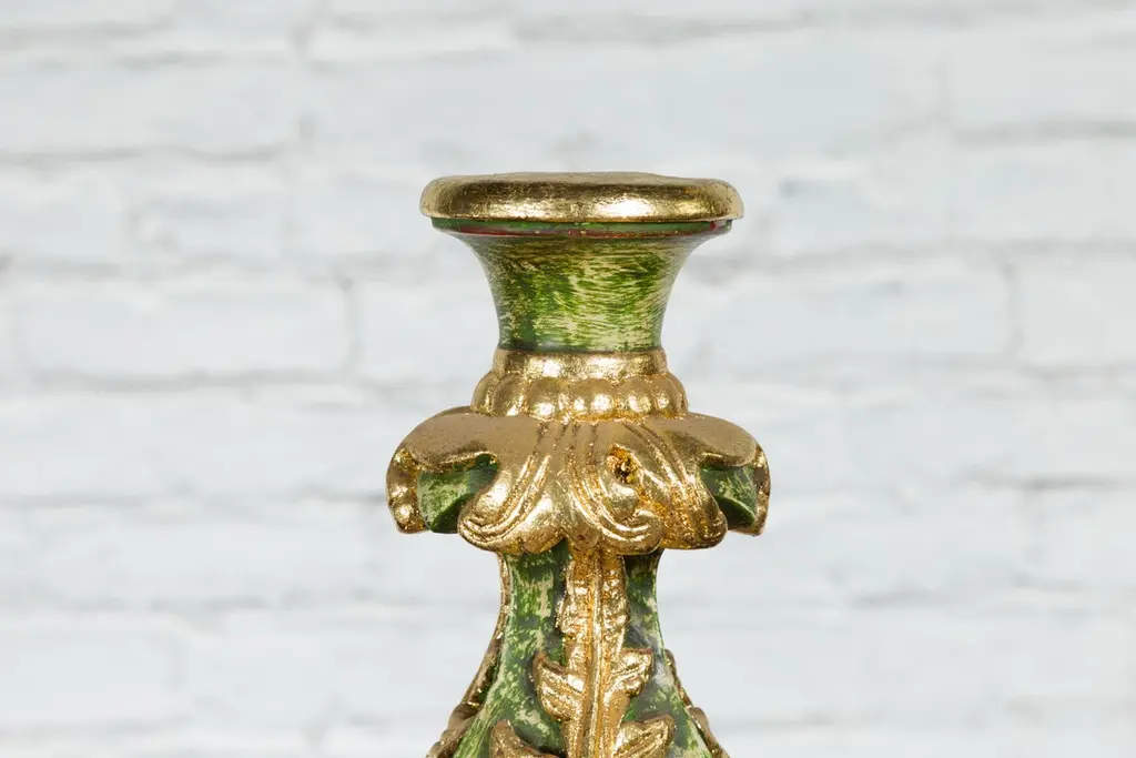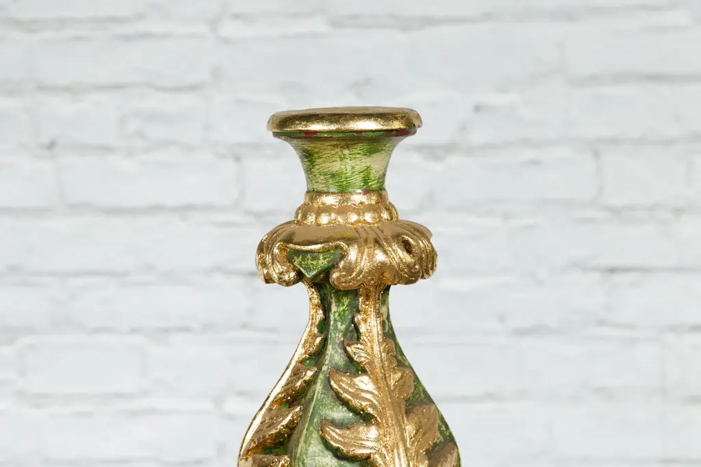 A vintage Indian green painted and parcel gilt wooden finial from the mid 20th century with carved acanthus leaves, pre-drilled to be made into a table lamp. Created in India during the Midcentury period, this finial attracts our immediate attention with its elegant lines and complimenting colors. Painted in a distressed green contrasted by golden tones, the finial is made of a turned body carved with exquisite acanthus leaves scrolling all the way up to the neck. Raised on a square-shaped serpentine base with canted corners, the finial is pre-drilled to allow you to transform it into a table lamp. You could add a lucite base to the ensemble should you desire it. With its striking colors and skillfully carved décor, this vintage Indian green and gold finial from the mid 20th century will make for a great addition to any home, perhaps displayed on the top of a commode, side table or demilune!