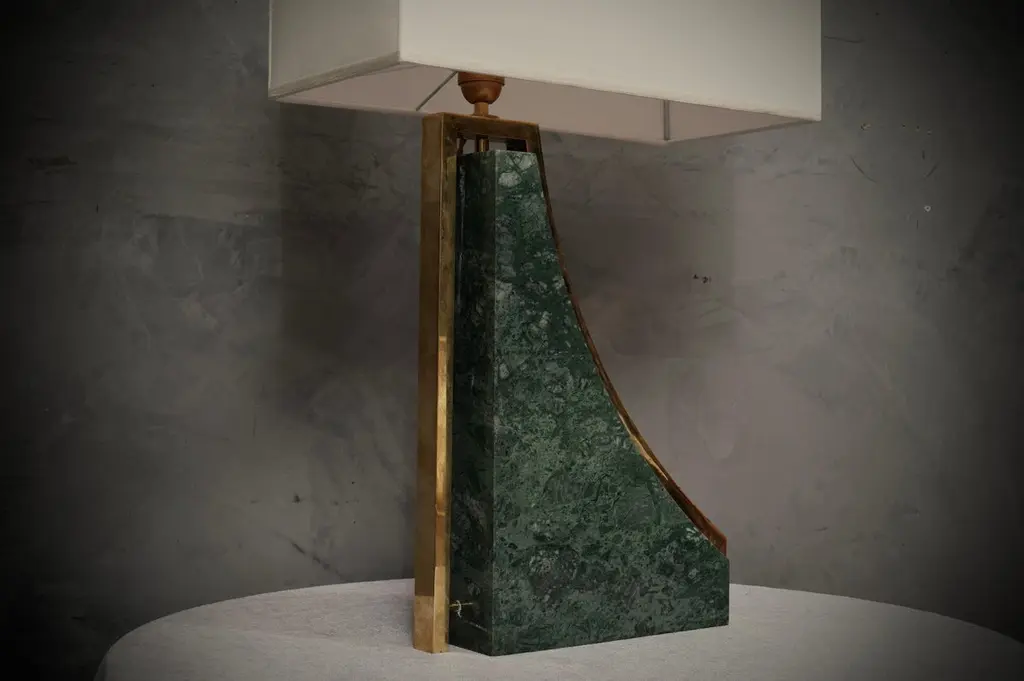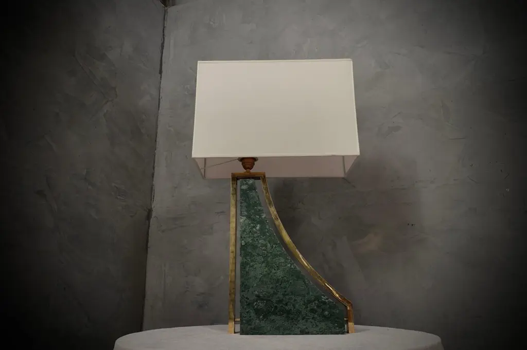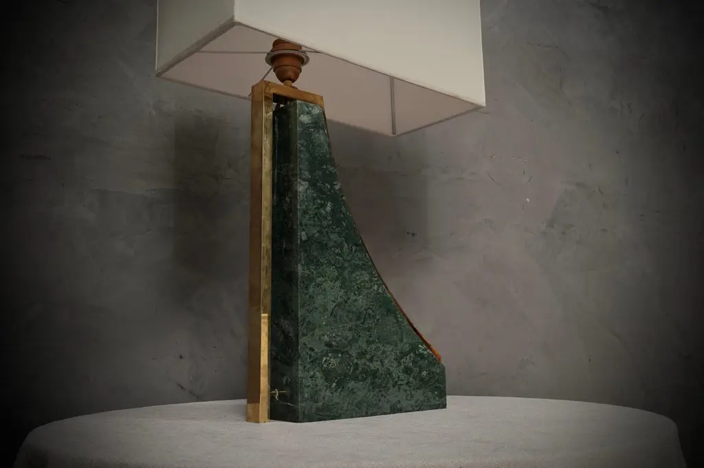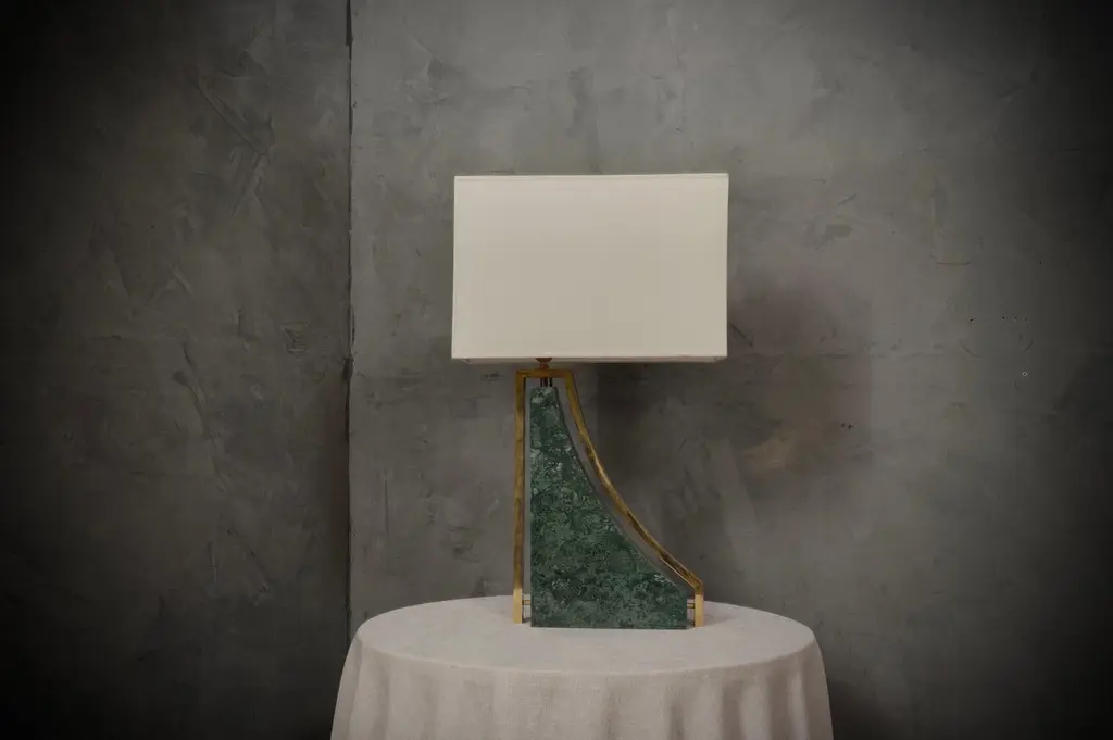 Original and characteristic table lamps in "Indian Green" marble and brass. One of a kind design, designed and made especially for our HannauRoma Store.The table lamp is made up of a "green India" marble base; Its shape is very beautiful and original, reminiscent of a true Italian style. The marble has a beautiful veining, a gradation that varies on more greens up to white. Around the marble we can see a brass band that takes up its entire perimeter. The lamp holder is placed on the highest part of the lamp above the brass, on which the lampshade then rests. The shape of the lampshade is rectangular and is centered on the whole lamp. The lamps were custom made for our HannauRoma shop in a one-off limited edition of two.Wear consistent with age and use. Each item offered by the HannauRoma warehouse is checked by our team of craftsmen. We guarantee a very high quality standard, ask our design specialists for detailed information.
