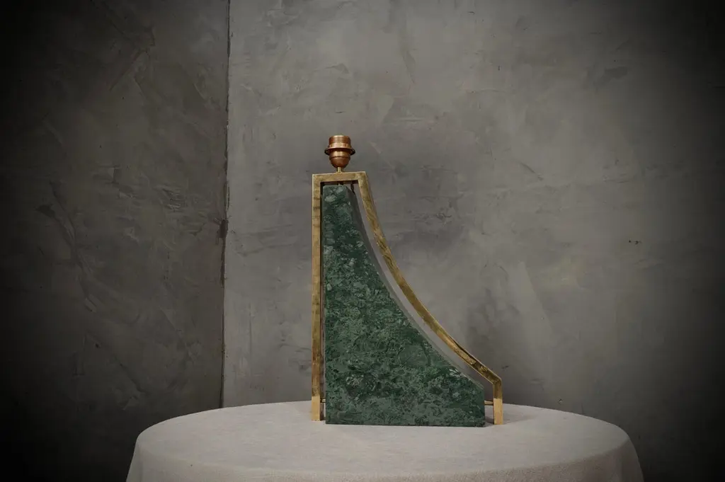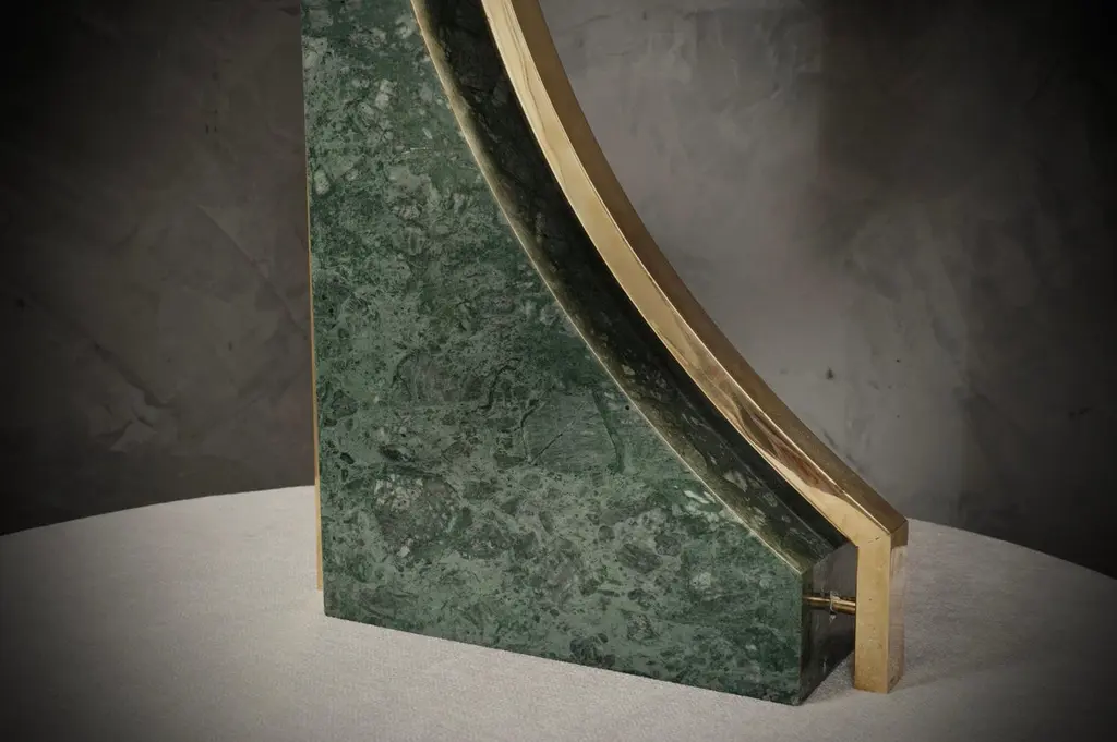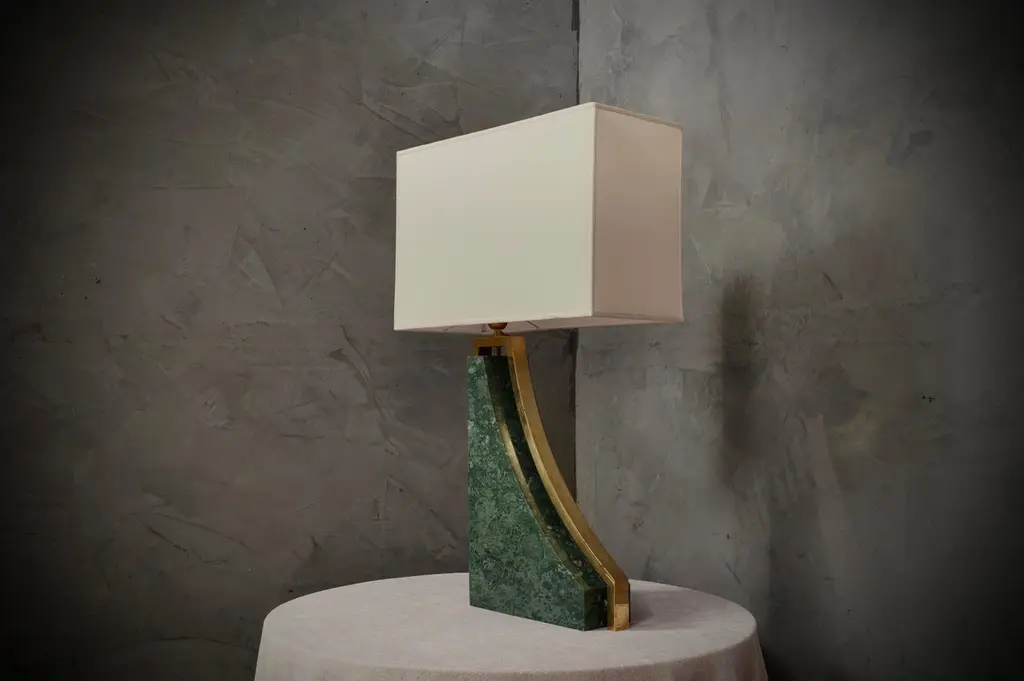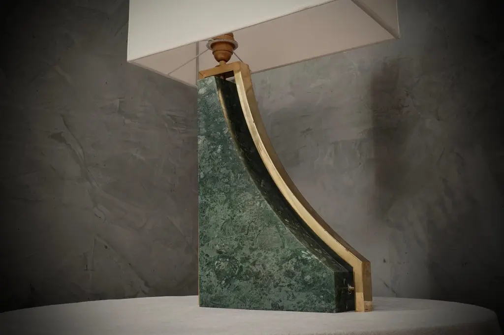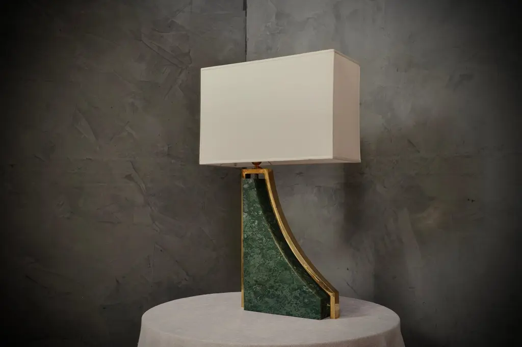 Original and characteristic table lamps in "Indian Green" marble and brass. One of a kind design, designed and made especially for our HannauRoma Store.The table lamp is made up of a "green India" marble base; Its shape is very beautiful and original, reminiscent of a true Italian style. The marble has a beautiful veining, a gradation that varies on more greens up to white. Around the marble we can see a brass band that takes up its entire perimeter. The lamp holder is placed on the highest part of the lamp above the brass, on which the lampshade then rests. The shape of the lampshade is rectangular and is centered on the whole lamp. The lamps were custom made for our HannauRoma shop in a one-off limited edition of two.Wear consistent with age and use. Each item offered by the HannauRoma warehouse is checked by our team of craftsmen. We guarantee a very high quality standard, ask our design specialists for detailed information.