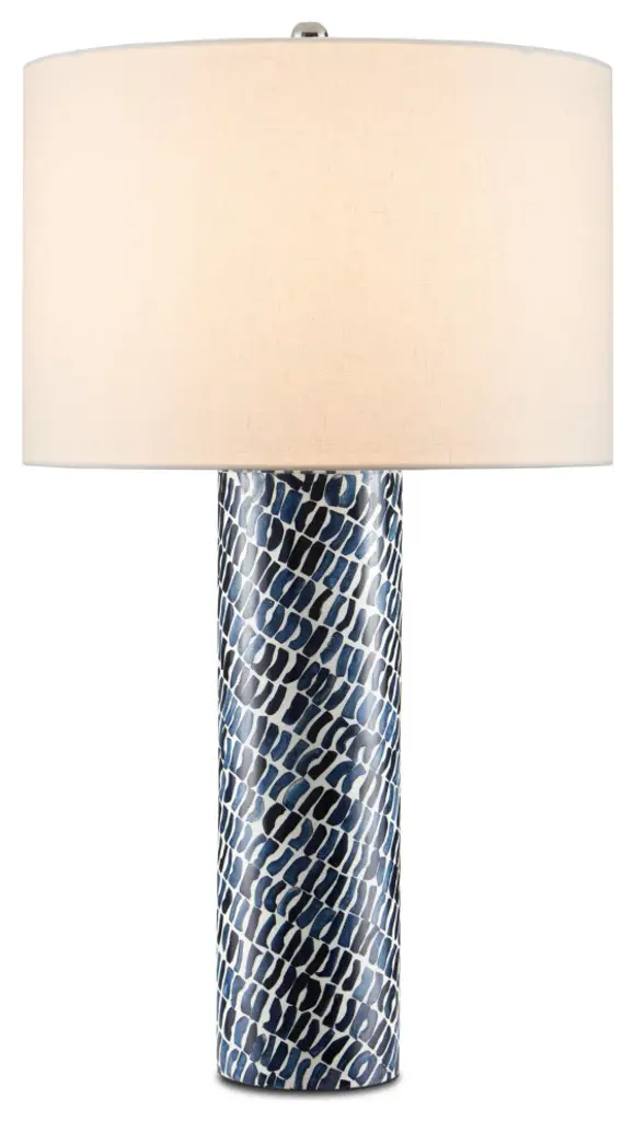 Appearing as if it has a painterly surface, one with naeve brushstrokes that could have been fashioned by a child, the body of the Indigo Table Lamp is made of navy bone and composite. The pattern that flows along the columnar base was inspired by the Indigo Box Set, which we also offer.Bulbs Included: NBulb Wattage: 150Bulb Type: A StandardNumber of Bulbs: 1UL Listed: YesHardwire or Plug: Plug