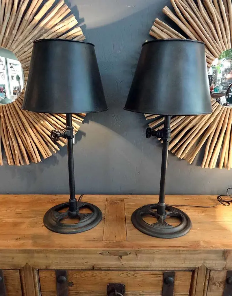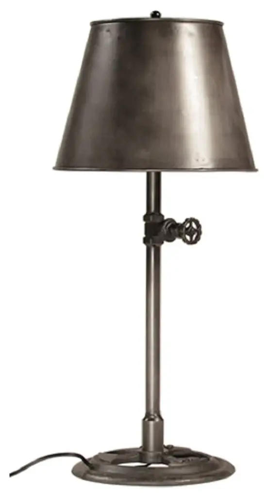 Industrial iron table lamp with cast iron base and iron handle detail. Great texture and finish for your interior space. Each slightly unique and each sold individually. 60 watt max bulb. Bulb not included. This item is non-returnable - all sales are final.Bulb Type: 60 watt maxNumber of Bulbs: 1Bulbs Included: 0UL Certified