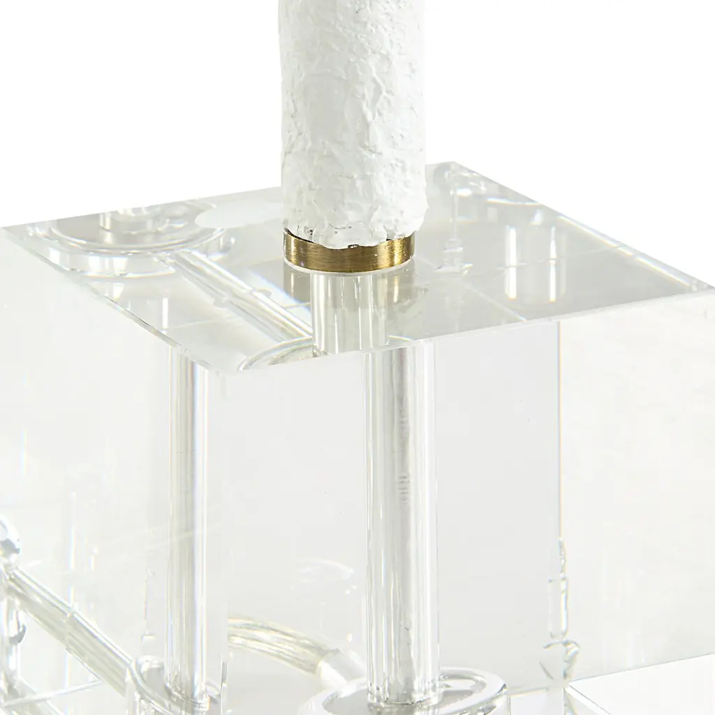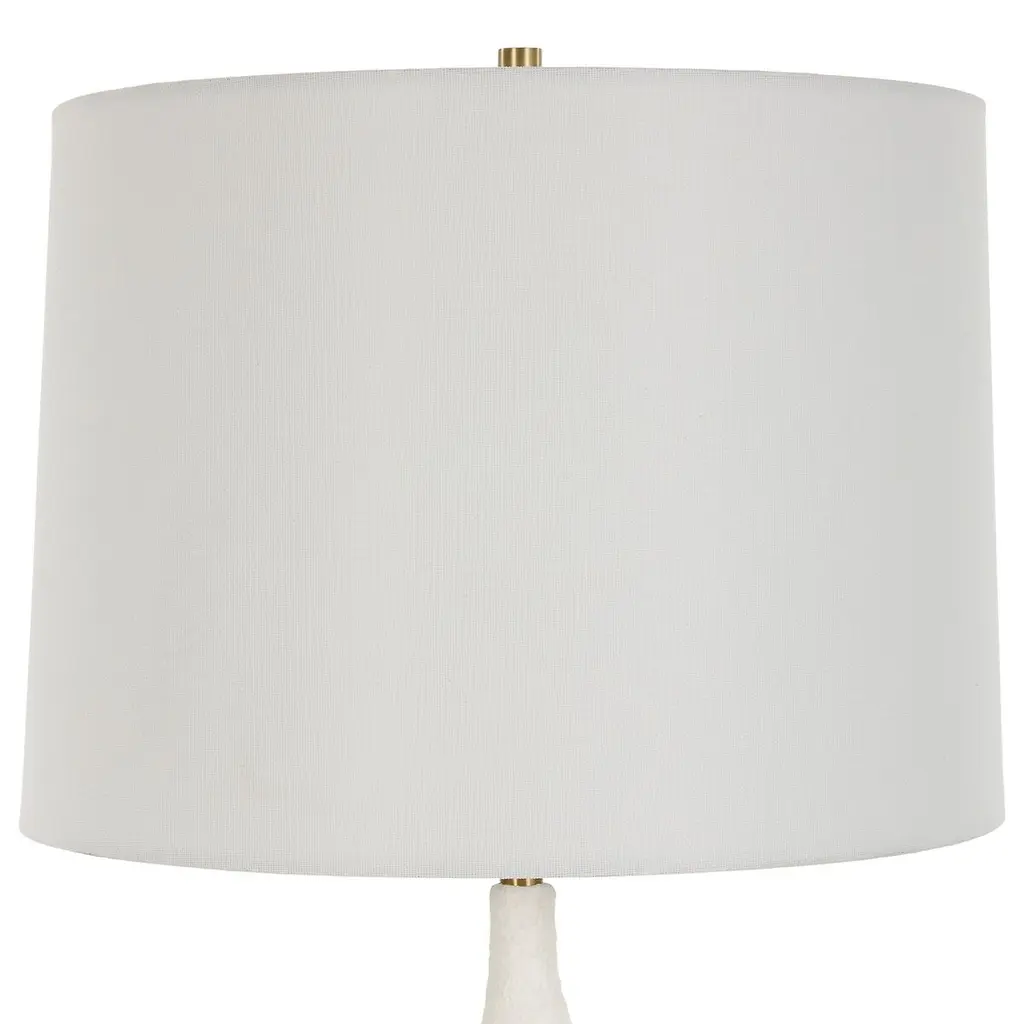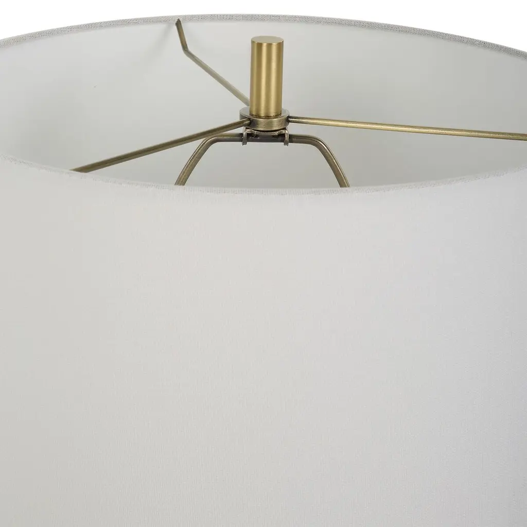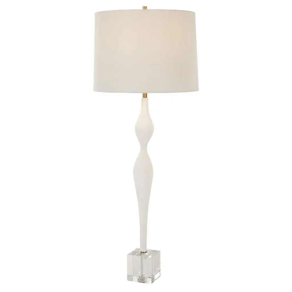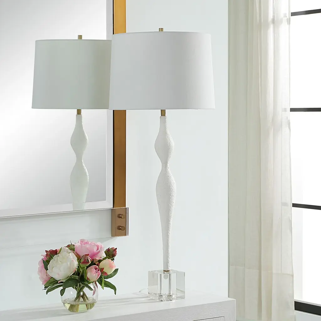 The Ines Table Lamp is a stunning piece that exudes elegance and sophistication. Its slender ceramic base, with graceful curves and a plaster-like texture, creates a captivating silhouette. The design is elevated by a thick square crystal foot, adding a touch of luxury, while antique brass plated accents provide a timeless charm. The lamp is topped with a hardback shade that gently tapers, wrapped in pristine white linen fabric, offering a soft, ambient glow. Perfect for adding a refined touch to any space, the Ines Table Lamp is a testament to exquisite craftsmanship and style.
