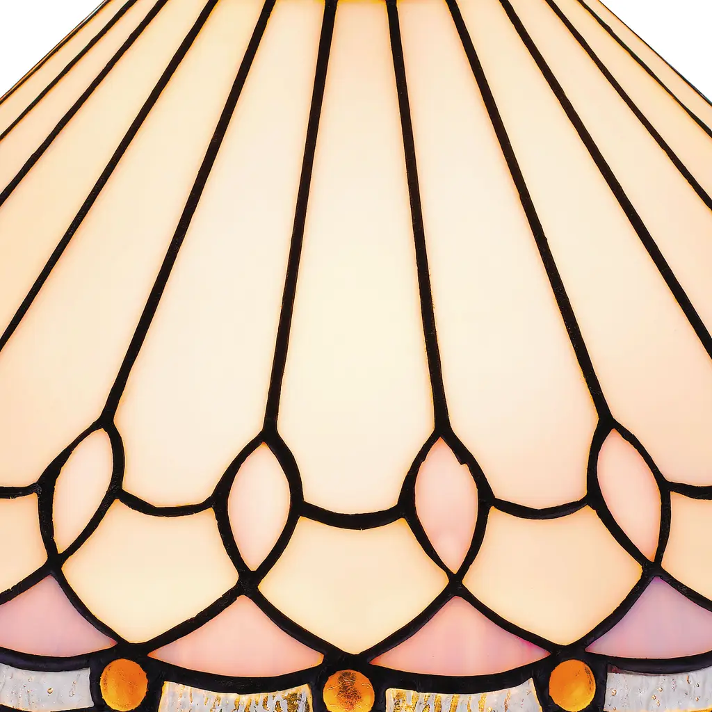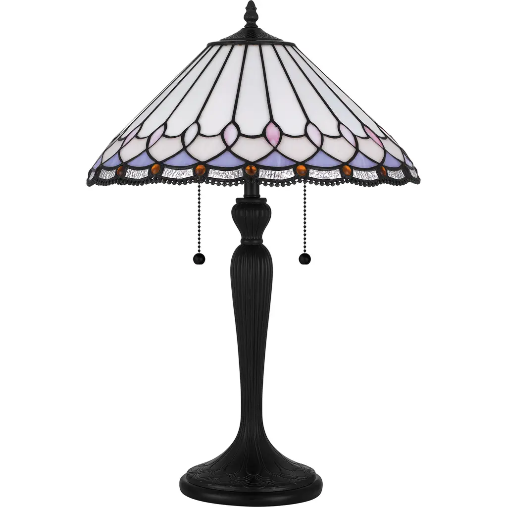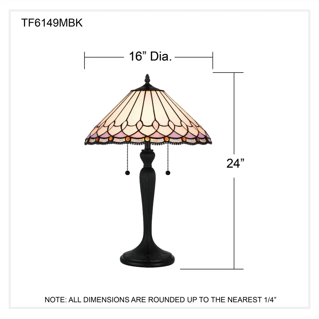 With a matte black finish and classic design, the Inez table lamp delivers on both style and function. The pretty shade is made of handcrafted Tiffany glass in shades of cream, pink, and purple for a feminine touch. The individual glass pieces are hand assembled and carefully arranged in a unique pattern, making Inez a versatile piece in any living room, kitchen, or home office.