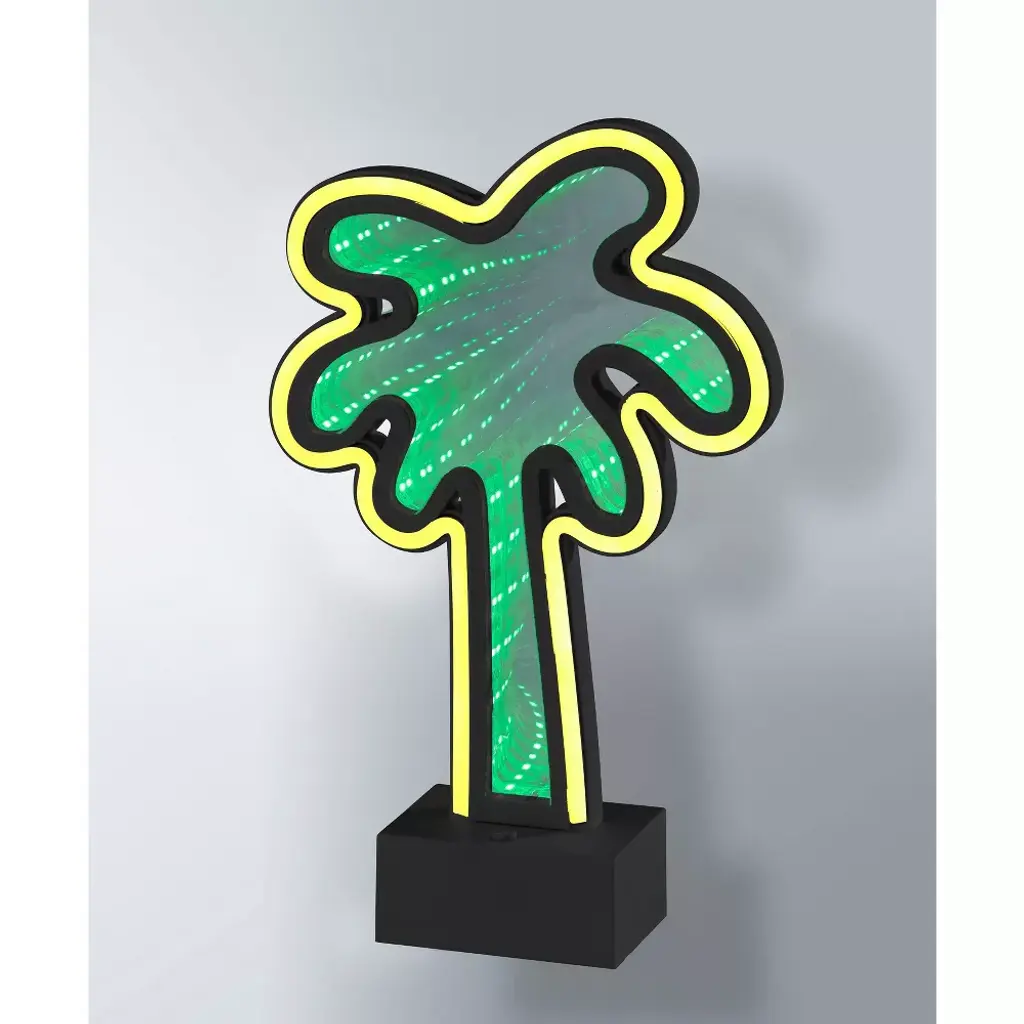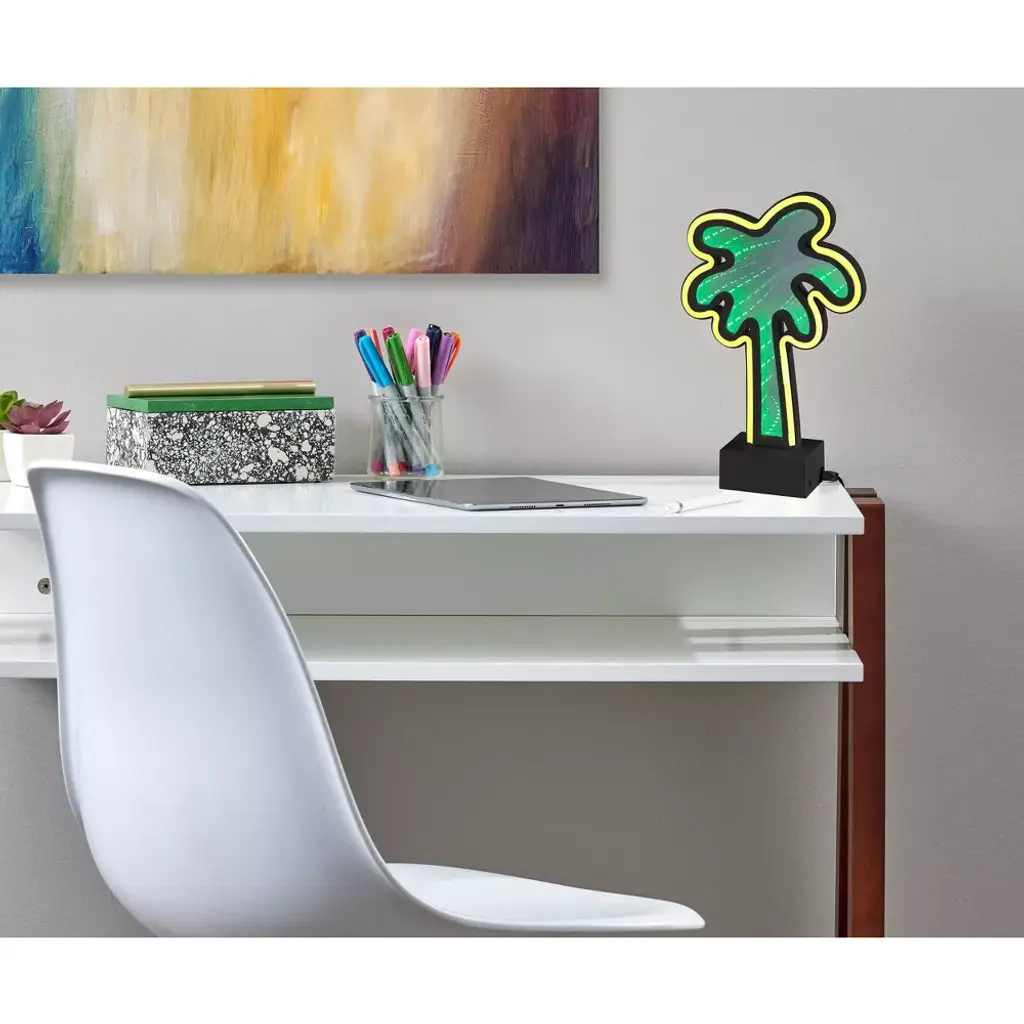 Enjoy tropical vibes with this bold Simplee Adesso Infinity Neon Palm Tree light that brings a retro feel with a modern twist to any space. Its black, rectangular plastic base houses three "AA" batteries (not included), making it easy to add a fun and stylish glow to any table, desk, or shelf without the mess of a cord. You can alternatively power the light with the included 8' USB cable for unlimited use without needing to worry about replacing batteries. For added versatility, the light comes with mount holes located on the back of the base for mounting to a wall, creating contemporary wall art. Made of mirrored plastic with a neon border, this 10.5" high and 6.5" wide piece includes a 1W LED light operated by a 4-way push button switch, letting you alternate between a solid neon yellow border light only, infinity psychedelic green all-over light only, or both lights. Even with the light powered off, the stylish palm tree detail creates an eye-catching retro look and can function as a mirror.