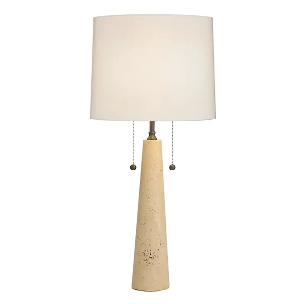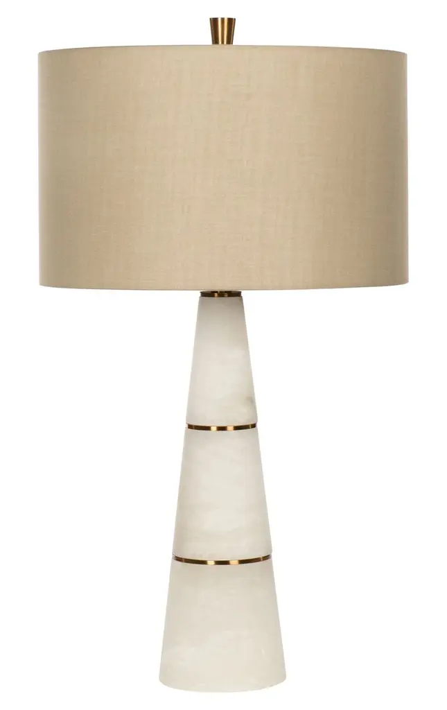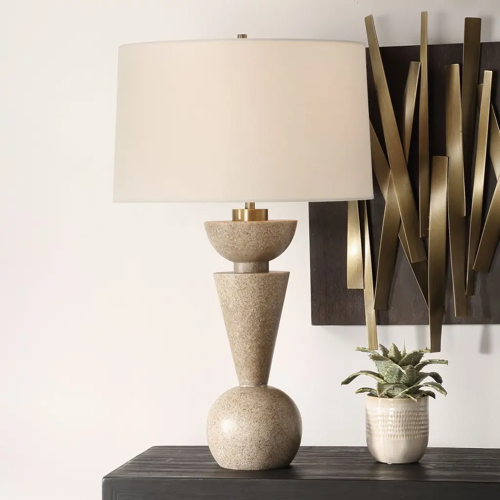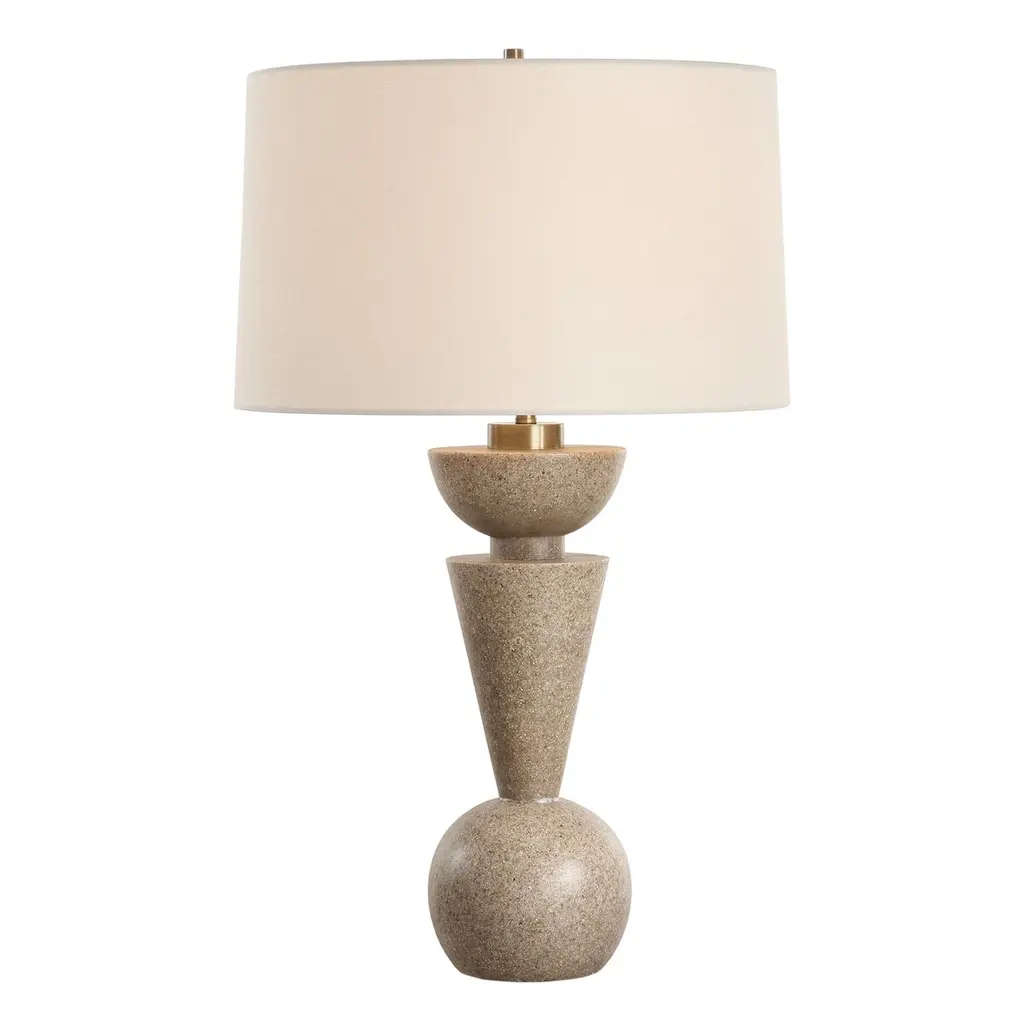 The Ingrid Table Lamp is a stunning embodiment of modern design, featuring a striking geometric silhouette that exudes sophistication. Crafted from high-quality man-made stone, its sand-colored base is beautifully complemented by elegant brass-plated accents. Topping off this exquisite piece is a slightly tapered white linen round hardback shade, which adds a touch of classic elegance. This lamp is a perfect blend of contemporary style and timeless charm, making it an ideal addition to any space seeking a refined aesthetic.