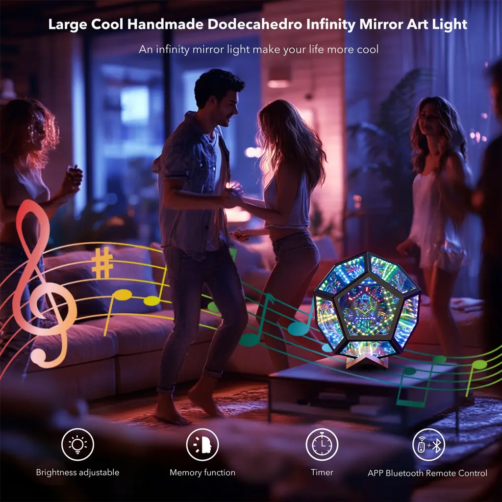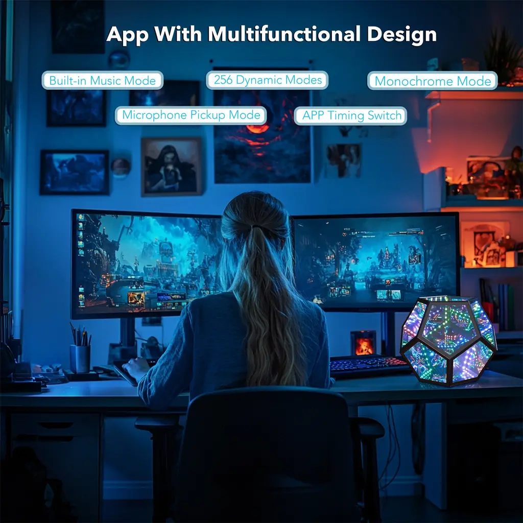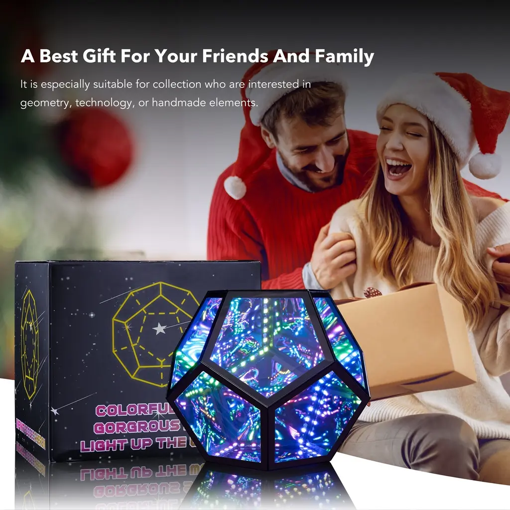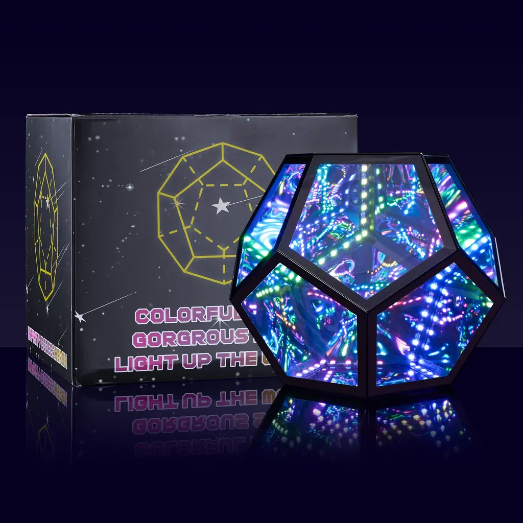 Elevate your gaming or bedroom aesthetic with the ultra-cool RGBW Infinity Mirror Light. Designed in a futuristic dodecahedron shape, each side creates an endless visual tunnel of colorful light, combining cutting-edge design with mesmerizing RGBW effects. With 7 vibrant base colors and a jaw-dropping 365 lighting modes, this lamp lets you fully customize your space—whether you're vibing during a gaming session or setting the mood for a party. You can adjust brightness and light speed to match your mood or style. Crafted from eco-friendly, FDA/FC/CE-certified materials, it’s safe, energy-efficient, and easy to enjoy. Ideal for gamers, teens, or anyone wanting to add a dynamic edge to their room, this light also makes a standout gift for birthdays, holidays, or special events.Key Features: