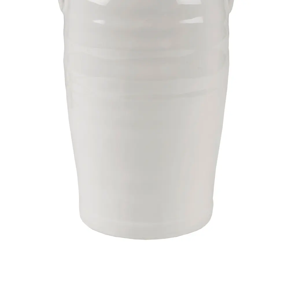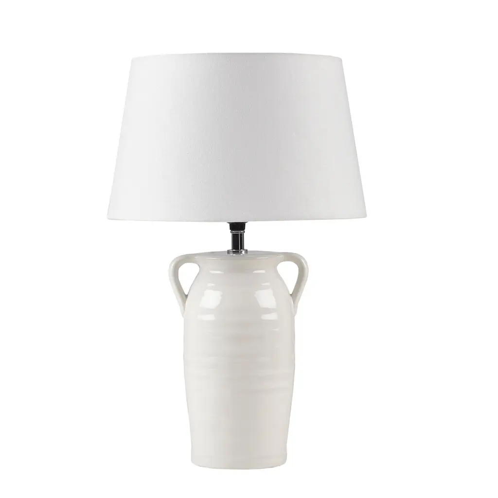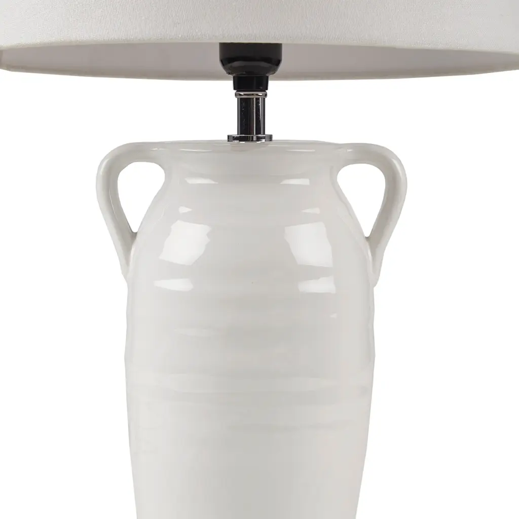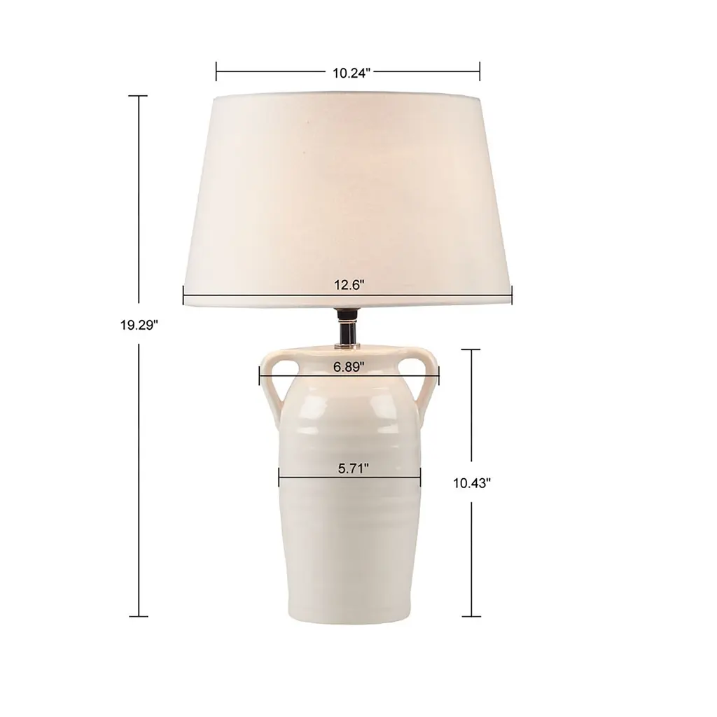 The INK+IVY Everly Ceramic Table Lamp with Handles offers a soft, modern touch to brighten your home decor. This ceramic table lamp features a white, vase-shaped base that creates a charming and farmhouse-inspired look. The drum lamp shade complements the design of the base, while also filtering the light for a soft warm glow. Simple in its design, this round table lamp provides a lovely and graceful update to your living room. Handle with care. Spot clean only. Features:Dimensions: