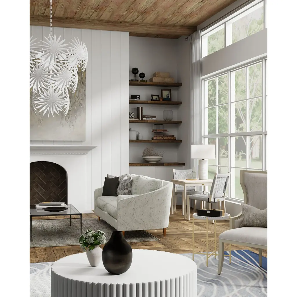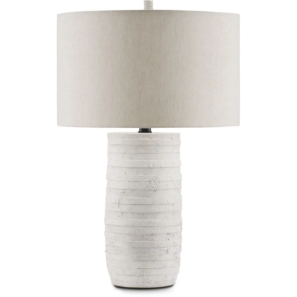 Flat discs of terracotta encircle a wrought iron spine on our Innkeeper White Table Lamp designed by Ian Thornton. The rustic feel of this natural material still discernable after the white finish has been applied means it has a heavy dose of texture. The table lamp is topped with a light natural linen shade held in place by a matching terracotta finial. Introducing added character are the visible satin black hardware contrasting the pale elements and the columnar body narrowing slightly to create an implied base.