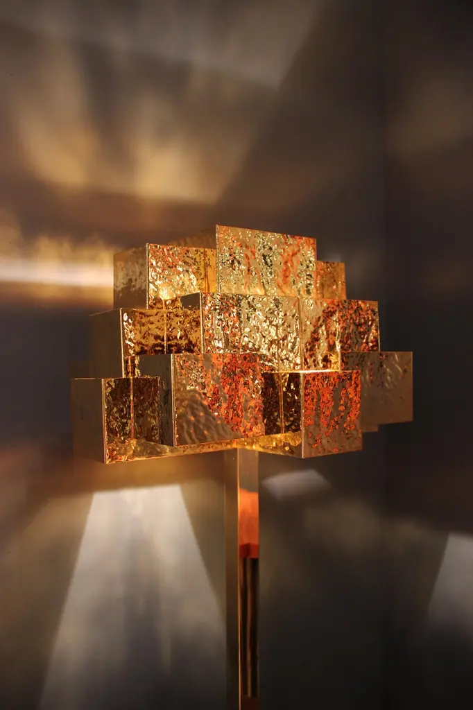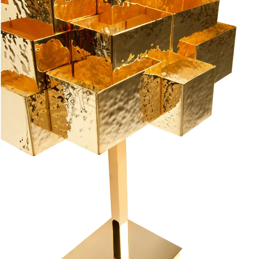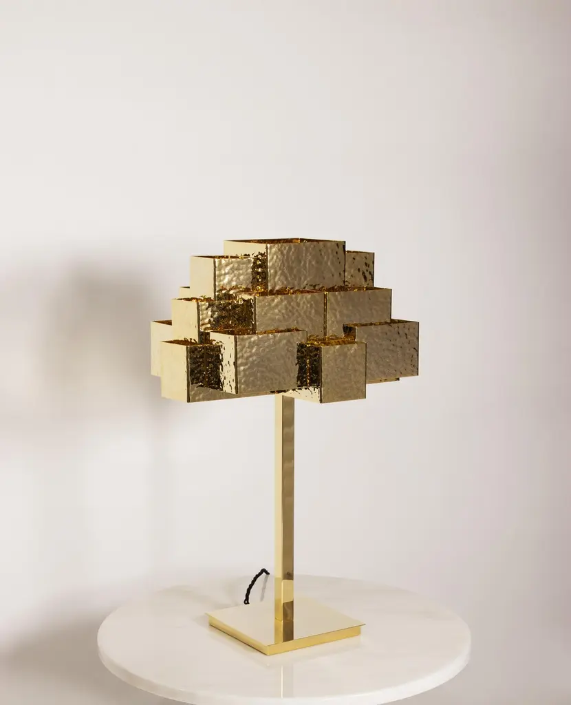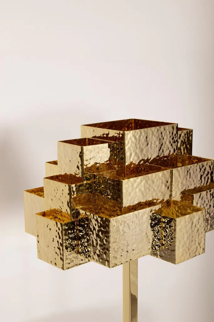 Inspiring trees recreates a treetop and is fully handcrafted. The rays of light pierce the geometric design in an unexpected way; almost ethereal.Slender and seemingly minimal, inspiring trees is a lighting piece that carries form, image and meaning. In the ‘treetop’, the detailed hammered handcrafted work captures the richness of light and shadows present in any real tree.The light is distributed by the three levels of the ‘treetop’ and diffuses, controlled by the geometry of several overlapping pieces. It is a unique lamp to stand out in any luxurious interior.Product details:Top: Handcrafted in hammered brass with golden bath finish.Base: Handcrafted in polished brass with golden bath finish.Product options:Top: Hammered, brushed, oxidized brushed or aged brushed brass/copper/nickel.Base: Polished, brushed, oxidized brushed or aged brushed brass/copper/nickel.Weight:4Kg 8.9 lbs Electrical characteristics:Mains: 3 wires connection - Live ; Neutral ; EarthFrequency: 50-60HzUSAVoltage: 110-130VACLamp: E12 candelabra; 40W max.EuropeVoltage: 220-240VACLamp: E14; 40W max.Made to order. Custom sizes and other finishes are available under request. Designed by Joana Santos Barbosa, 2013. Handmade in Portugal.