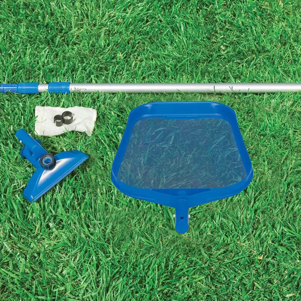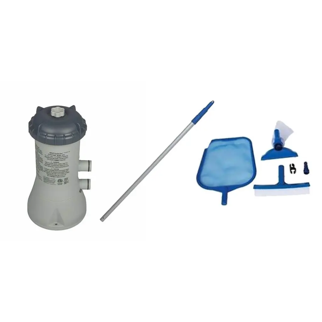 Spend more time enjoying your pool and less time maintaining it with this Intex 1000 GPH Easy Set Pool Filter Pump. Efficient filtration is essential for a quality swimming experience. The Intex 1000 GPH pool pump is easy to install, just hook up to the hoses and plug in. This pump increases water circulation and filtration and guarantees a cleaner pool. Designed for all 10, 12, 14, 15, and 16-foot Intex above-ground swimming pools. Also great for Sand-n-Sun, Aqua-Leisure and other pools with 1.25-inch diameter hose connections. The GFCI (ground fault circuit interrupter) feature on the 1000 GPH pump provides additional safety and protection. Your pump will shut off automatically if the electrical current is exposed to water. This package also includes a cleaning kit with vacuum skimmer. Including three essentials, the Intex Pool Maintenance Kit helps keeps your pool water looking crystal clear. Maintenance is a part of every swimming pool and getting the right tools for the job cuts down on time spent cleaning. Attach the vacuum to the 94" telescoping pole. Simply connect your garden hose and suck debris into the reusable debris bag. Then attach the surface skimmer to the pole and collect leaves and other floating particles. Keep your pool safe and clean with the INTEX Pool Maintenance Kit. Filter Pump Keep your pool water clean and refreshing with this Intex 1000 GPH Easy Set Pool Filter Pump Fits 10,12,14,15, and 16-foot diameter Intex Easy Set, Frame Set and Ultra Frame Pools Easy installation, just hook-up hoses and plug in, everything you need is included Use with maximum pool size of 4,440 gallons Pump Flow Rate: 1,000 gph System Flow Rate: 750 gph This pump works with your 110 120 Volt Power Connection Double Insulated Pump is durable and long lasting Air release valve for trapped air in filter chamber Waterproof On/Off switch mounted on pump UL/CSA Safety Listed GFCI outlet feature adds additional safety and security Comes complete with all fittings, clamps, strainers, 1.25-inch hoses Compatible with the Type A filter cartridges (1 included) Warranty: 1 year Dimensions: 10.6 x 10.6 x 15 inches Weight: 8.3 pounds Part number: 28637EG Maintenance Kit with Vacuum & Pole Keep your pool clean and safe with these helpful tools Included in the kit: Vacuum head with 1-piece cleaning head, surface skimmer, and 94-inch telescoping aluminum pole Vacuum attaches to garden hose and includes reusable debris bag (Garden hose is not included) Clean remaining floating debris from the surface with the surface skimmer Durable mesh net attached 94-inch telescoping aluminum pole is compatible with both accessories and is great for 16-foot and smaller diameter pools Weight: 2.5 lbs Part Number: 28002E Manufacturer warranty: 1-year warranty Part number: 28002E