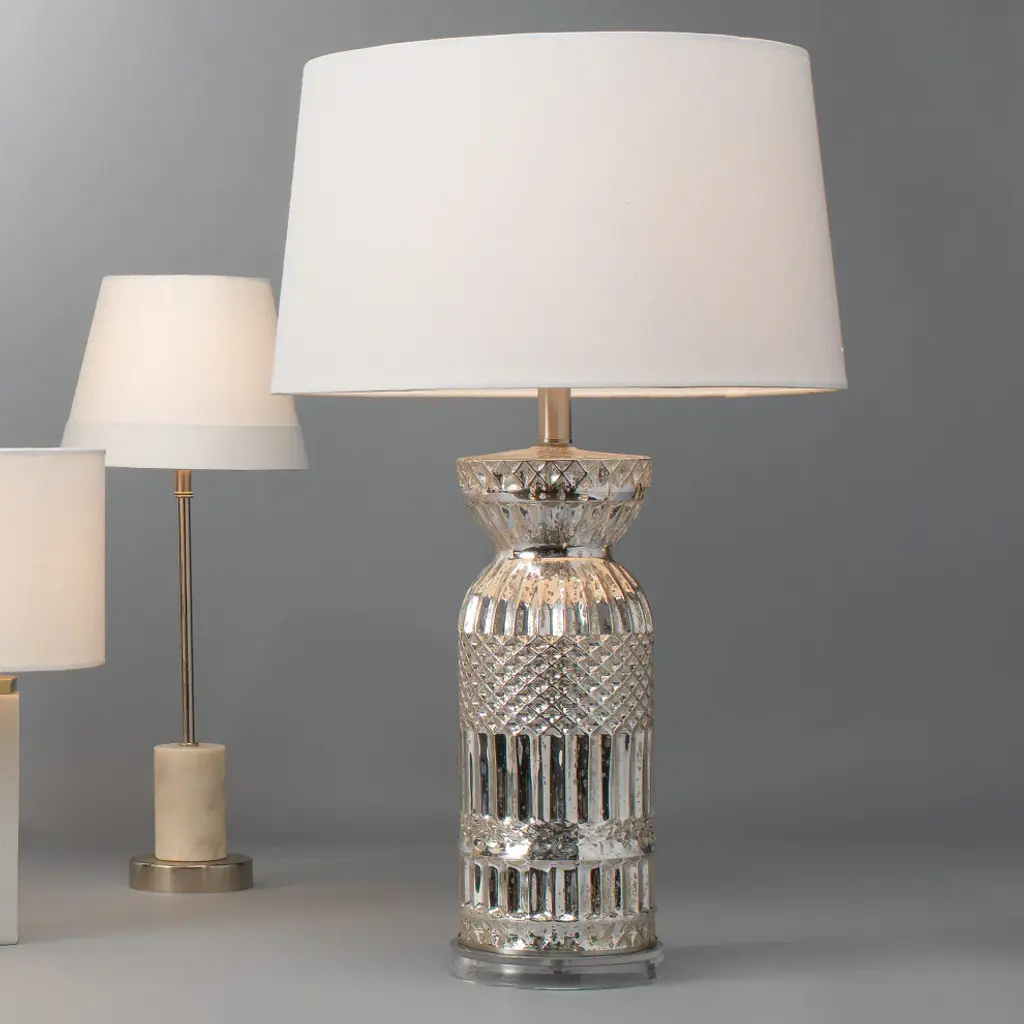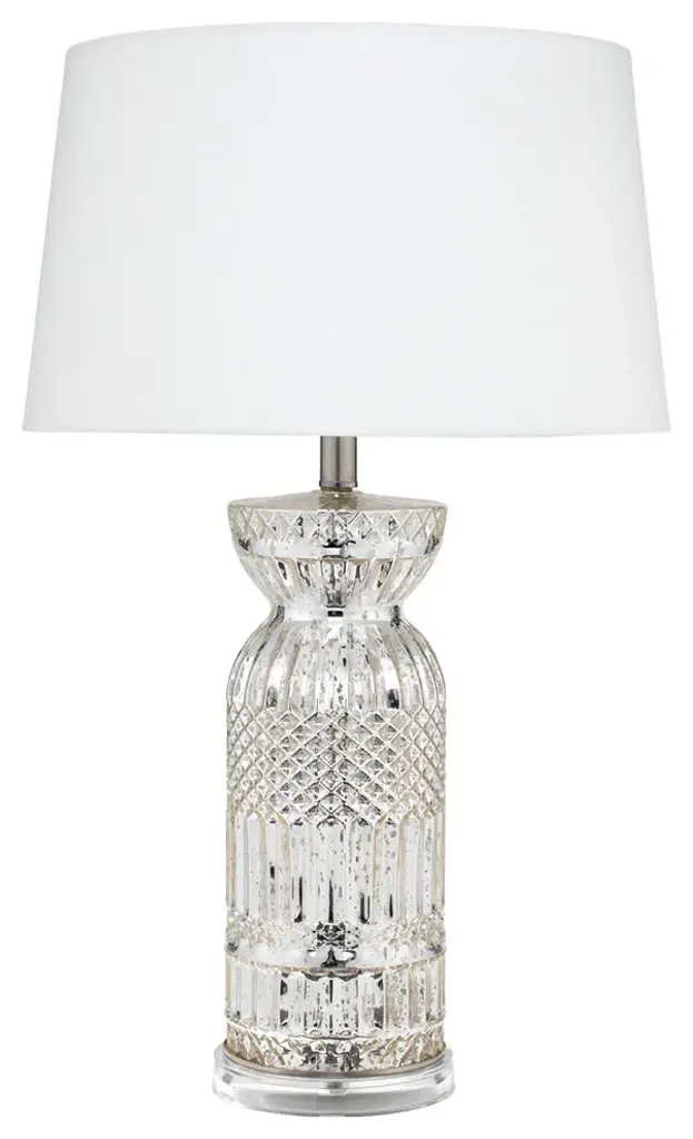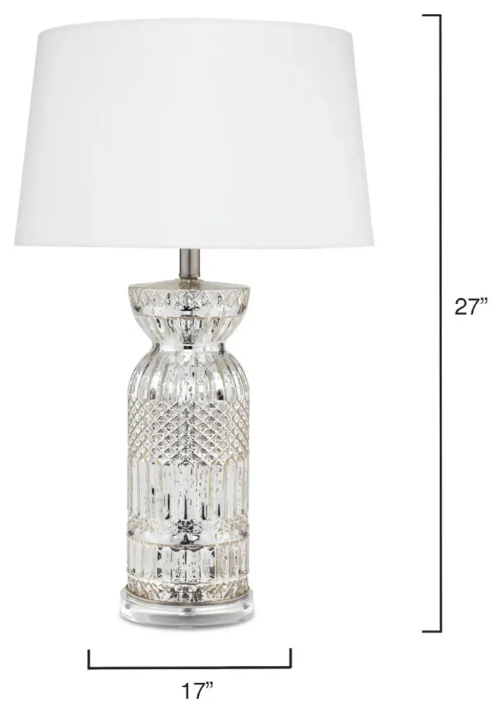Add a touch of luxury and drama to any room with this accent lamp. Its traditional urn shape is made of mercury glass that draws the eye and reflects light around the room and the clear acrylic base gives it an elevated presentation. Topped with a linen shade, this table lamp will be the main focus in your home. Made of hand-blown glass100% Off White Linen Tapered ShadeAcrylic Base Clear Acrylic Ball FinialCrafted of hand-blown glass, this lamp will feature subtle markings and variations in tone. These unique imperfections and variations are what define our products, with each piece having its own personality. Lamp Dimensions: 15.5"H x 6" Diameter FootprintShade Dimensions: 10"H x 17"W x 17"D, Top Diameter 15"1 bulb required; Bulb Not Included150 Max Wattage; 120 VoltsE26 Bulb Base Type 8 Ft Clear Cord3-way SwitchCare Instructions: We do not recommend using harsh or abrasive cleaners at any time as they can damage product. Wipe surfaces gently with soft, dry cloth. If needed, you may use a lightly damp cloth with water only on base.