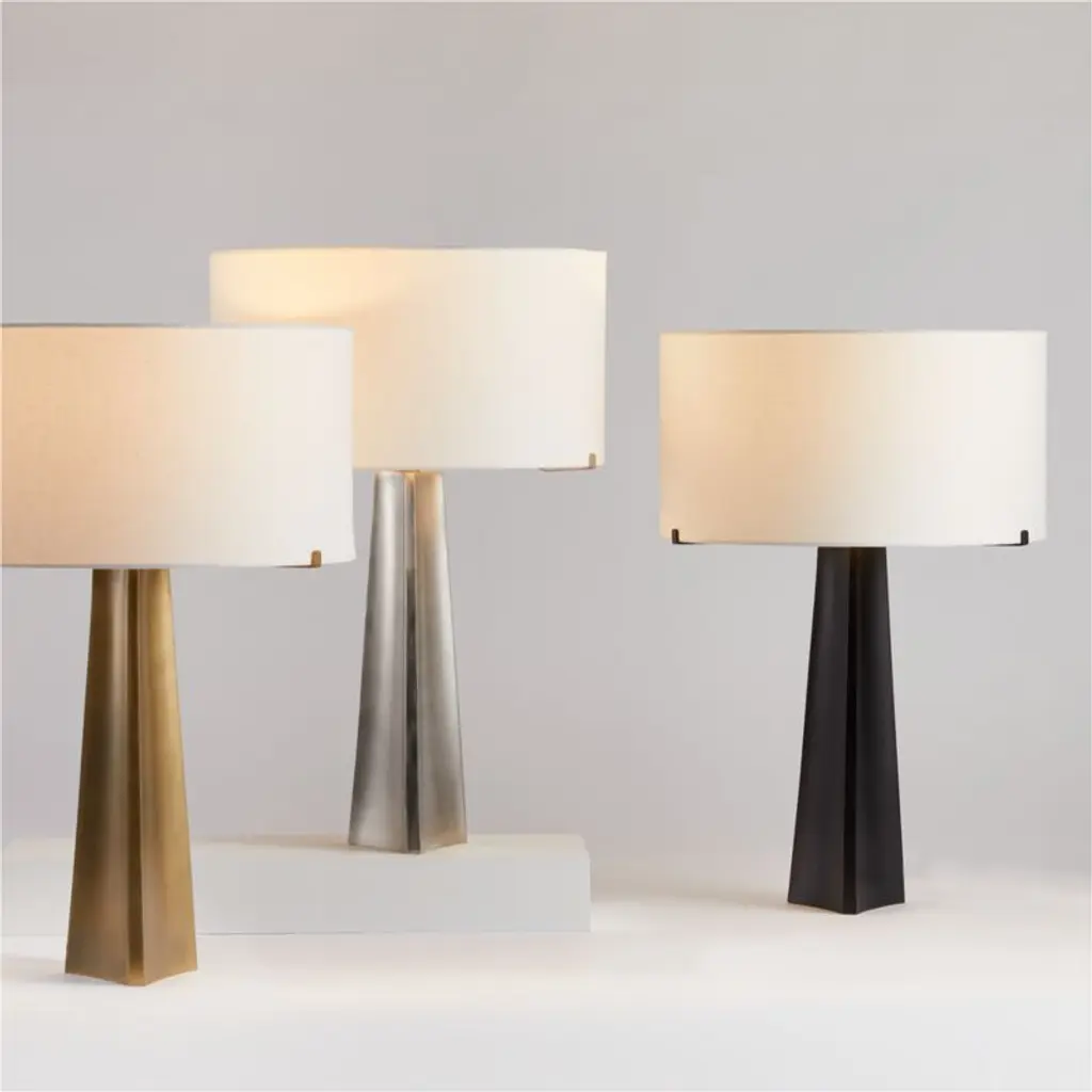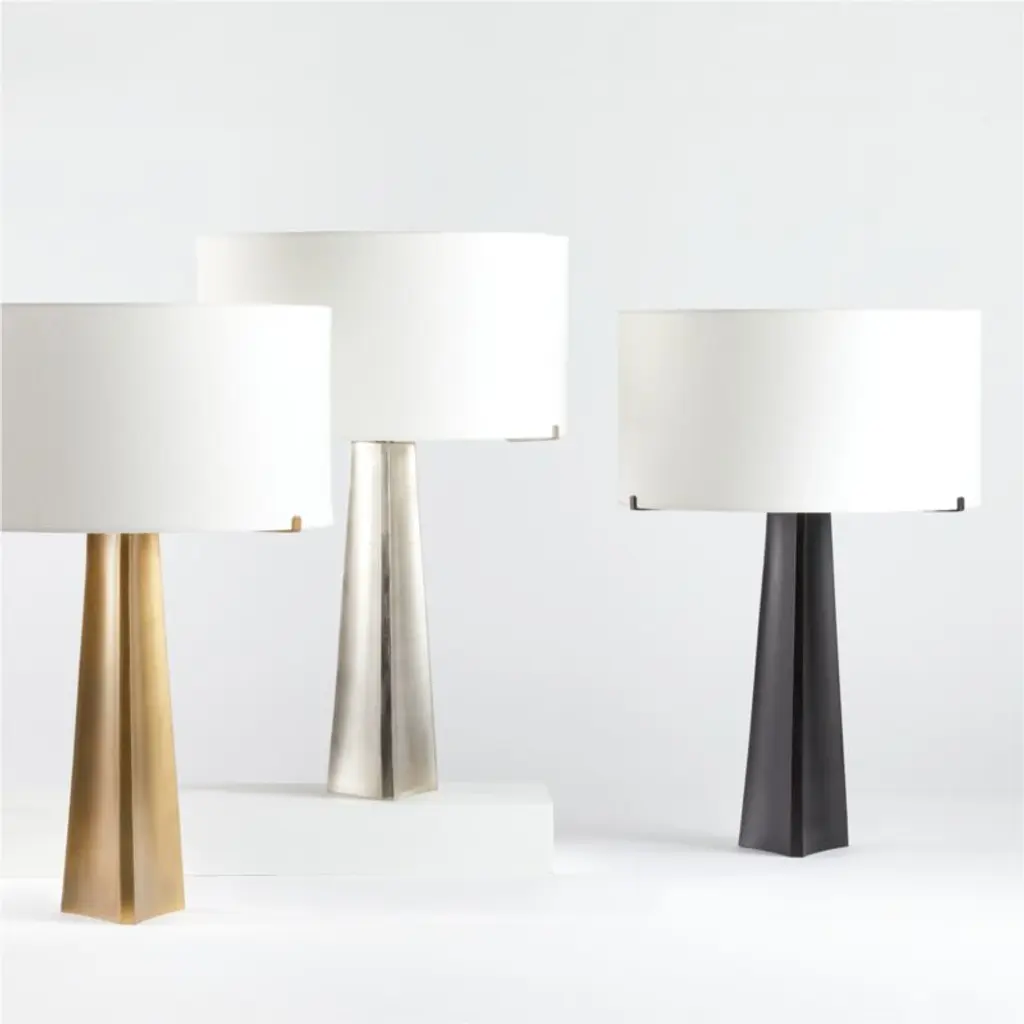 Like refined steel beams finished in brass, pewter or near-black bronze, our Isla lamps grace tables with industrial beauty and architectural grace. Three gently curved panels welded together sculpt a slender pyramid topped with a contrasting bright white cotton drum shade for softly diffused light. The coordinating metallic clips of the built-in shade frame add dainty details. Designed for us by Blake Tovin of Tovin Design, our exclusive Isla triangle table lamps pair with the matching floor lamps for a unified room.