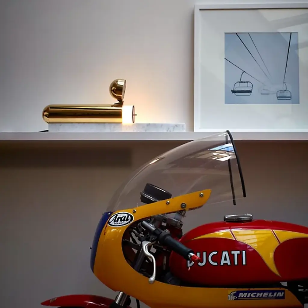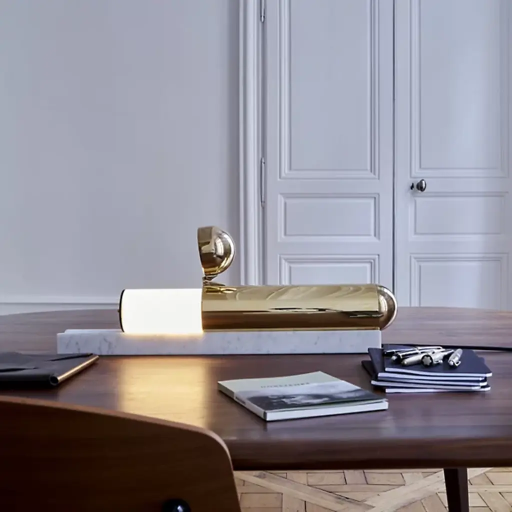 The ISP LED Table Lamp from DCW éditions is a truly contemporary piece. Unlike any other design, this fixture comes from the mind of Russian-born Ilia Sergeevich Potemine. A frosted tube is nestled within a futuristic brass capsule. The capsule’s lid switches open, and the tube can be extended from inside, glowing with warm light from an integrated LED. Resting upon an elongated marble base, this unusual piece can be displayed on a mantle as a decorative addition or placed on a desk to offer a beautiful accent and soft illumination.