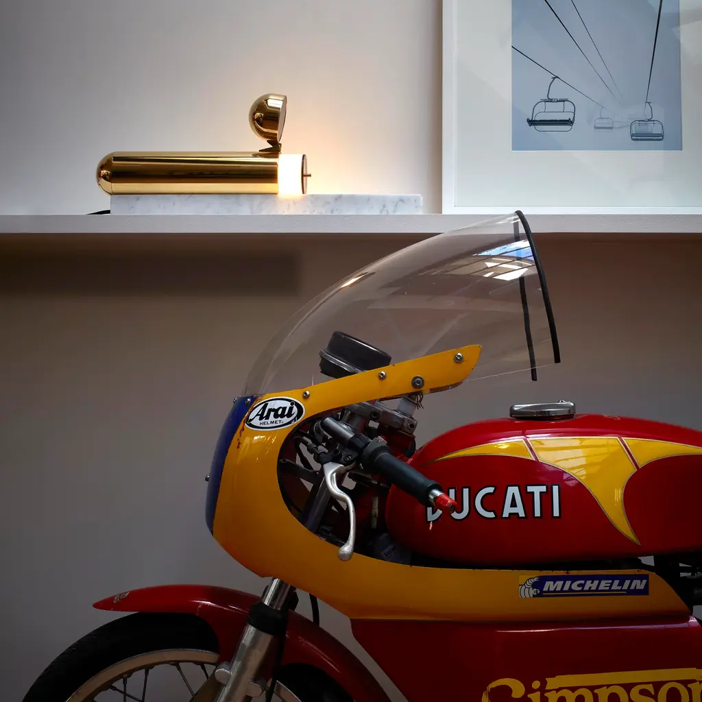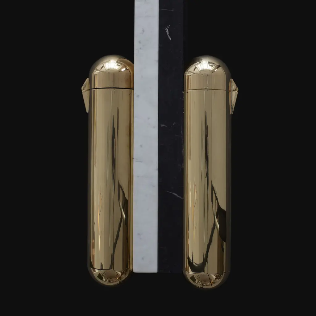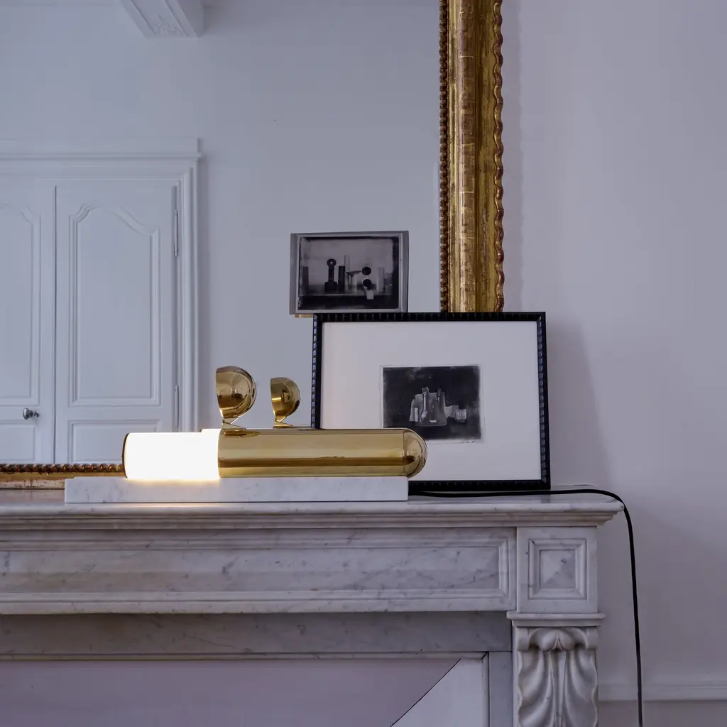 ISP takes lighting into the 21st century with a streamlined brass capsule. An aviator by trade, its designer Ilia Sergeevich Potemine fashions a light controlled by the wave of the hand not a switch or dimmer—via an electronic proximity sensor. Instead of a classic bulb, the glowing cylinder is adjusted by pulling it out of the gleaming tube. A base in either black or white marble proves a more than elegant match with its intriguingly characteristic pattern.