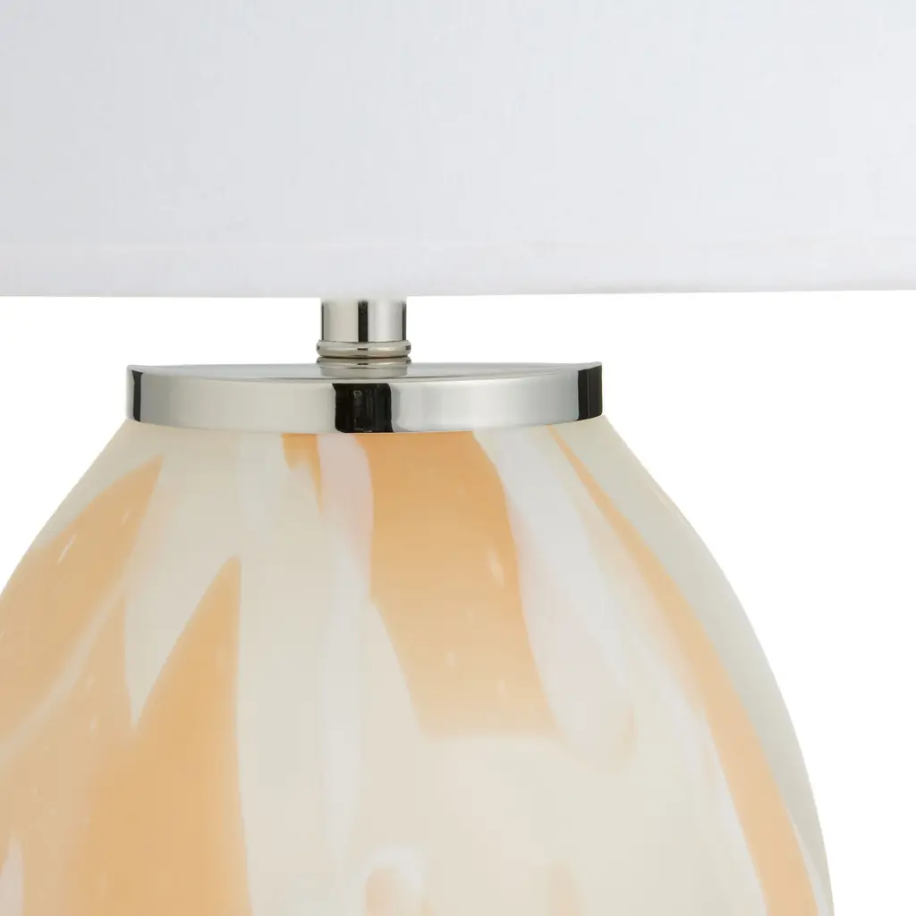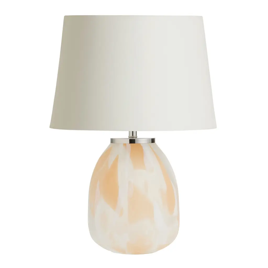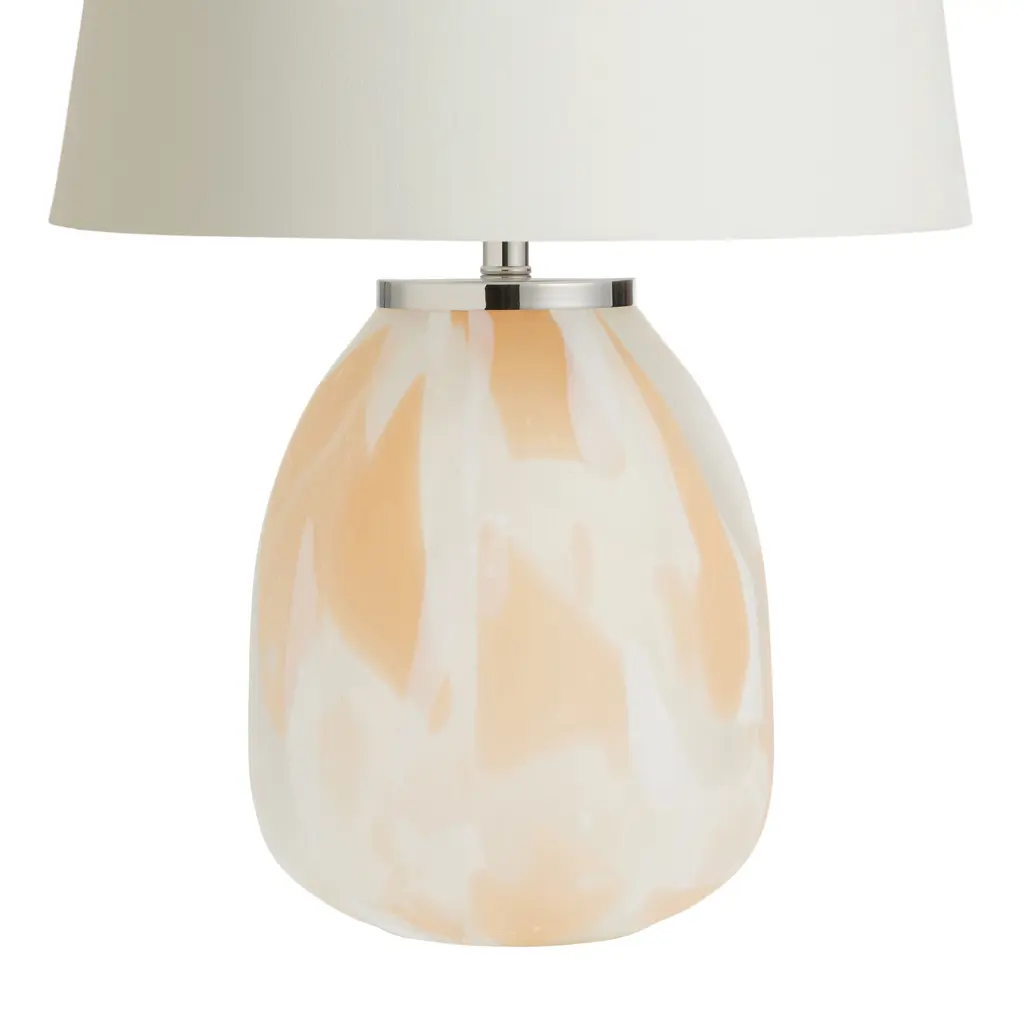 Handcrafted of mouth-blown glass, the Issey table lamp base features swirls of peach and white colors created with specialty artisan techniques. The result is a shapely art-glass showcase with a two-tone beauty that's entirely one of a kind. These creamy peach desk lamps can be placed in symmetrical multiples without looking over-coordinated. Its soft hues warm up the home in any setting and pair beautifully with any of our table lamp shades.