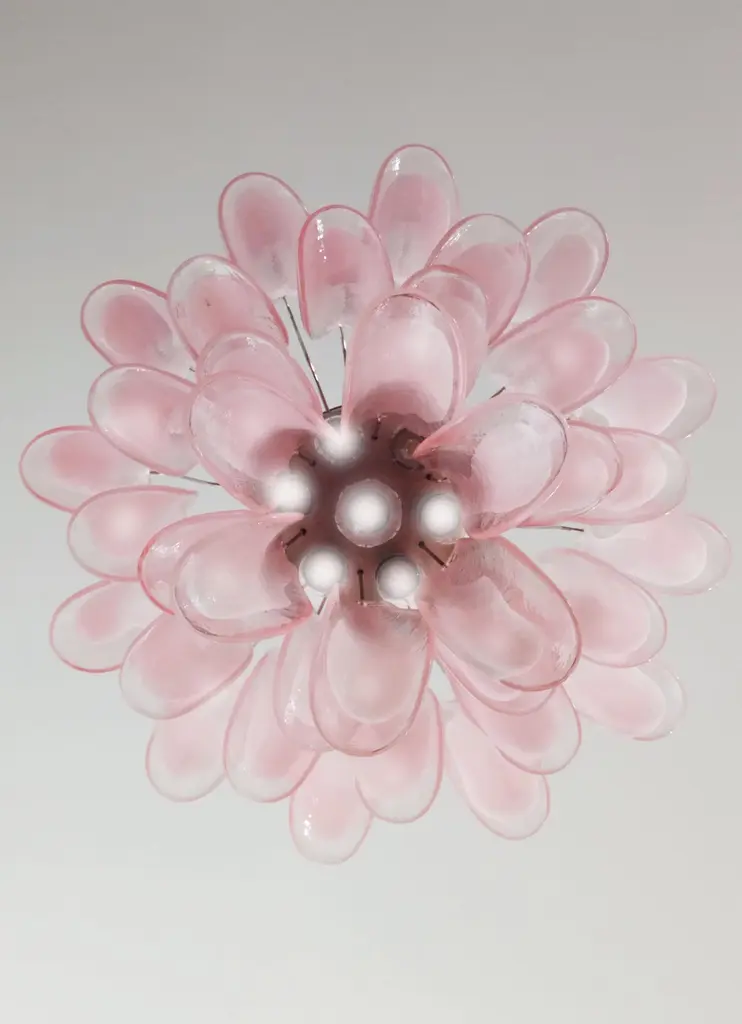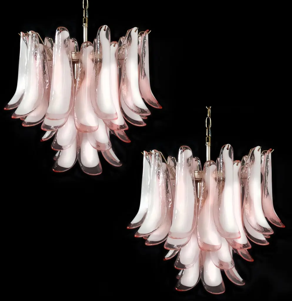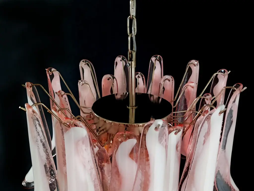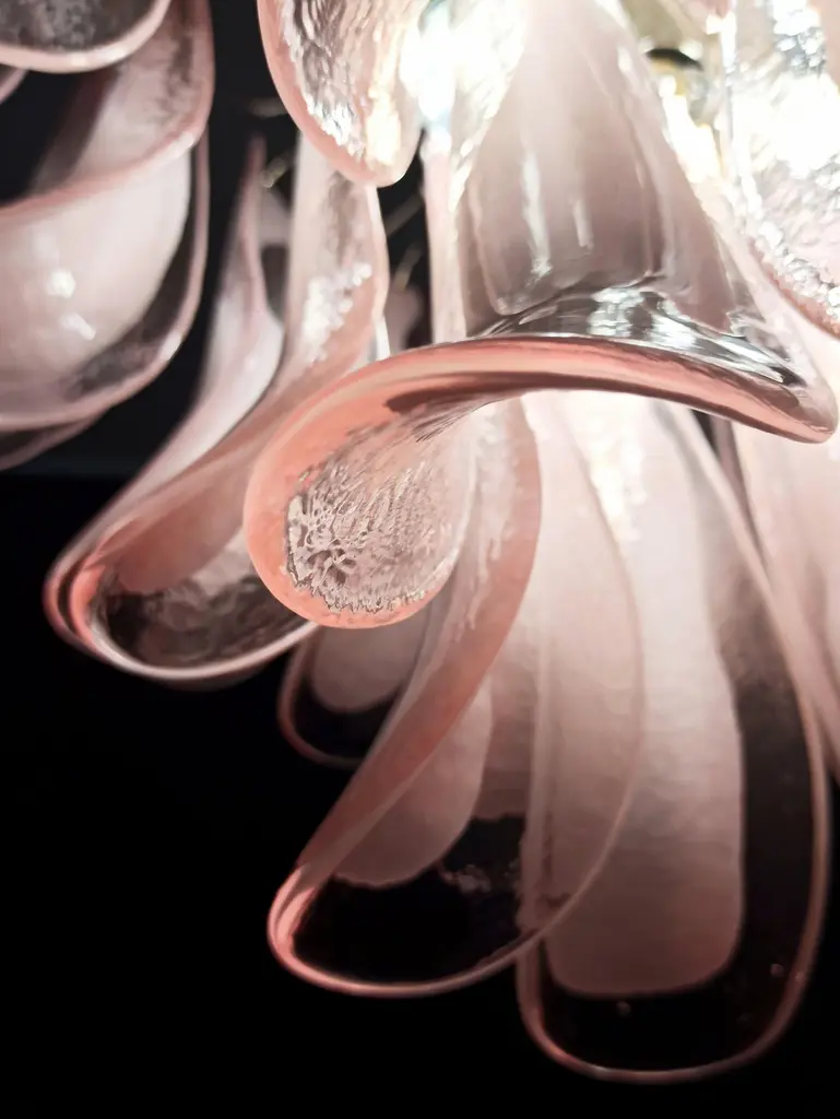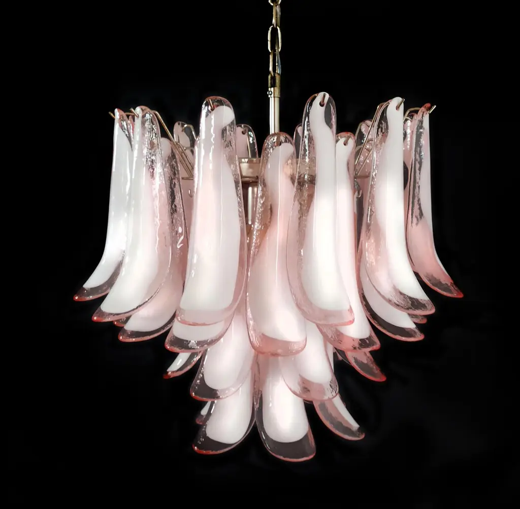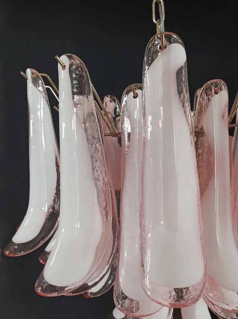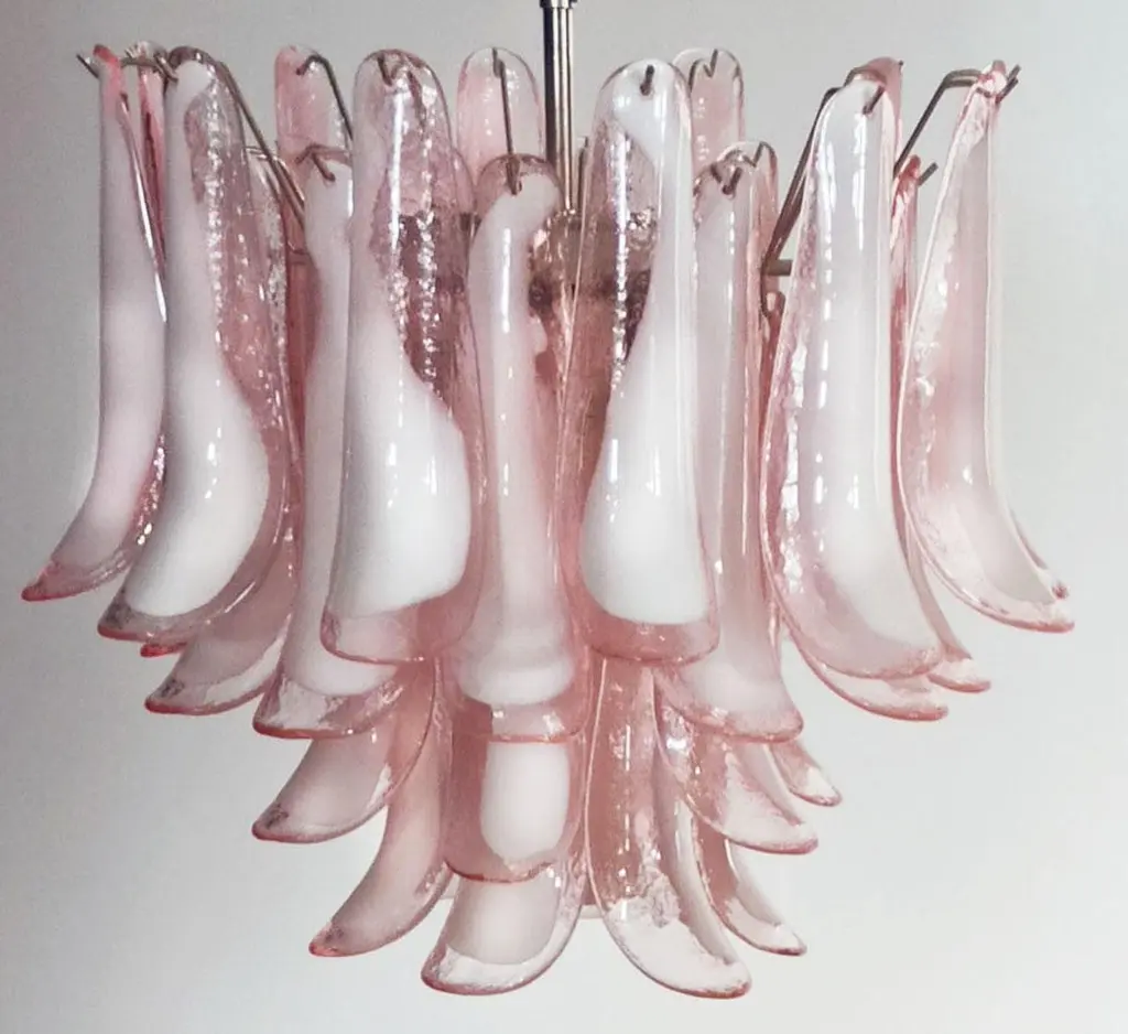 Fantastic chandelier with pink and white “lattimo” glasses, nickel-plated metal frame. It has 36 big monumental petals glass. The glasses are very high quality, the photos do not do the beauty, luster of these glasses.Period:late XX centuryDimensions:47,25 inches (120 cm) height with chain; 21,65 inches (55 cm) height without chain; 23,60 inches (60 cm) diameter.Dimension glasses: 11,40 inches (29 cm) height; 3,15 inches (8 cm) maximum width.Light bulbs: 7 light bulbs : 27 dimension (not included in the sale) - - On request we can replace the lampholders with those suitable for the American electrical system.Condition: Perfect vintage condition and fully working; the glasses are perfect. The metal structure has been perfectly restored and is therefore in excellent condition. Only small signs of oxidation.