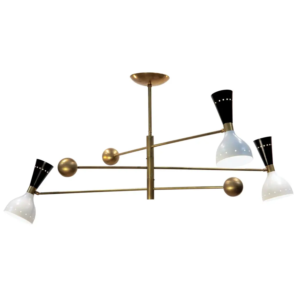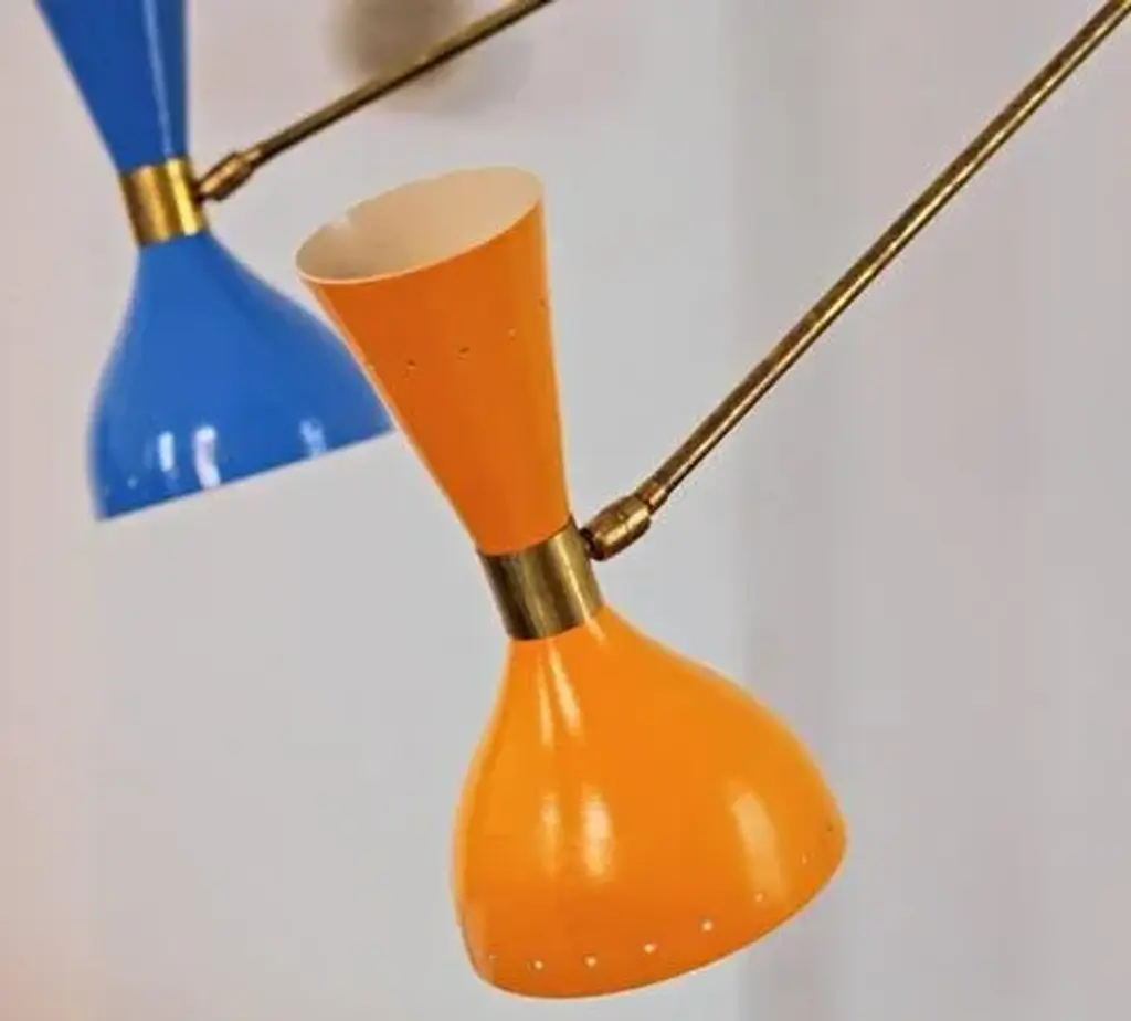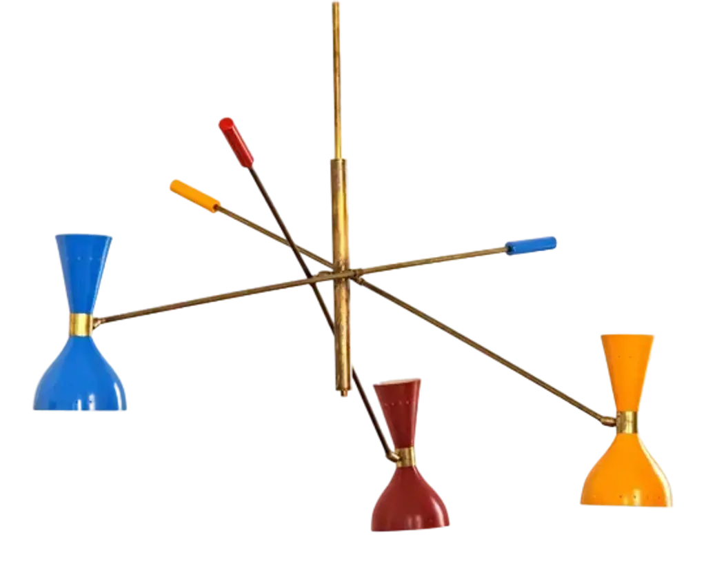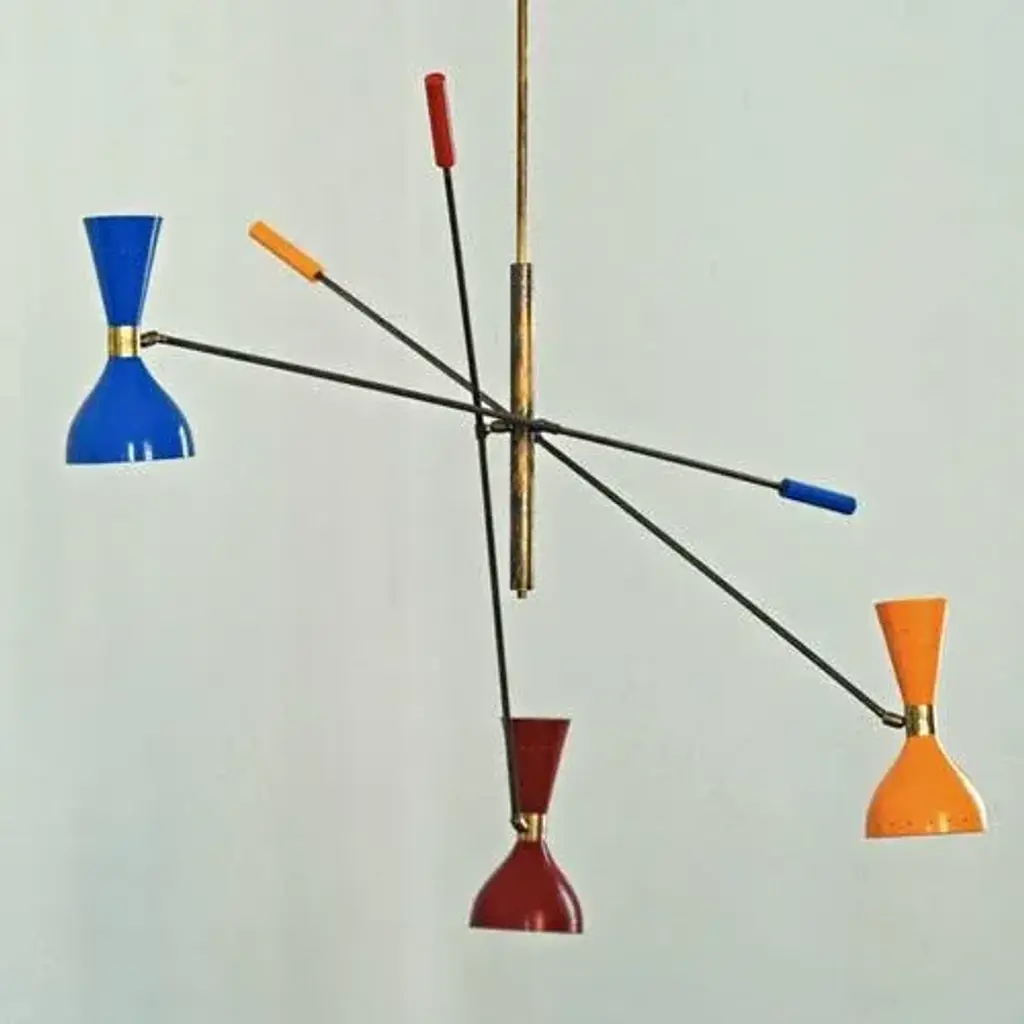 The chandelier draws inspiration from the iconic 1950s light fixtures made by the mid-century modern Italian studios Arteluce and Stilnovo, specifically the Triennale lamp by Angelo Lelii. However, it boasts a unique and distinctive design that adds elegance and sophistication to any home. Crafted by a specialized workshop in mid-century modern design, every detail of this lamp is meticulously considered to match the hard-to-find lamps from the 1950s. The arms and body are made of natural solid brass and hand-painted to perfection. Each arm has a counterweight in the same color as the opposite shade. The lampshades are made of spun aluminum with small holes, and each one is 11 in. (27.5 cm), with two bulbs, a candelabra socket on the smaller upper cone, and a regular socket on the larger lower dome-shaped shade. The shades have adjustable heads so that you can direct the higher lumen output to the desired area while the opposite provides ambient light. They are enameled with the colors of the 1950s palette, with an ivory tone inside. This chandelier is currently only made to order; please contact us for any special size requirements. It is important to note that this fixture should only be installed by someone who is familiar with how the product is constructed and operated. Labeled by Maker, Up to 250V (Europe/UK Standard).