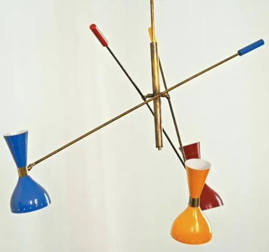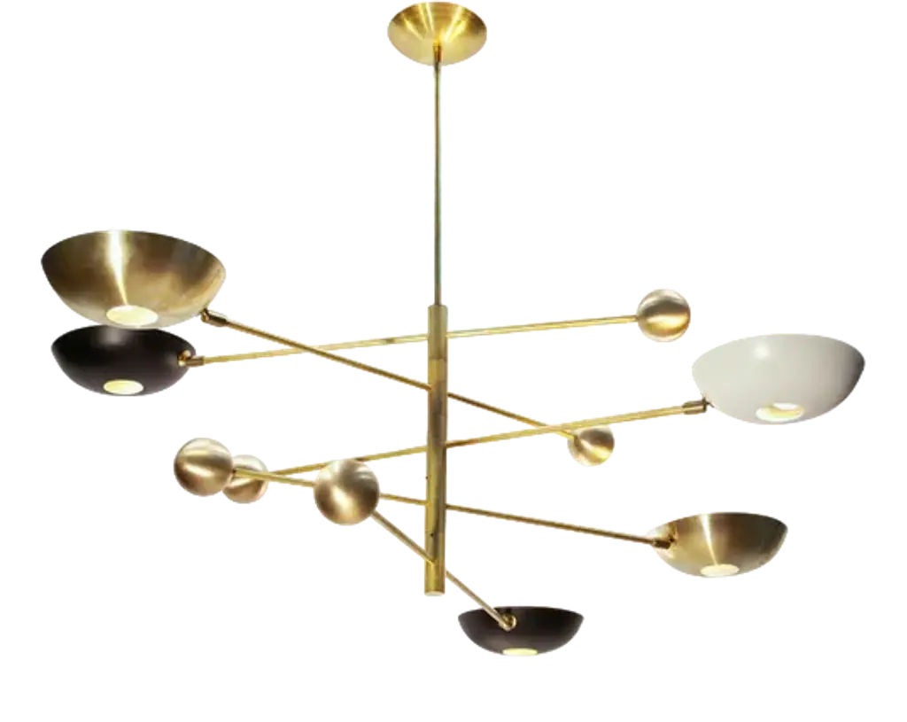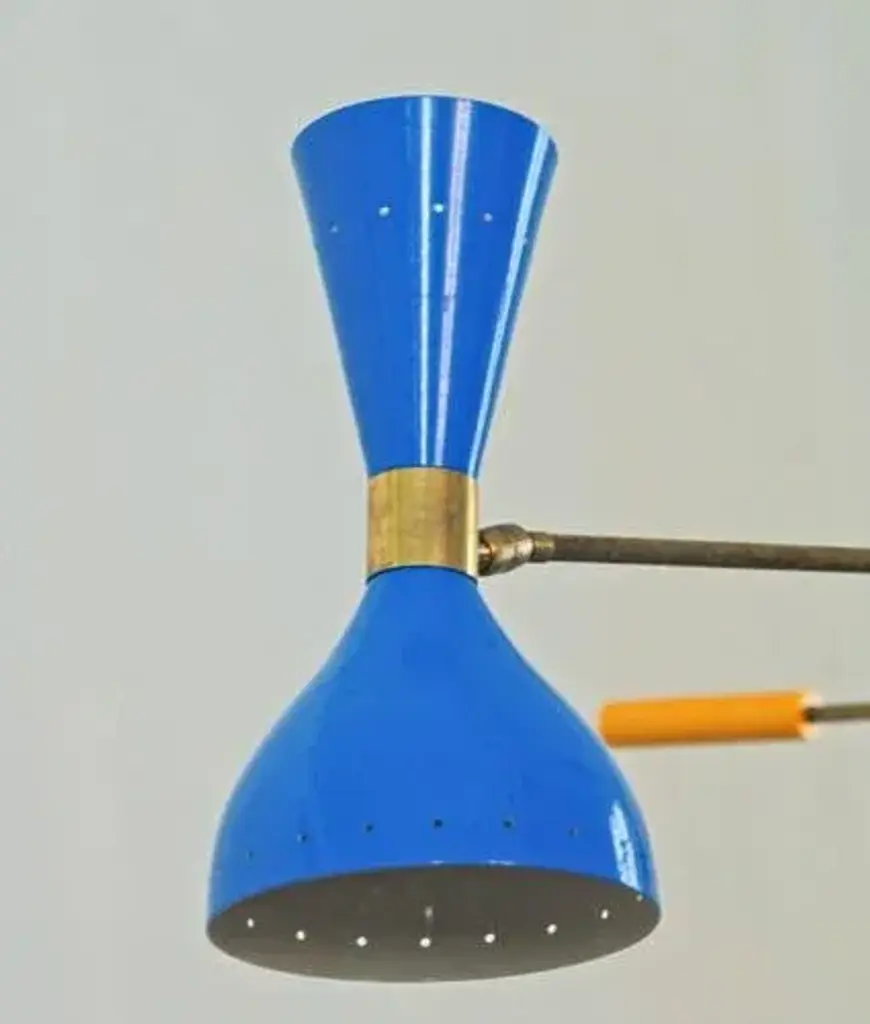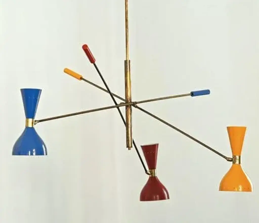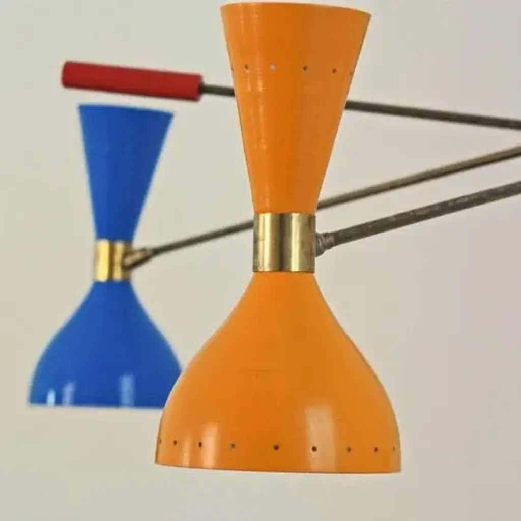 The chandelier draws inspiration from the iconic 1950s light fixtures made by the mid-century modern Italian studios Arteluce and Stilnovo, specifically the Triennale lamp by Angelo Lelii. However, it boasts a unique and distinctive design that adds elegance and sophistication to any home. Crafted by a specialized workshop in mid-century modern design, every detail of this lamp is meticulously considered to match the hard-to-find lamps from the 1950s. The arms and body are made of natural solid brass and hand-painted to perfection. Each arm has a counterweight in the same color as the opposite shade. The lampshades are made of spun aluminum with small holes, and each one is 11 in. (27.5 cm), with two bulbs, a candelabra socket on the smaller upper cone, and a regular socket on the larger lower dome-shaped shade. The shades have adjustable heads so that you can direct the higher lumen output to the desired area while the opposite provides ambient light. They are enameled with the colors of the 1950s palette, with an ivory tone inside. This chandelier is currently only made to order; please contact us for any special size requirements. It is important to note that this fixture should only be installed by someone who is familiar with how the product is constructed and operated. Labeled by Maker, Up to 250V (Europe/UK Standard).