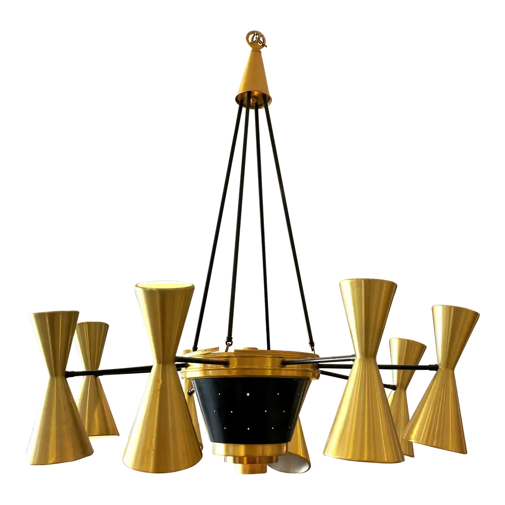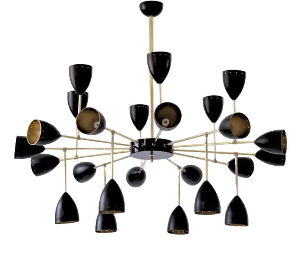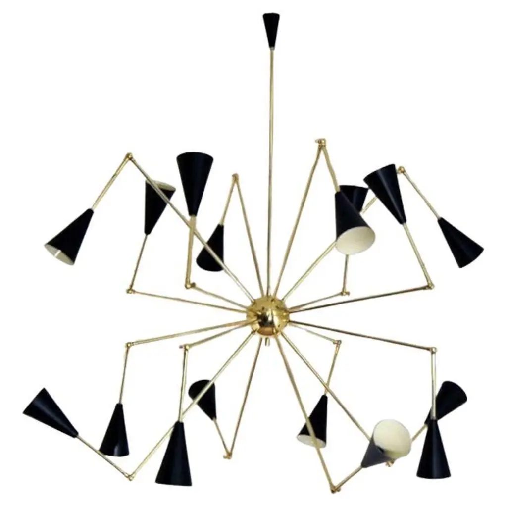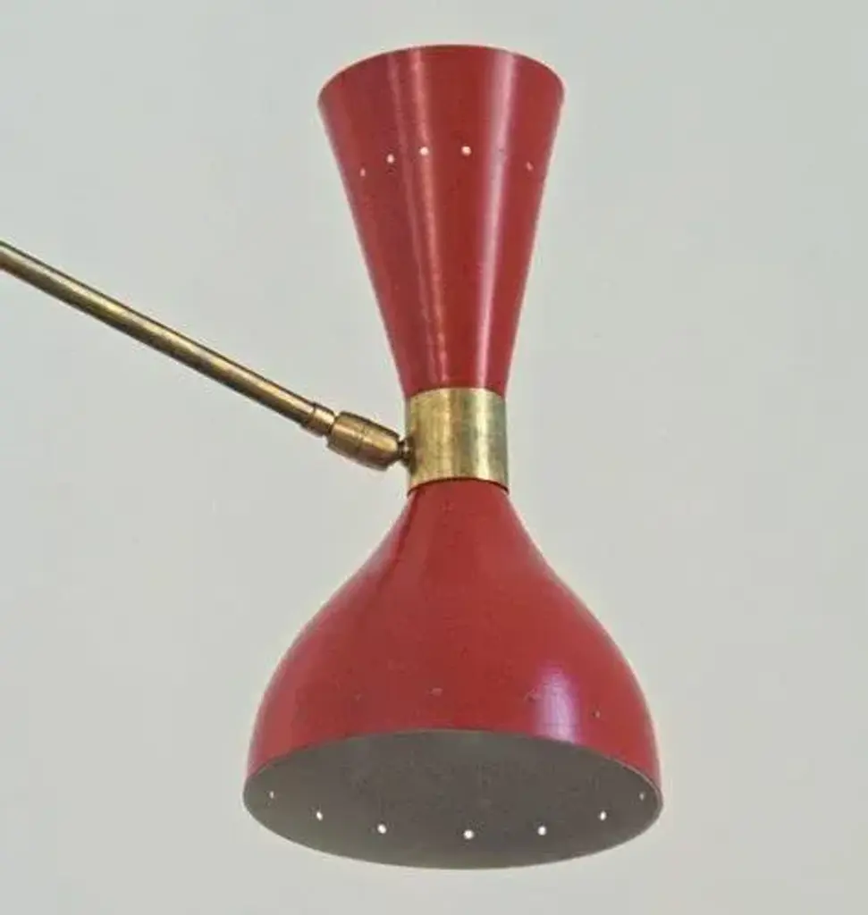 The chandelier draws inspiration from the iconic 1950s light fixtures made by the mid-century modern Italian studios Arteluce and Stilnovo, specifically the Triennale lamp by Angelo Lelii. However, it boasts a unique and distinctive design that adds elegance and sophistication to any home. Crafted by a specialized workshop in mid-century modern design, every detail of this lamp is meticulously considered to match the hard-to-find lamps from the 1950s. The arms and body are made of natural solid brass and hand-painted to perfection. Each arm has a counterweight in the same color as the opposite shade. The lampshades are made of spun aluminum with small holes, and each one is 11 in. (27.5 cm), with two bulbs, a candelabra socket on the smaller upper cone, and a regular socket on the larger lower dome-shaped shade. The shades have adjustable heads so that you can direct the higher lumen output to the desired area while the opposite provides ambient light. They are enameled with the colors of the 1950s palette, with an ivory tone inside. This chandelier is currently only made to order; please contact us for any special size requirements. It is important to note that this fixture should only be installed by someone who is familiar with how the product is constructed and operated. Labeled by Maker, Up to 250V (Europe/UK Standard).