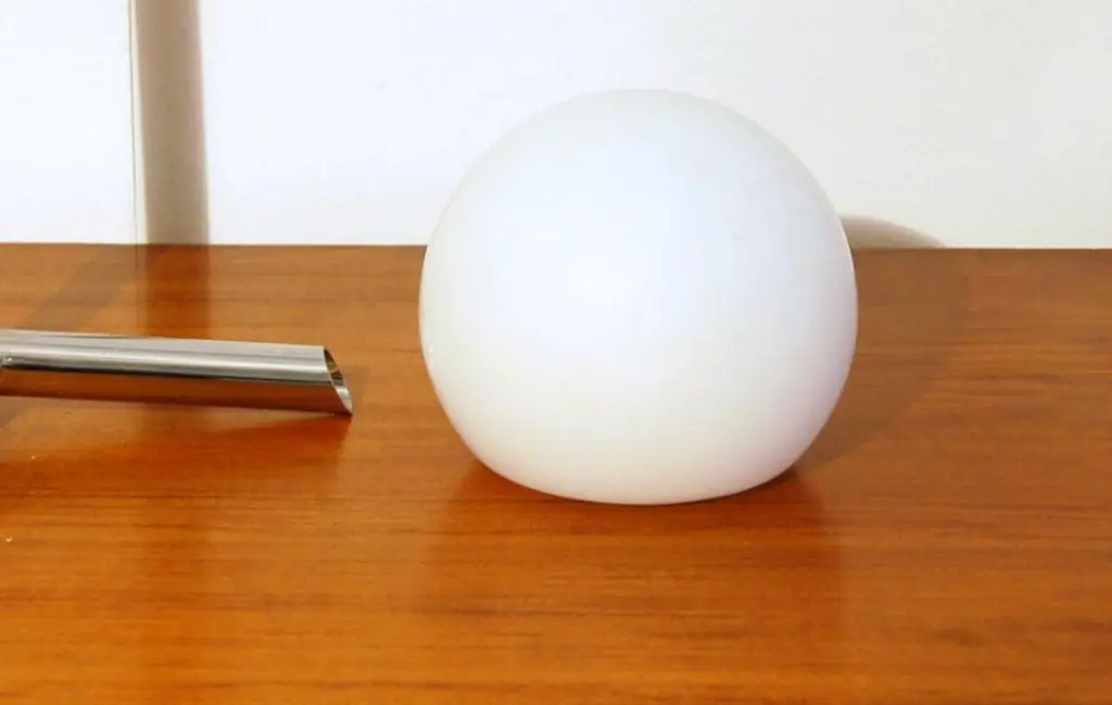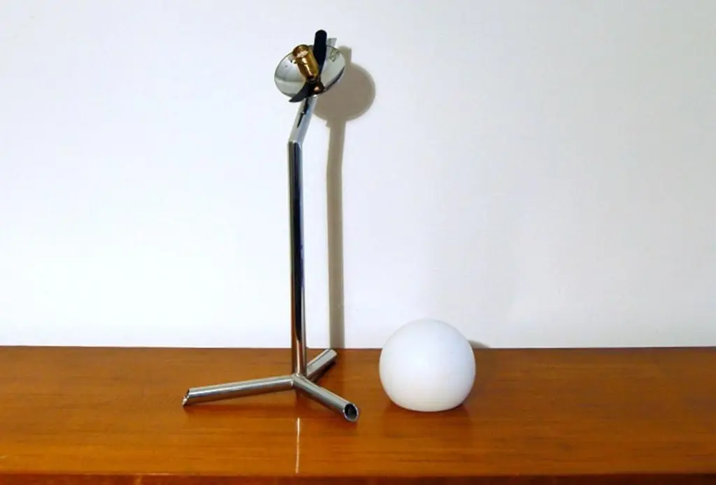 Mid-century style Italian table lamp with frosted opaline white glass globe mounted on solid brass frame in chrome finish / Made in ItalyHeight: 22.5 inches / diameter: 14 inches1 light / E12 or E14 type / max 40WOrder only / This item ships from ItalyOrder reference #: FABIOLTD L175