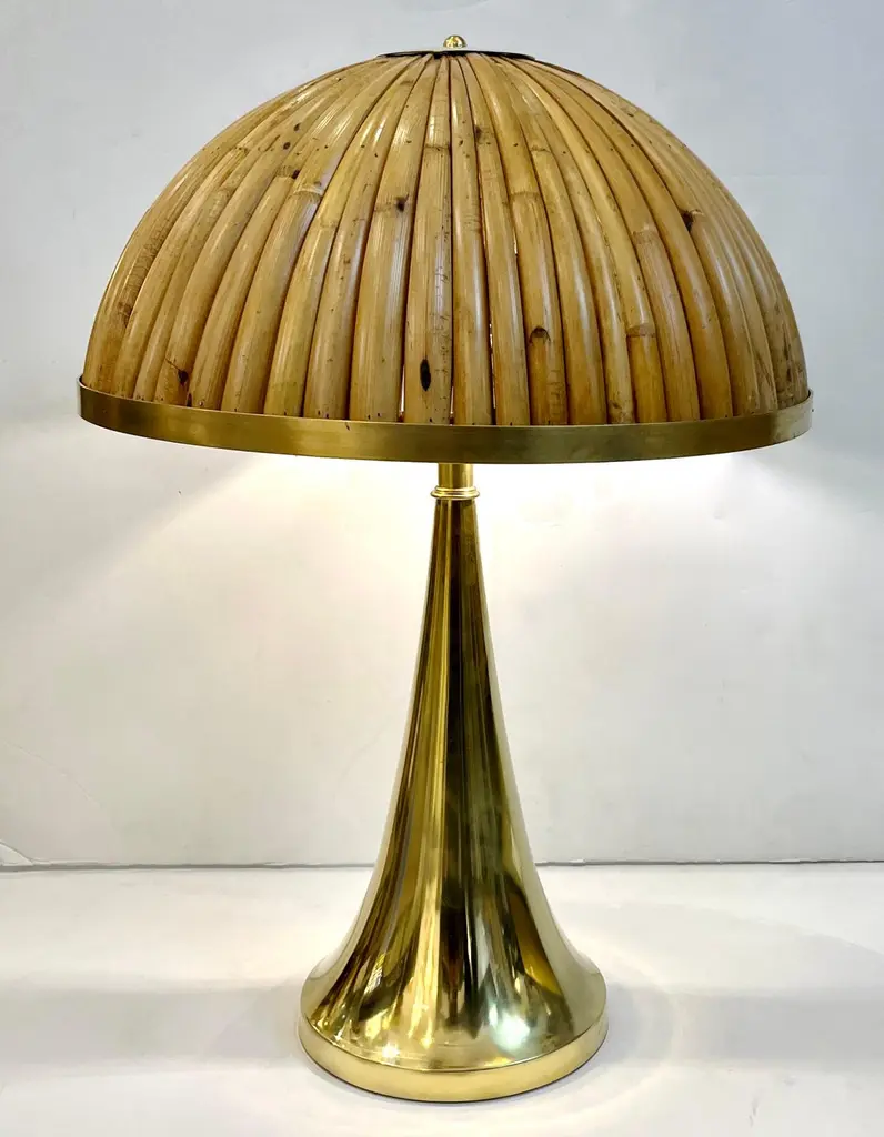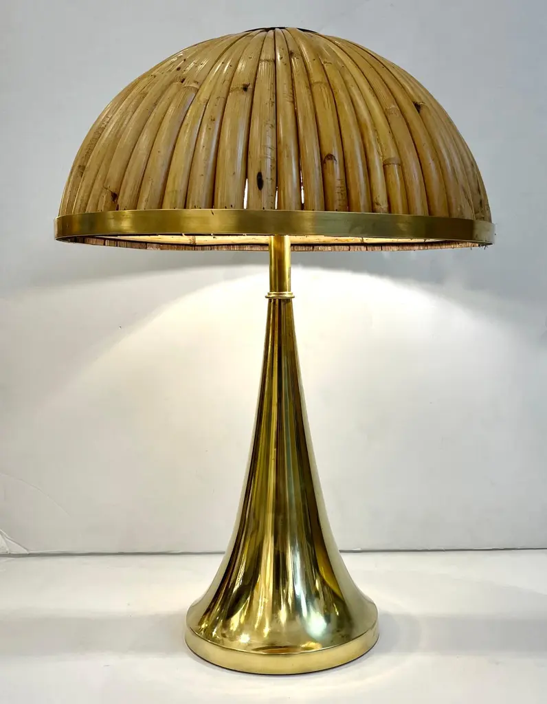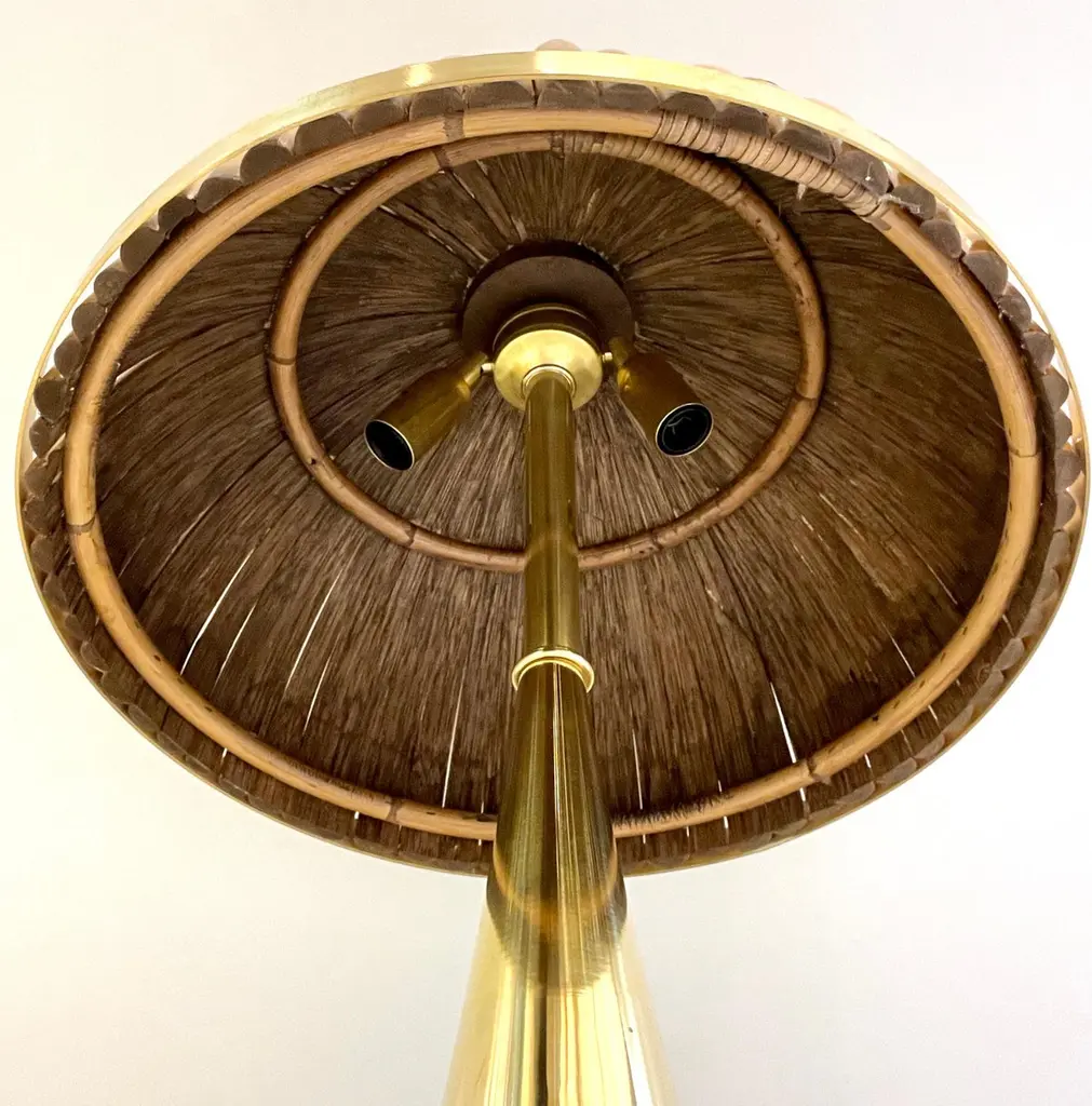 Italian Organic Modern Contemporary Pair Tall Brass & Rattan Sleek Table Lamps
