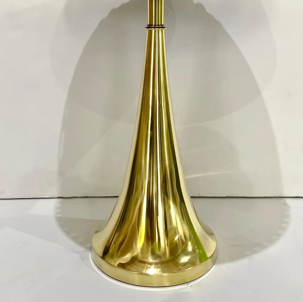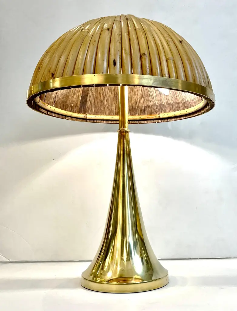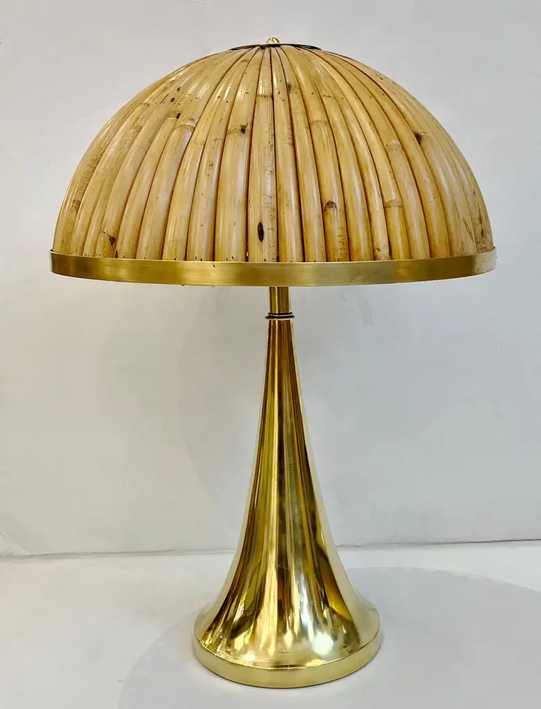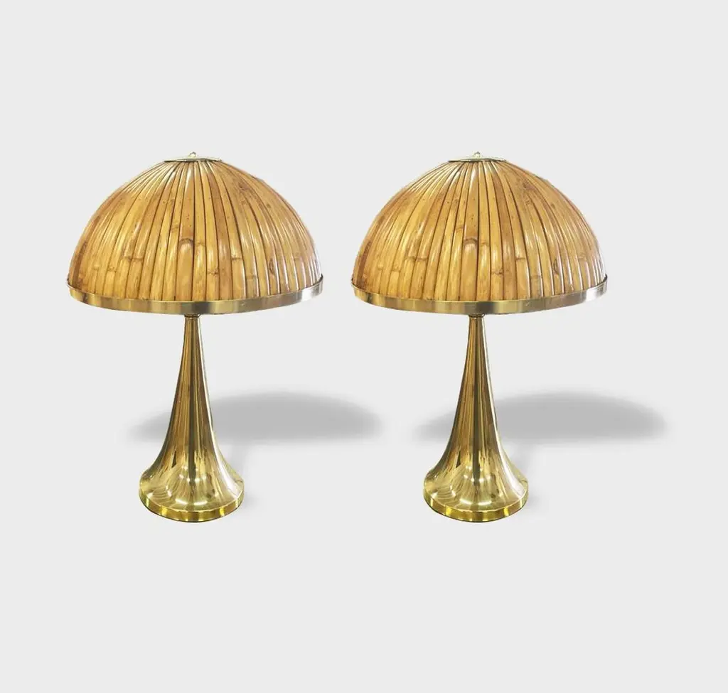 Italian Organic Modern Contemporary Pair Tall Brass & Rattan Sleek Table Lamps
