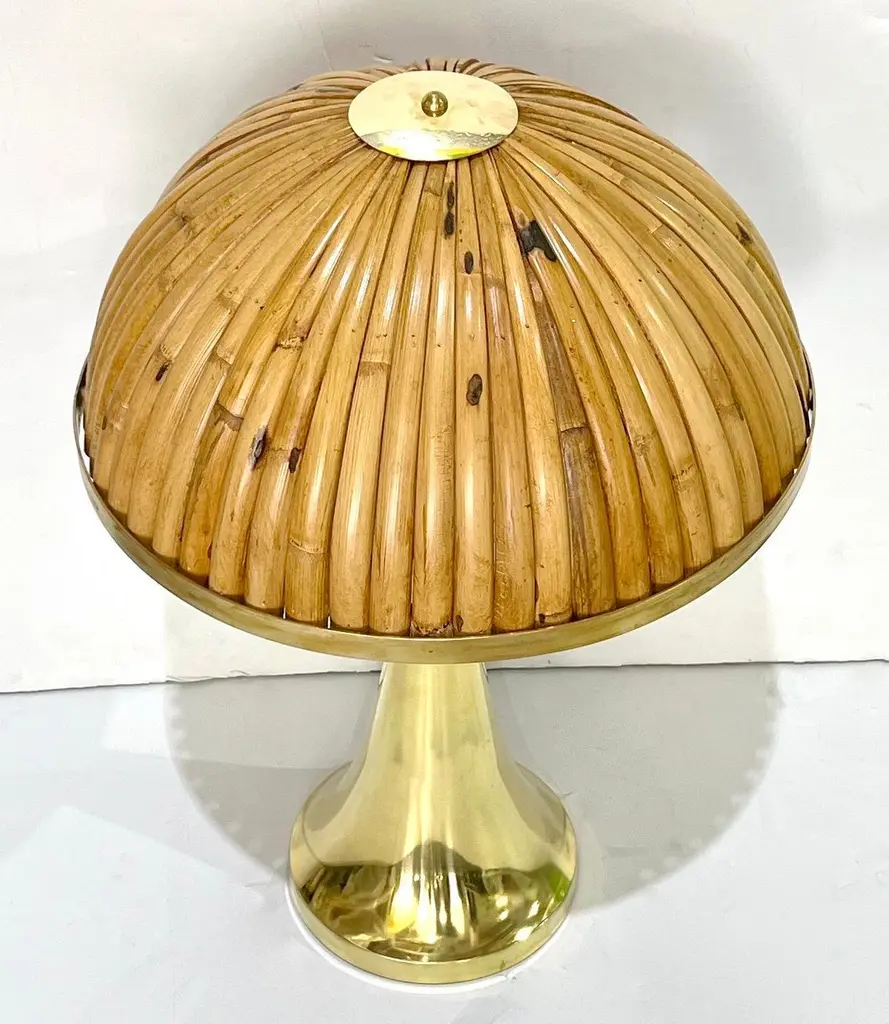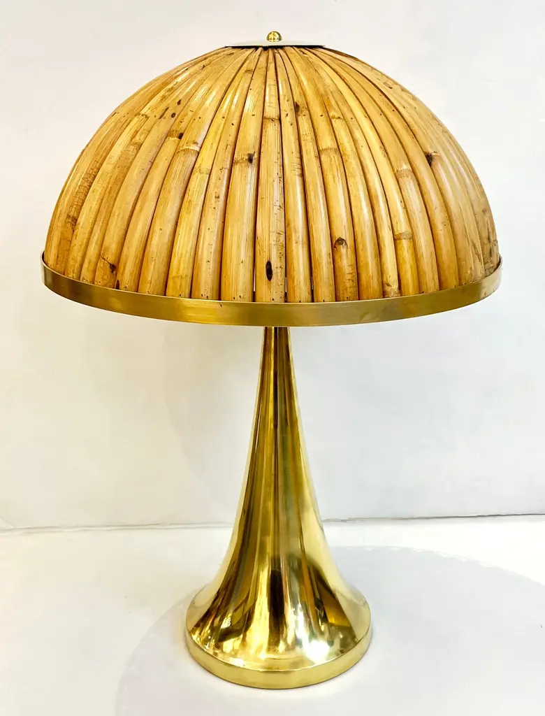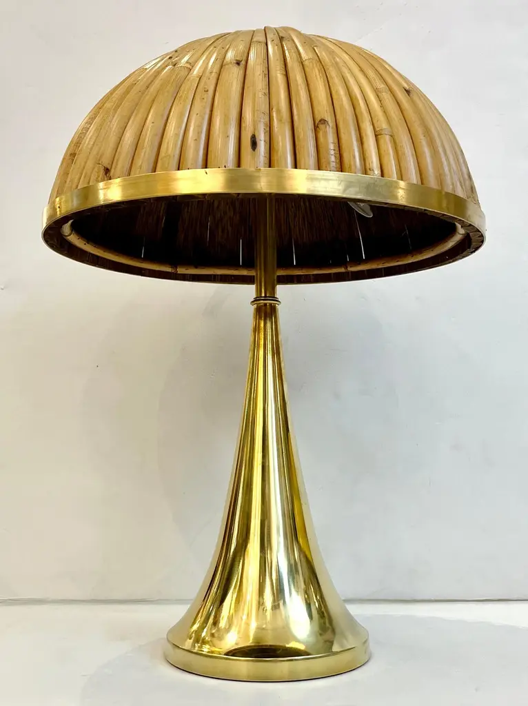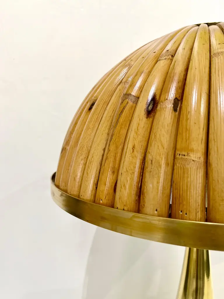 A contemporary organic modern creation, entirely handcrafted in Italy, a pair of sleek organic table lamps, the sensuous luminous brass gold body holding an elegant half moon shade entirely handmade in rattan / bamboo and made special by the edging with a gold brass rim. The tall size makes them ideal as floor lamps as well, or as a decorative accent on the floor of a balcony. Diameter of base: 9 inches. Height of shade: 9.25".These lamps have been chosen to be displayed at the Brooklyn Heights Designer Showhouse in the interior designed by Daria Demin of Circa 22 Design Studio.Can be purchased individually.
