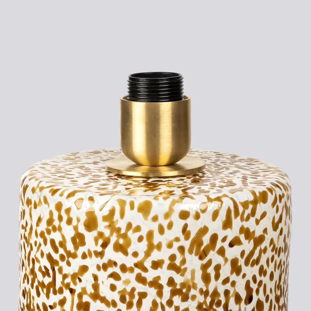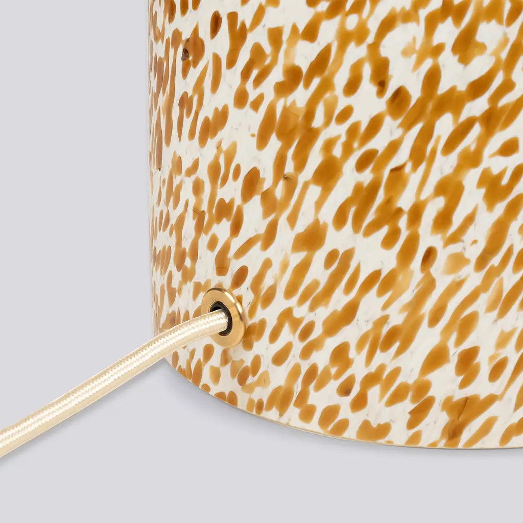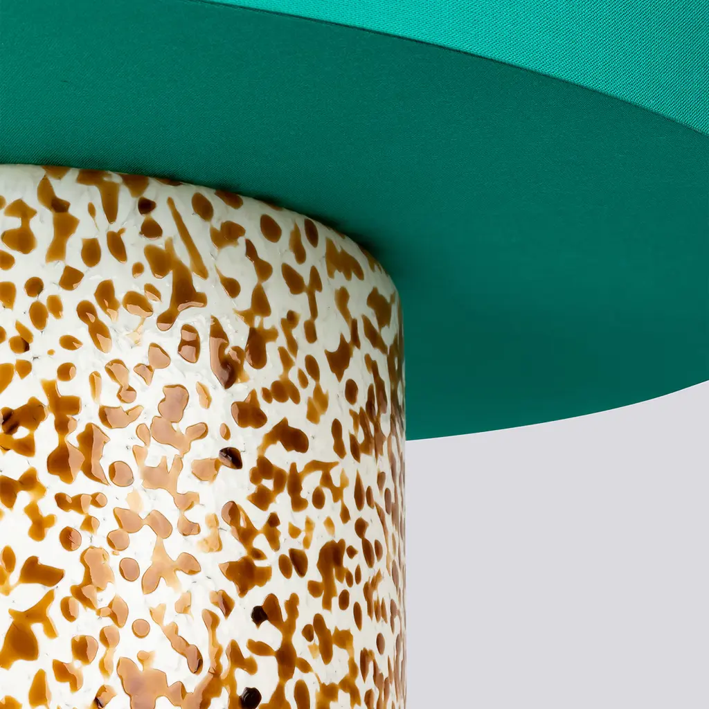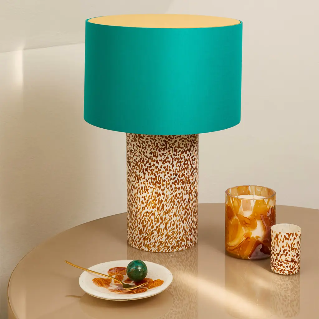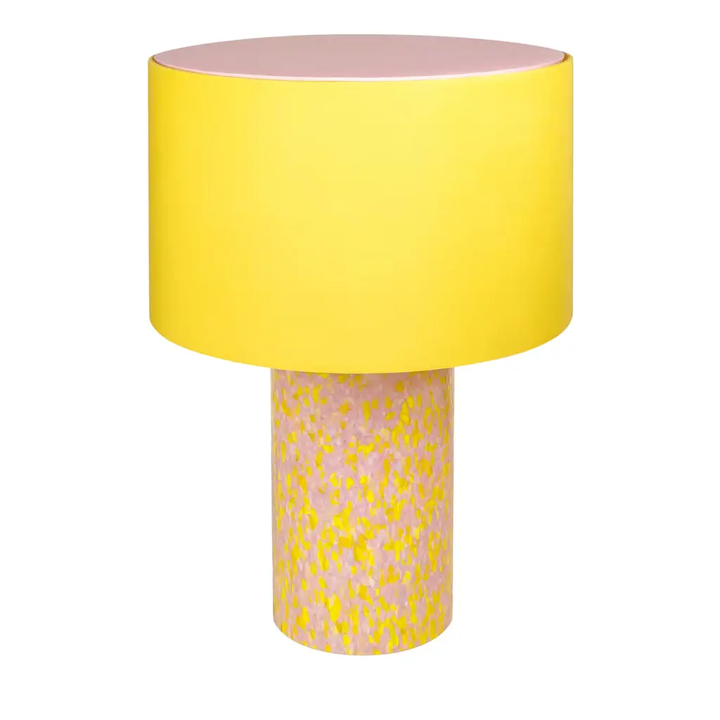 This lamp in Murano glass represents a perfect blend of timeless elegance and contemporary design. The lamp's base, shaped in a classical column style, features the iconic "Macchia su Macchia" technique, renowned for its speckled glossy effect. Each lamp is a unique work of art, with its ever-changing pattern. Paired with a cotton lampshade that includes a removable cover. The brass finishing adds sophistication, while the fabric cord in a neutral hue complements the design.