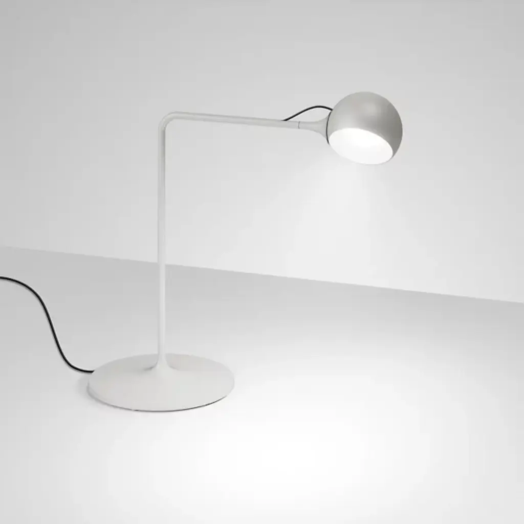 The Ixa LED Table Lamp from Artemide offers a retro, artistic appeal to its surroundings, precision engineered for delivering focused lamping. It is designed by Foster & Partners to echo the organic curves and smooth sculptural style of Alexander Calder’s mobile sculptures, and made in Italy. Starting with a smooth base that acts as a counterweight, it positions a curving, angular arm at its center, sweeping up and over to the efficient LED lamping set inside a large spherical head, all made from strong aluminum. A glass diffuser transforms direct glare into an enchanting ambiance, is easily touch dimmable, and is tailored to be able to respond to different lighting needs, creating something modern and dynamic with precise engineering.