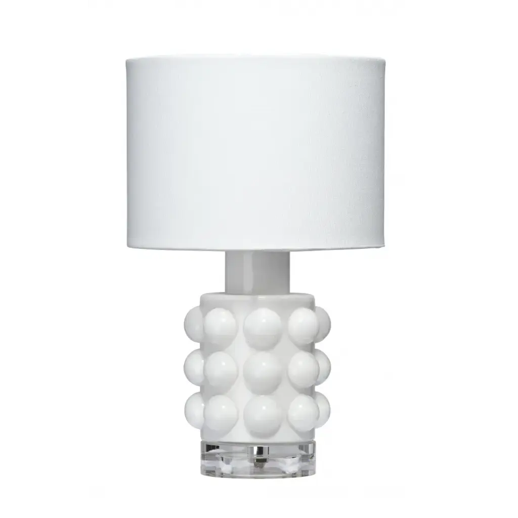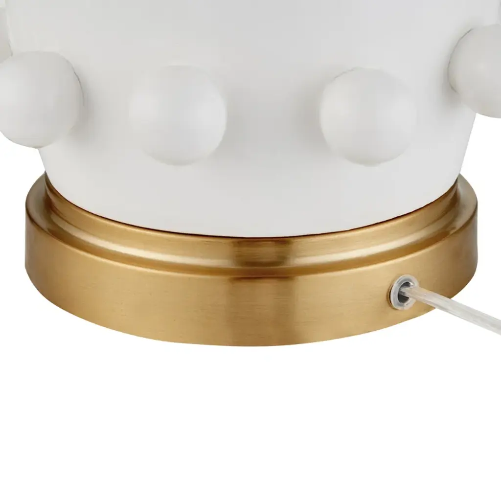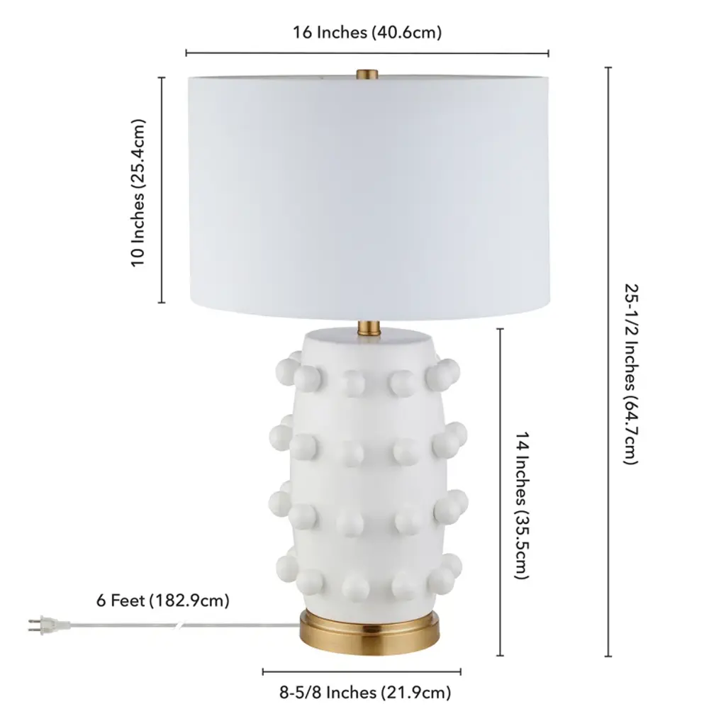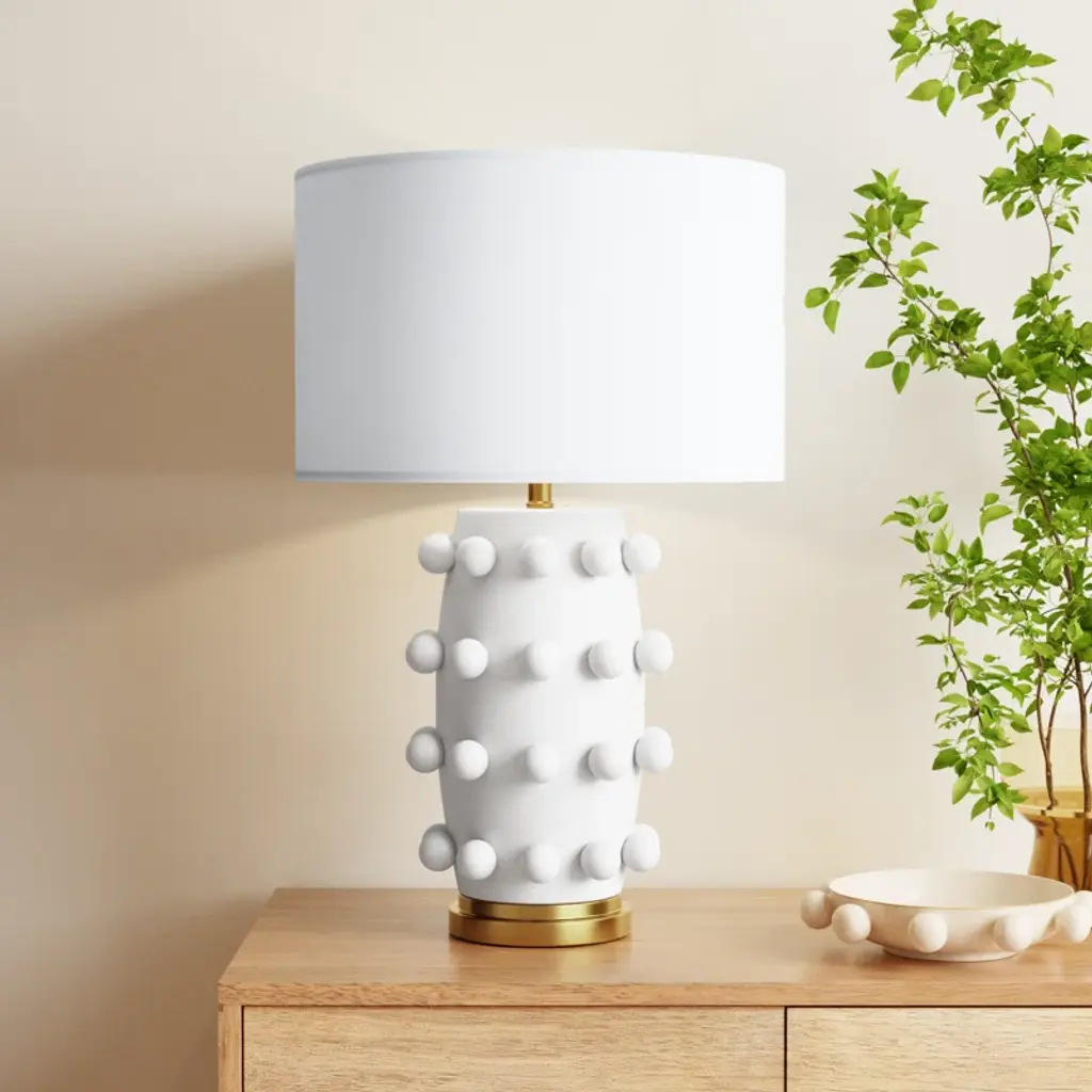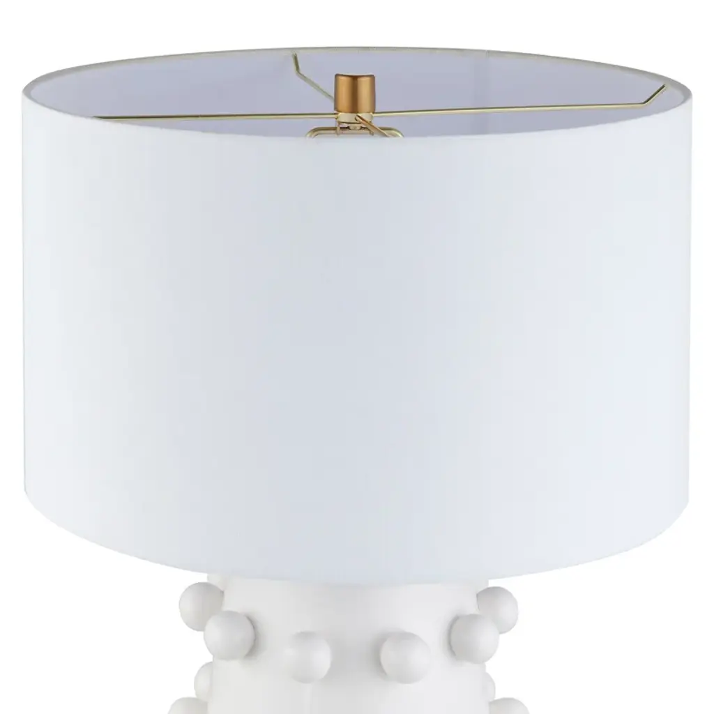 The bold silhouette of this table lamp is sure to become a focal point in your living room, bedroom, or workspace. The gently curved lines of the matte ceramic body are punctuated with spherical orbs, creating a textured, sculptural look. The fixture is finished off with a simple drum shade and a classic ceramic and metal base. Create a striking style moment in any room!