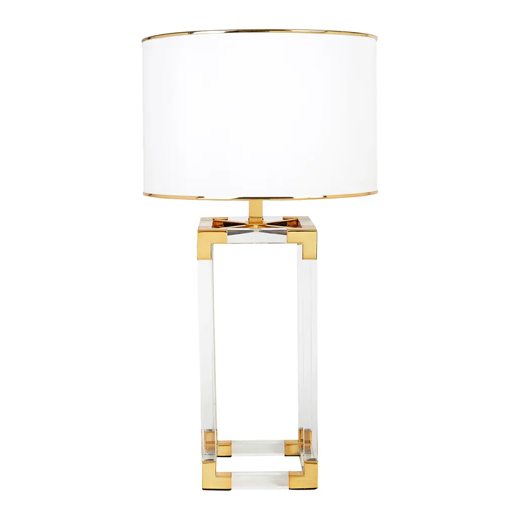 Clearly Cool. Our Jacques Column Table Lamp features crystal clear framework with brushed brass corners topped with a silky white shade trimmed in gold. The perfect blend of simplicity and glamour, modern and traditional, it adds some pop to your penthouse or some uptown swank to your loft. All lighting sales are final.
