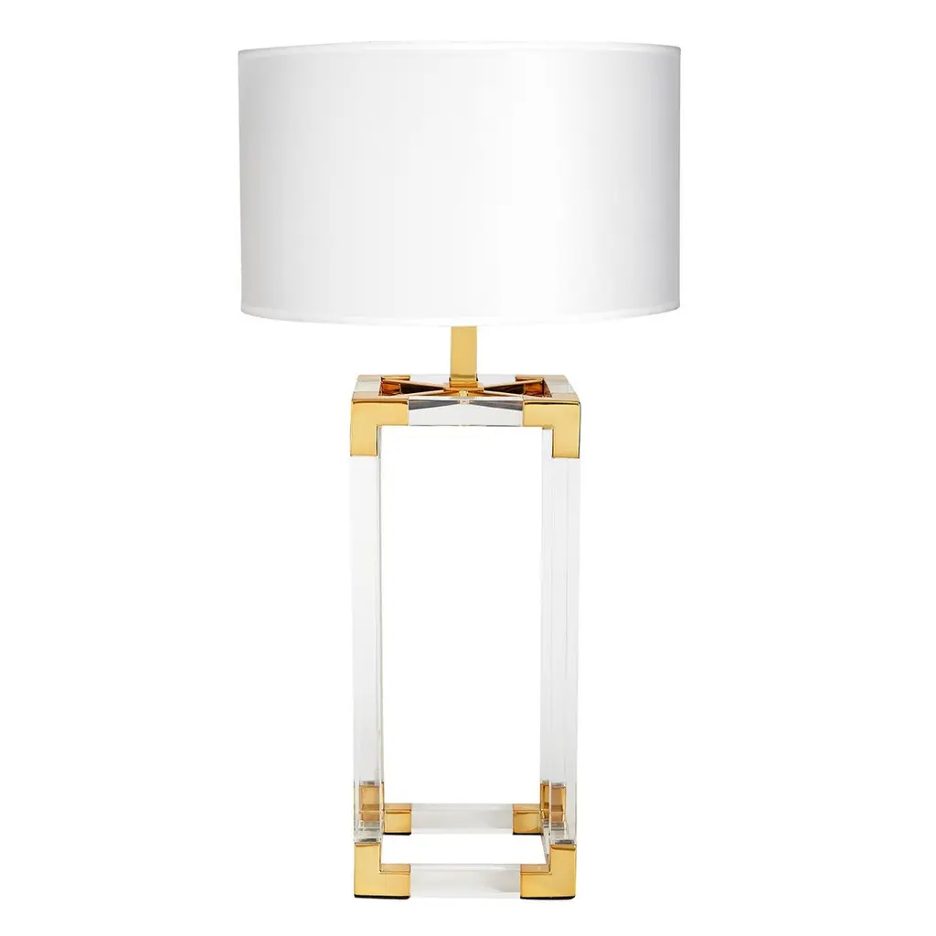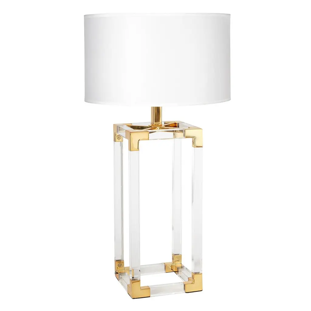 Clearly cool. The perfect blend of simplicity and glamour, modern and traditional. Our Jacques column table lamp features crystal clear acrylic framework with brushed brass corners topped with a silky white shade. Add some pop to your penthouse or some uptown swank to your loft. Big presence, weightlessly transparent.Specs:Shade measures 18 inches diameter, 12 inches tallNo finialRequires one 100 watt max type A bulb (not included)Do not exceed specified wattageAll lighting is wired for use in the United States.