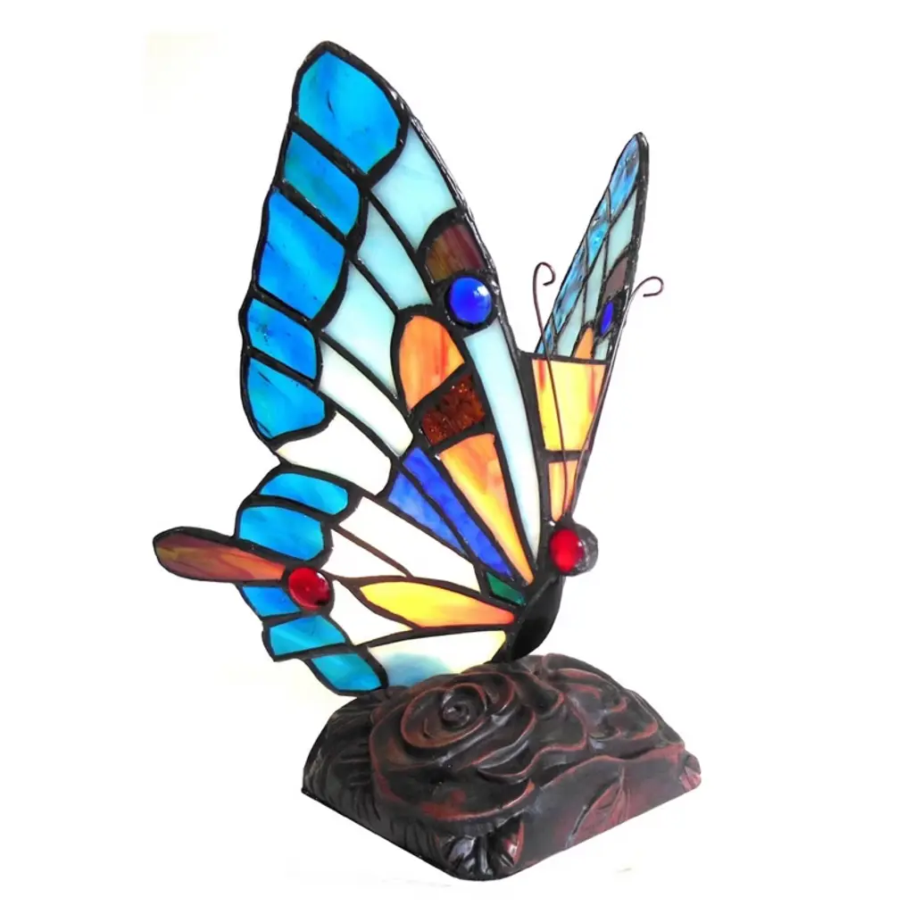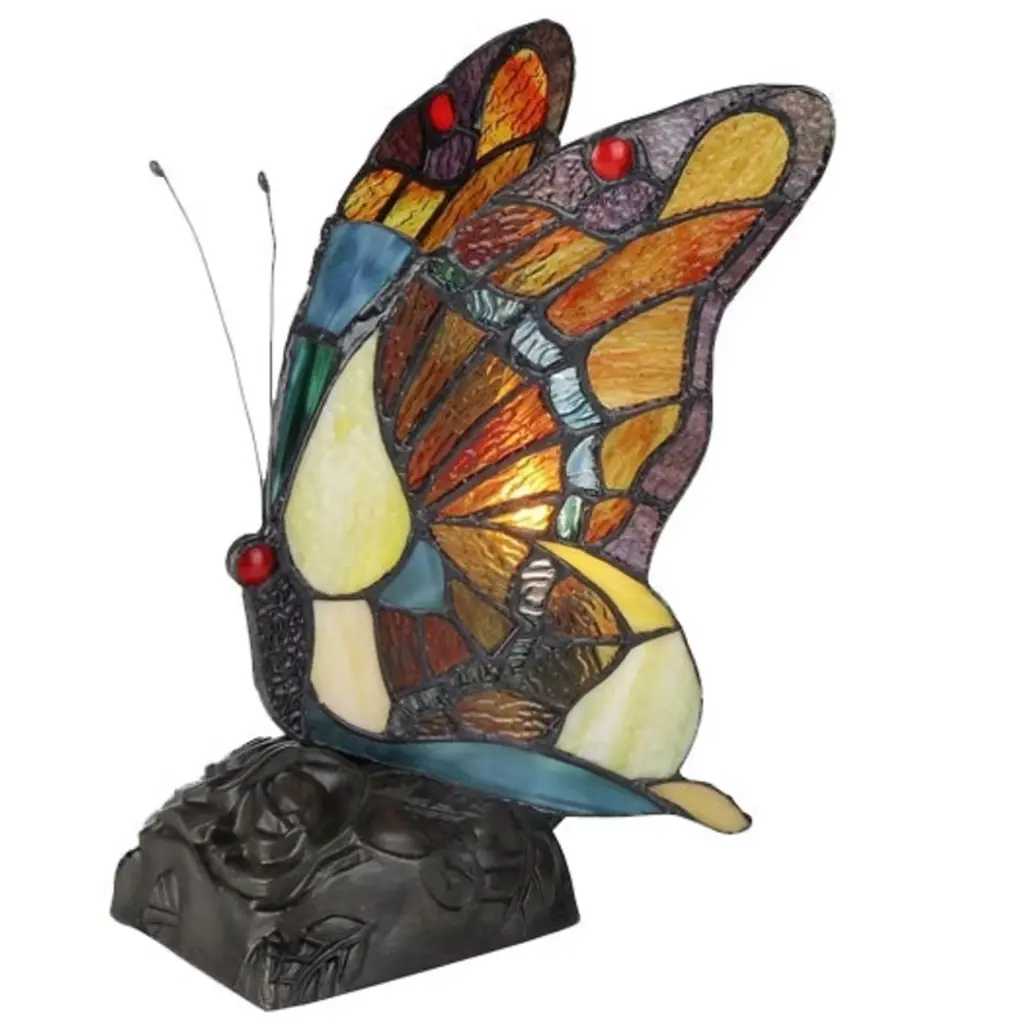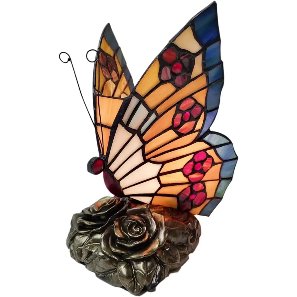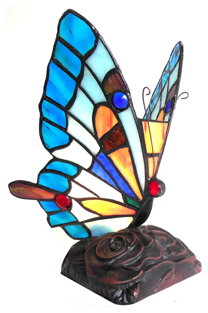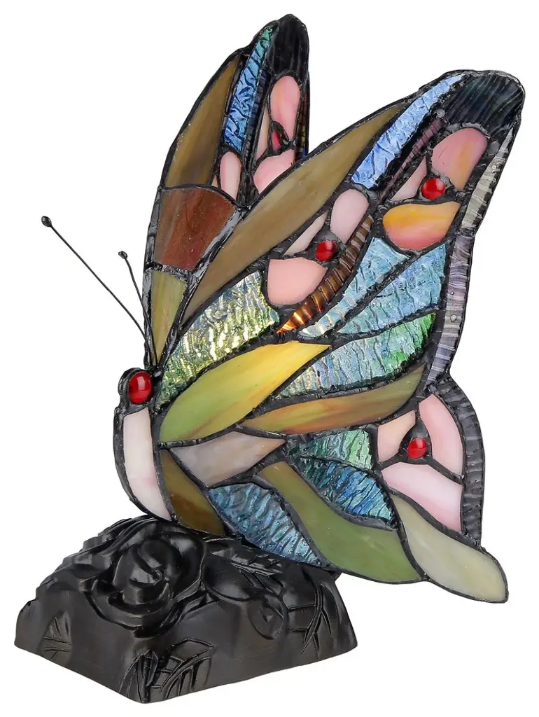 This accent desk lamp showcases the fine workmanship and detail of a butterfly gently perched on a rose. Made of top quality material. Individual cut glass pieces make up the butterfly. A wonderful addition to any room or office.(1) 40 Watt max E12 Type C Bulb (not included)On-cord rotary switch60pcs glass cut, 4 cabochonsIndoor SettingHarmonized code: 940520Since these are hand crafted products, the exact color of glass pieces may vary. Colors of the glass will appear darker and less vibrant when not illuminated. Handmade glass will vary from one piece to the other; glass made at different times will also vary. Light bulbs used in lamps or ambient lighting may affect the appearance of the products. Stained glass product has been protected with mineral oil as part of the finishing process. Please use a soft dry cloth to remove any excess oil.