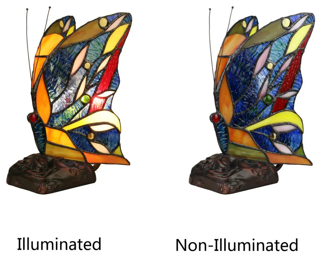 This is a butterfly-design 1-light Tiffany-style table lamp that would be a perfect fit in a bedroom, office, and living room! The shade is hand-crafted, using the same methods developed by Louis Comfort Tiffany in the early 1900s. This process entails using 69 hand-cut stained art glass pieces and 9 glass beads, each wrapped in fine copper foil and soldered together at extremely high temperatures to form each unique piece. The exact size to the nearest inch may vary, and the exact color of each glass piece may vary due to each piece being hand-crafted. The first image is with the light shining through, the second image is with no light. Dry-listed and recommended for an indoor setting.