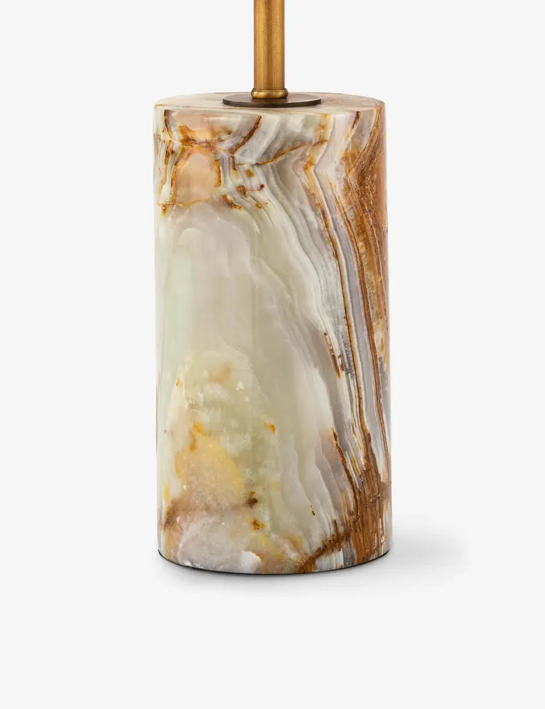 Simply refinedthis table lamp's clean, sculptural silhouette is set for understated impact. The luxe mix of jade and brass offers a polished shine on any tabletop, topped with a white fabric shade for a tailored finish with transitional appeal. The compact size is perfect for layering ambient light into the room or adding a touch of task light to a desk or countertop.